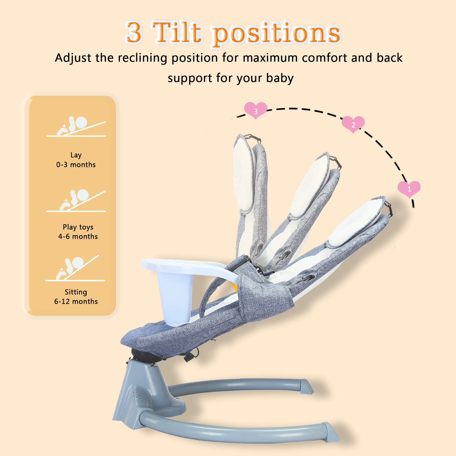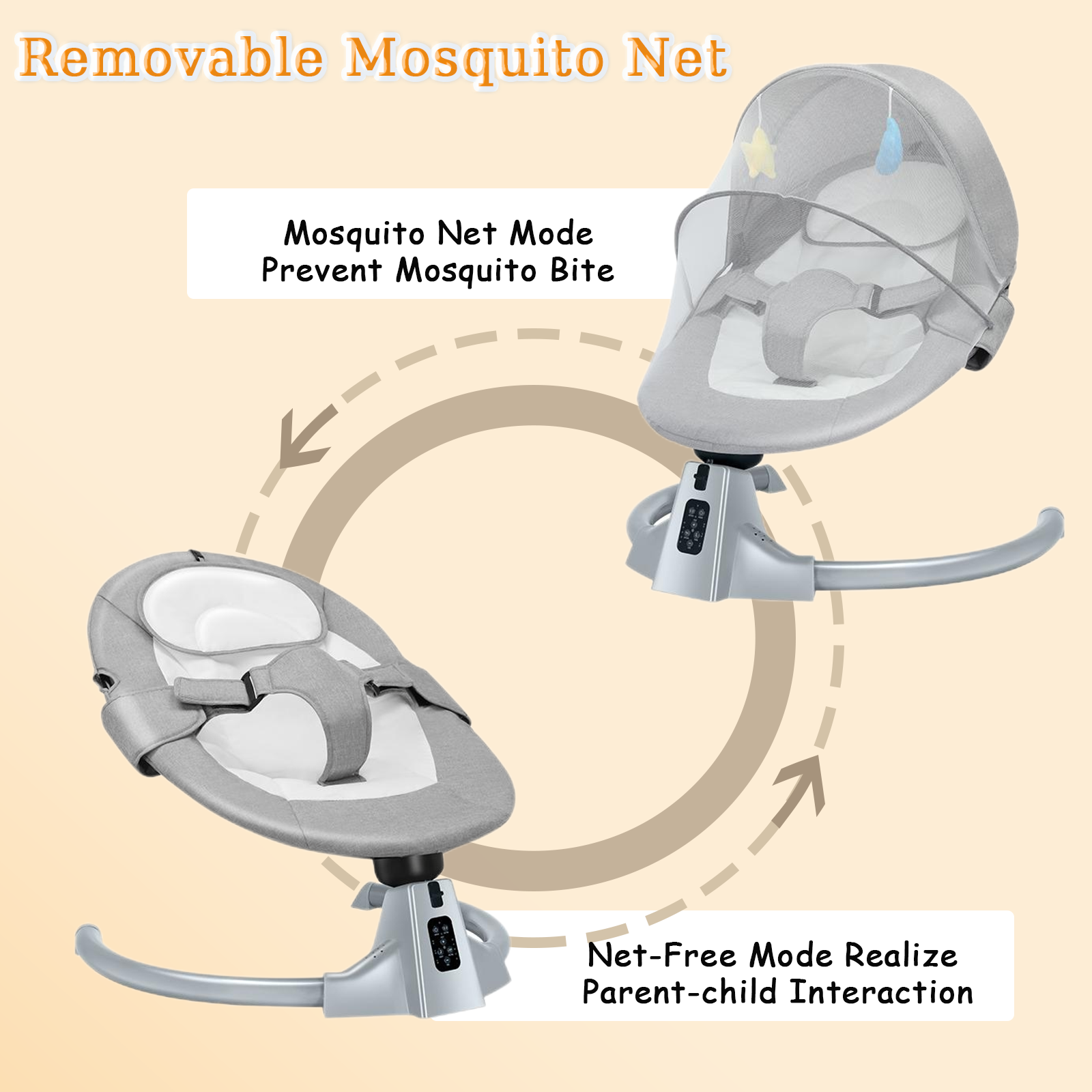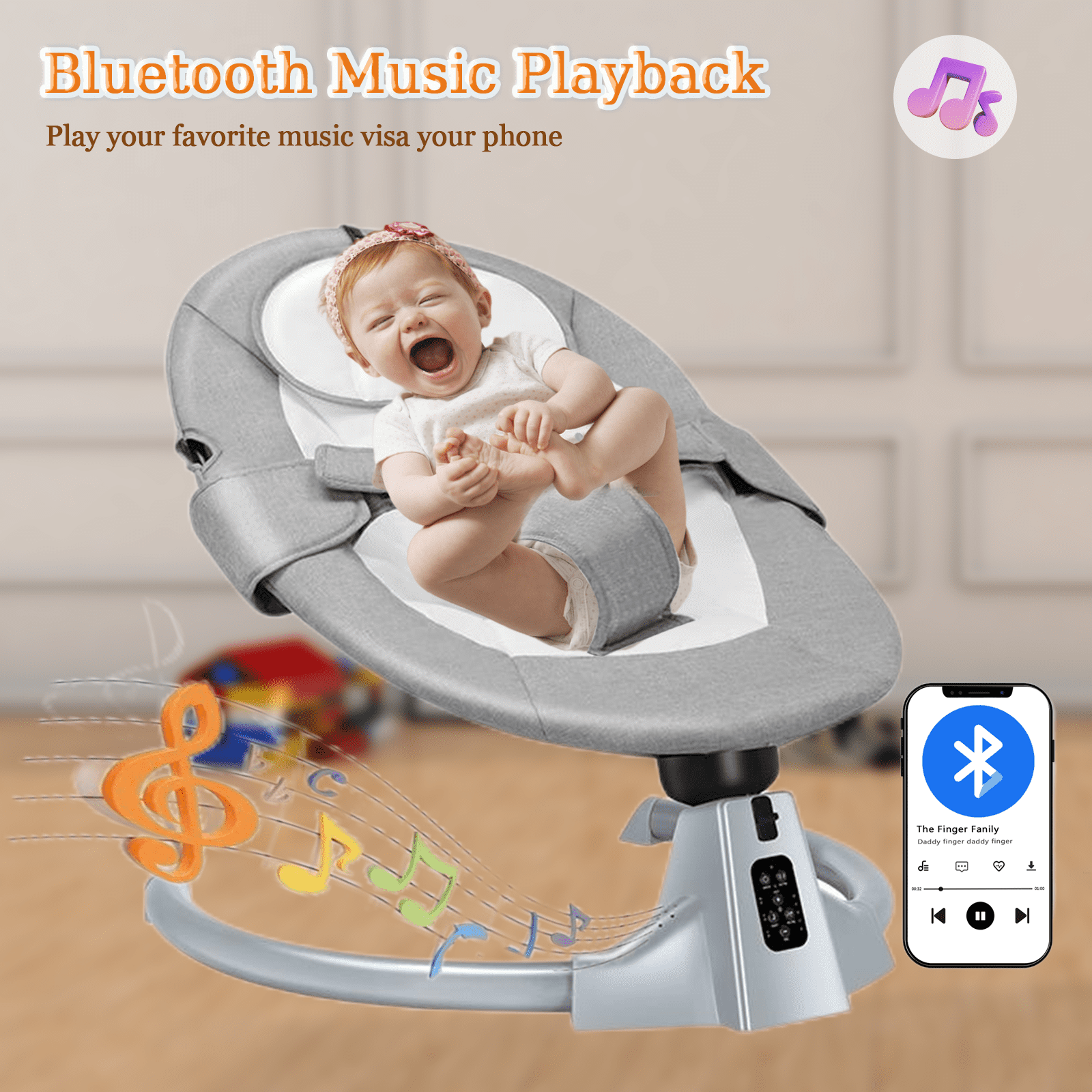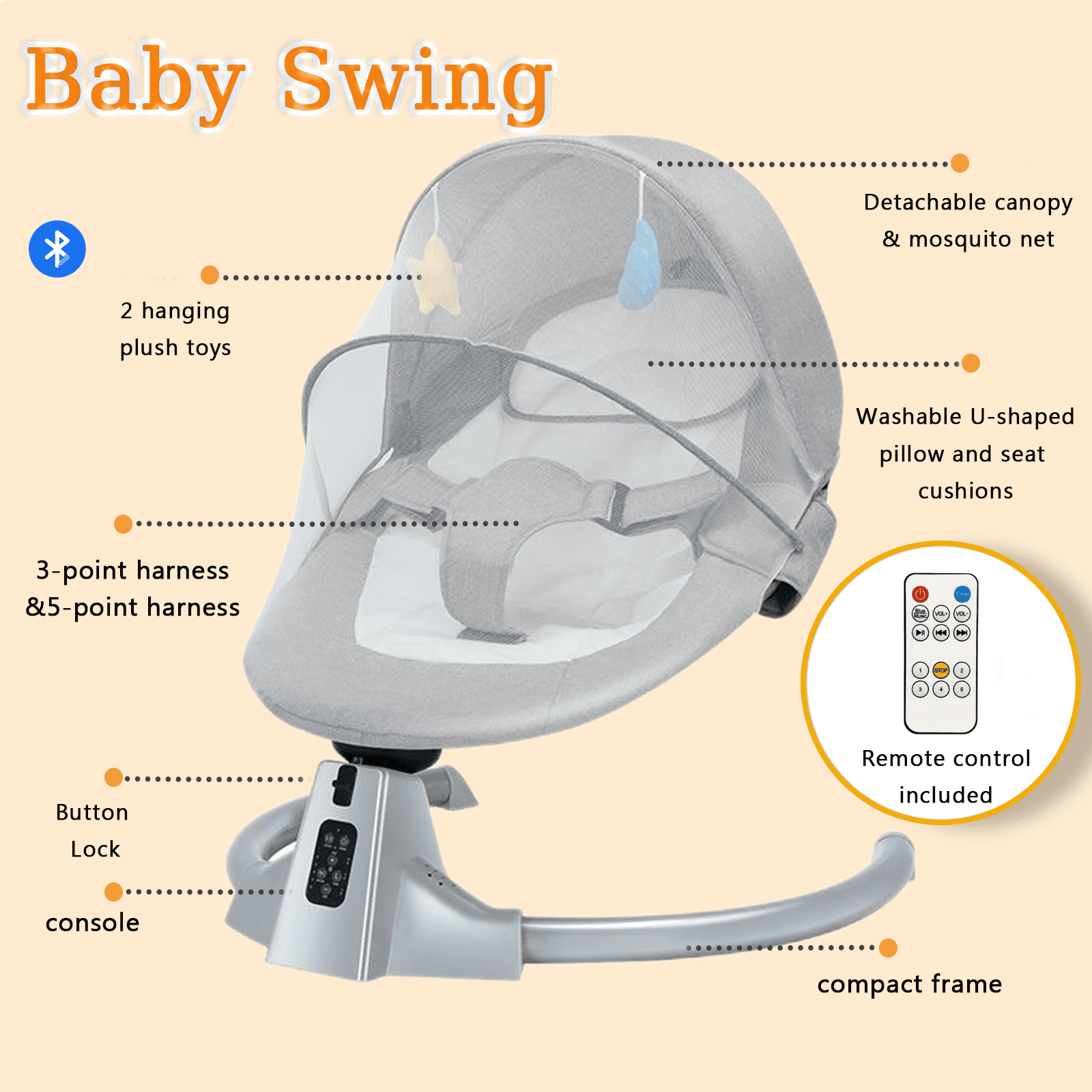 👶【Comforting Embrace】The baby swing for infants has 5 different swing speeds: 18°, 21°, 23°, 25°, 31°. Freely adjust the coaxing intensity to create a comfortable feeling for mothers to pat and coax. The baby swing is equipped with three levels of adjustment: 35°, 50°, 80°. 3 seat positions allow your baby to sit for eating, lie down for resting or recline for playing. Adjust the reclining position for maximum comfort and back support for your baby. 👶【Timing Setting 】 In order to save your time and energy, electric baby swing is equipped with a timer, you can set three swing times (8.15.30 minutes), Set your baby’s soothing time in advance, easy and worry-free. 👶【Safety First】 A 3-point harness and adjustable head support ensure safety and comfort. Breathable cushion is completely removable and machine washable. Suitable for infants and toddlers up to 12 months and 27 lbs.Durable aluminum base with non-slip handle for stability. 👶【Bluetooth Play & Two kinds of control 】The baby swings for infants for infants comes with a Bluetooth music player, built-in 10 preset lullabies. In addition to the 10 pre-set lullabies, you can also connect your phone via Bluetooth to play your baby’s favorite unique music to distract and calm them.Two ways of touch key and remote control can help you control the baby swing. The touchscreen display is smart, intuitive and easy to use. Use the smart remote to easily master baby swing for infants, including timing and music, truly hands-free for mom. 👶【Two power supply modes】You can choose to plug in or battery power, ndoor and Outdoor Use. The swing for baby can be plugged in for use indoors and battery powered when outdoors.