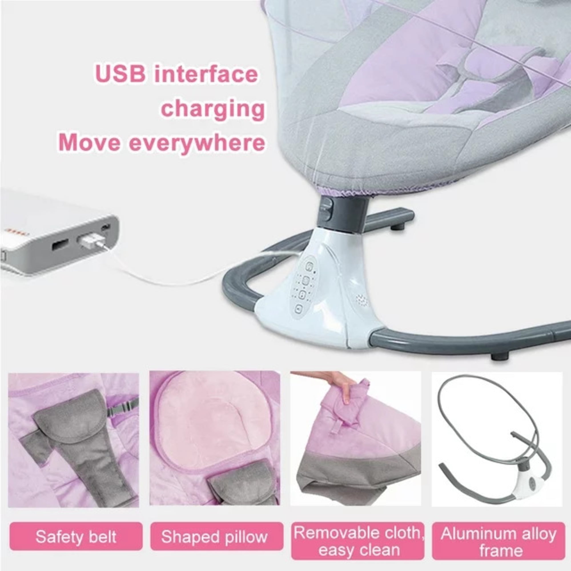 2 Control Methods & 4 Timing Options For added convenience, you can control your baby’s bouncer by control panel or remote control. The time settings for the baby girl swing can be set to 8, 15, 30 or 60 minutes. The time options make it easy for you to do other things while your baby is rocking. Imitates the Natural Rocking Motion Our portable baby swings on clearance, bluetooth infant swing mimics the natural rocking motion of parents with 4 different speed settings. This soothing motion helps to calm and comfort your baby. Easy to Power Up & Control Made for easy use, it can work once connected to a power outlet, requiring no batteries or charging. With a convenient control panel and remote control, you can play lullabies, set a timer, adjust the swing angles with just a press when you’re doing housework or busy in your e-meeting. Bluetooth Speaker & Remote Control The electric baby rocking chair has 12 built-in lullabies and can also be customised to play songs via Bluetooth on your phone. The remote control allows you to play songs within 5 metres to soothe your baby. Portable & Lightweight This pink baby swing is easy to assemble and disassemble and can be used indoors or out. Baby bouncer is lightweight and easy to move, making it perfect for travelling with little ones. Removable mosquito net and canopies can prevent other animals from disturbing babies in the summer. Brand: RICHYOUNG Gender: Unisex baby; boy, girls Color: Pink; Blue; Gray; Light Pink Size: 25.5″ x 27.5″ x 20.8″ Material:Alloy Steel/ Polyester Fiber/ ABS