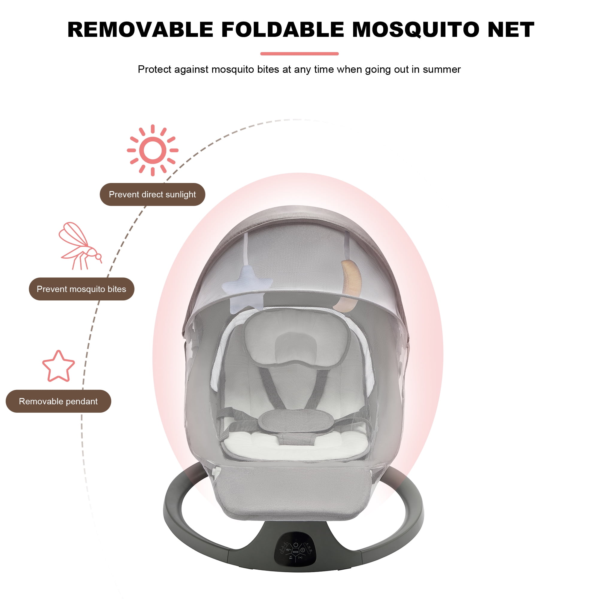 Portable and Lightweight Design with Dinner Plate Accessory: The swing’s portable and lightweight design makes it easy to move from room to room or take with you on trips. The included dinner plate accessory provides added convenience for parents, making it easier to feed without disturbing their soothing environment Adjustable Reclining Seat: The swing’s seat can be adjusted to a 25° angle, similar to the comfort of a mother’s embrace, which is known to help babies fall asleep faster. This ergonomic design combines comfort with the convenience of a customizable sleeping position Extended Footrest: The swing comes equipped with an extended footrest, providing added functionality and comfort for your baby. The footrest ensures that your baby’s legs are relaxed and prevents them from slipping through the bottom of the swing. Bluetooth Music Streaming and 5 Swing Speeds: This electric baby swing is not only equipped with Bluetooth technology, allowing you to stream your choice of music directly to the swing, but also features 5 adjustable swing speeds. Customize the motion to create a calming environment that suits your baby’s comfort and soothes them with the sounds of their favorite tunes or nature sounds Sun Protection and Mosquito Net: Keep your baby protected from the sun’s harmful rays and annoying insect bites with the included sunshade and mosquito net. This dual-layer protection ensures that your little one can enjoy outdoor playtime without the risk of sunburn or insect-borne illnesses, providing peace of mind for parents.