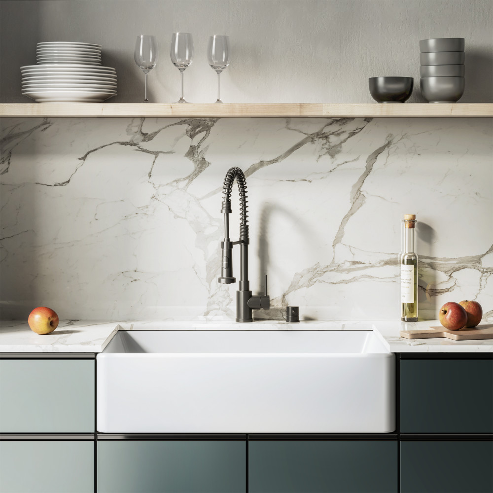 Discover refined luxury in the Elegance collection, where opulent details and sophisticated designs redefine interiors. Infuse rustic charm and modern convenience into your kitchen with our farmhouse sinks, blending traditional appeal with contemporary utility. Offered in white with a glossy finish.