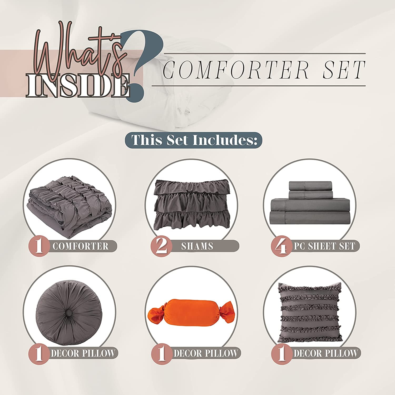 Experience A Fabulous Night’S Rest With Our Elegant Comfort Hi-Loft Luxury 10-Piece Bed-In-A-Bag Comforter Set! Bed-In-Bag Comforter Set Includes Bed Sheet Set With Double Sided Storage Pockets On The Fitted Sheet! You Can Put Your Glasses, Remote Controls, Cell Phones, Ipads, Medicines, Reading Books, Pens, Or Napkins If You Ever Get Sniffles. Multiruffle Cinderella Design With Double-Needle Sewn Thru Construction Eliminates Shifting For Evenly Distributed Warmth. Filled With 100% Fiber For Superior Loft And All Year-Round Comfort. All-Season Bed In A Bag Comforter Set Is Cozier, Softer And Loftier! Ultra-Soft, Microfiber Down-Alternative Shell And Filling Provides Cozy Yet Breathable Warmth And It’S Machine-Washable! Luxury Cinderella Design With Double-Needle Stitching Prevents The Filling From Shifting And Bunching. Unlike Other Down-Alternative Comforters And Blankets, Better Than Down Pampers You With The Softness, Loft, Warmth And Breathability Of Down In, Easy-Care Microfiber.