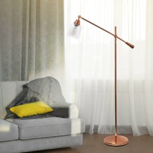 Clean and sophisticated, this floor lamp will illuminate any room in your home in industrial style! It features a rose gold finish with a clear glass shade and a lever style adjustable arm with a hand twist lock for easy adjusting. Ideal for your entryway, office, living room or bedroom. HELPFUL TIP: To get the complete vintage look, we recommend using a decorative Edison/Vintage bulb (‘not included). Rose Gold finish. Clear cylinder glass shade. Lever style adjustable arm with hand twist lock Uses 1 x 60W medium type A base bulb (‘not included), For full vintage look, Type T45 Edison bulb is recommended, Lamp measures: 30″L x 11″W x 56″H