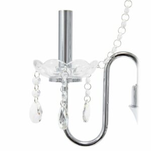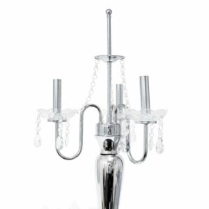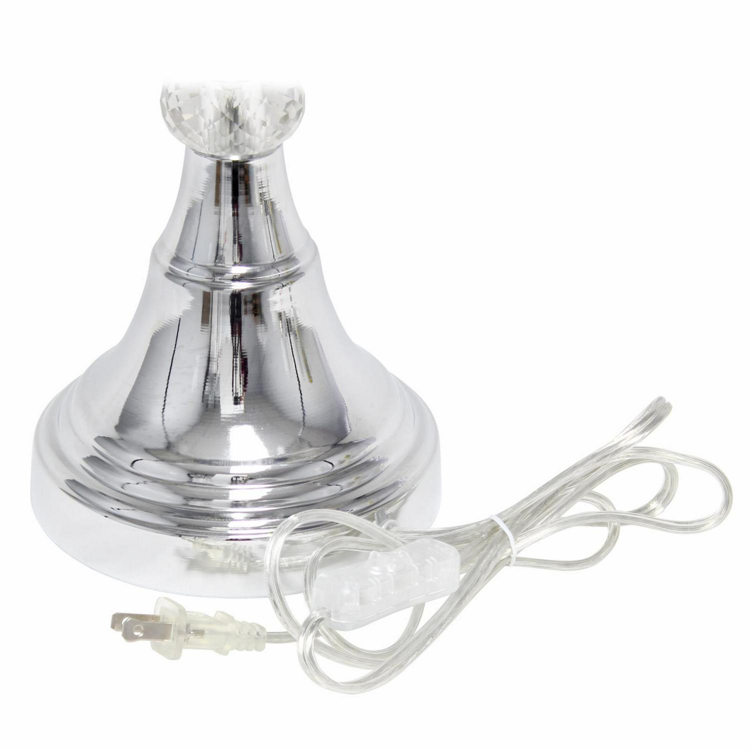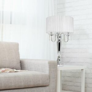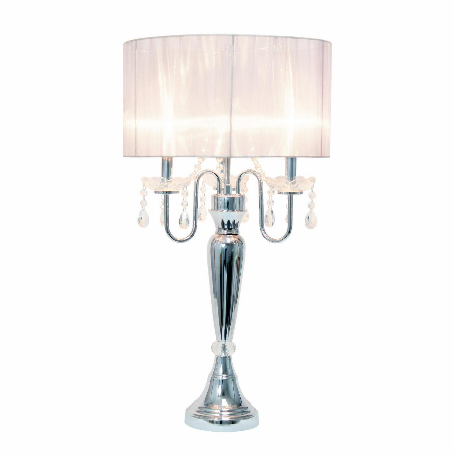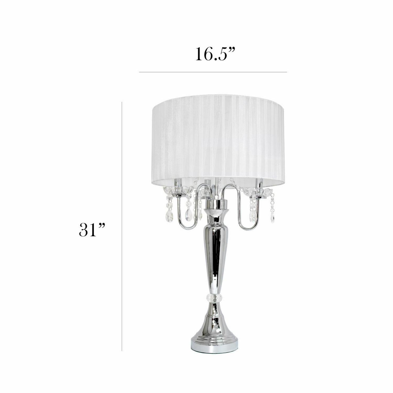 The Elegant Designs Table Lamp – 25.5H in. – White Shade adds light and style to your bedroom. This table lamp features a slim candelabra style base drenched in polished chrome and dripping in faux cut crystals. Its lingerie-inspired drum shade is made of silky sheer white fabric. This lamp requires three 40-watt bulbs (not included).
