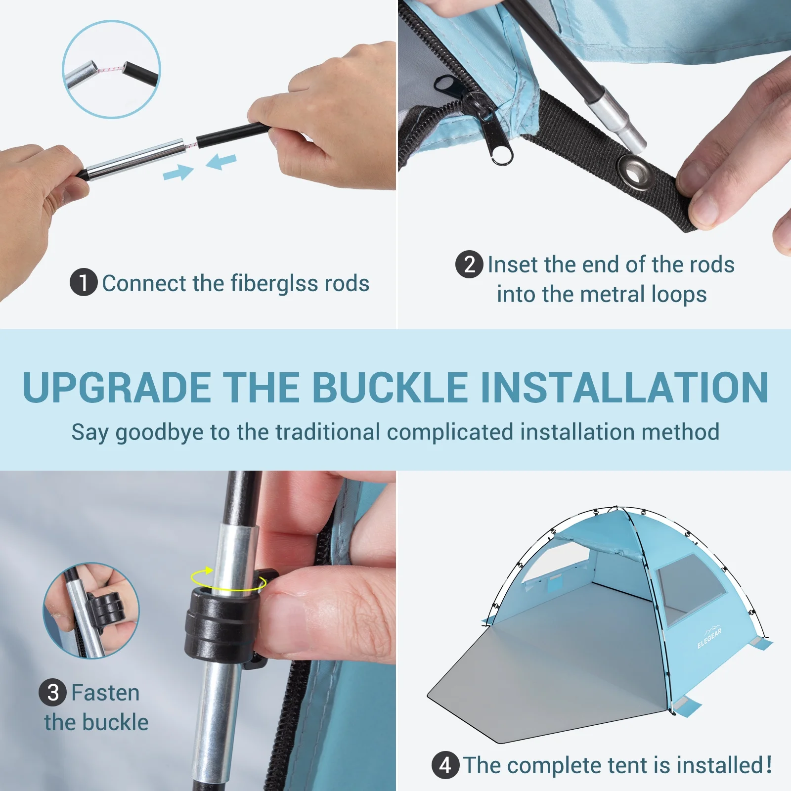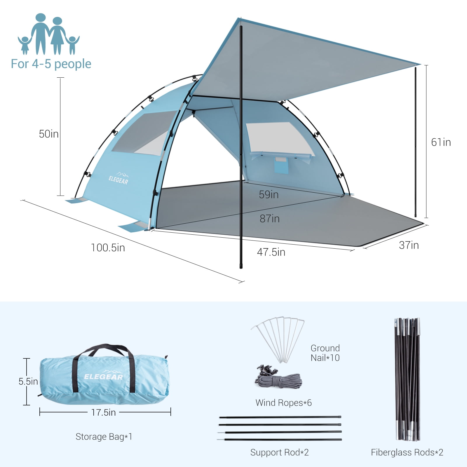 Elegear Beach Tent, Spacious 4-5 Person Sun Shelter with Canopy, 360° Air Circulation UPF 50+ UV Protection Waterproof Portable Lightweight Tent for All Occasions, Skyblue