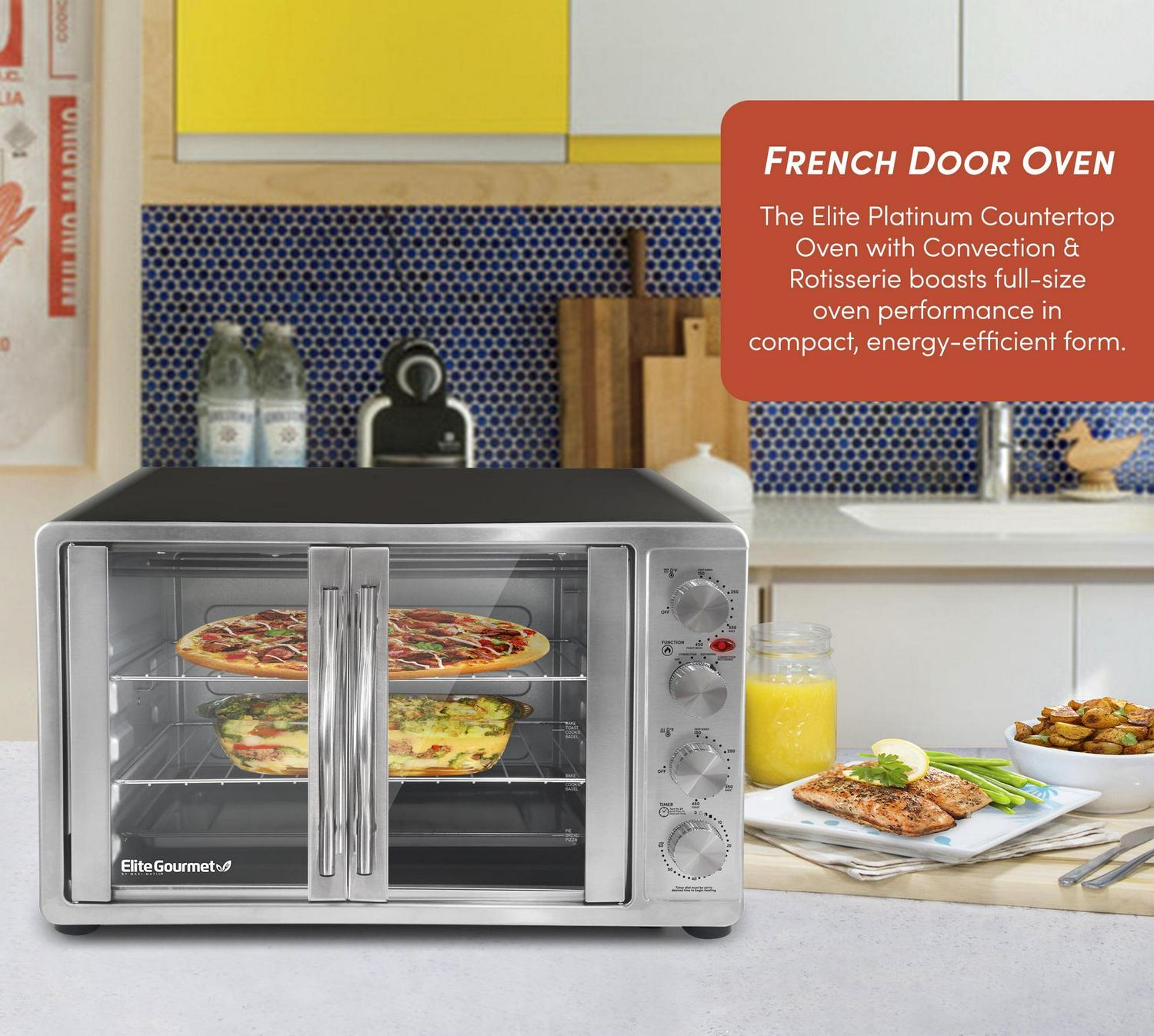 Introducing the Elite Gourmet ETO-4510M New Double Door countertop oven, The perfect stand-in or supplement to conventional ovens. This dual door Rotisserie and convection oven will have you forget about your traditional oven altogether! Toast, bake, broil, and Rotisserie your way to delicious, hearty meals and decadent desserts – this oven can do it all! The spacious interior boasts 4 rack positions so you can bake 2 x 12″ Pizzas, warm dinner rolls, and broil a casserole all at the same time! With heating elements on top and bottom that can be independently turned on using the separate temperature dials, a 60-minute timer, and a function dial, This oven really has the versatility you’ve been waiting for. Includes French-style doors, an interior light, 2 x wire racks, 1 enamel bake tray, a tray handle, Rotisserie set and handle and a crumb tray. Removable parts are all dishwasher safe. Avoid heating up your kitchen with a big conventional oven, save time and use less energy with the Elite platinum Double Door countertop oven, The perfect supplement for the holidays when your kitchen needs goes on double duty!
