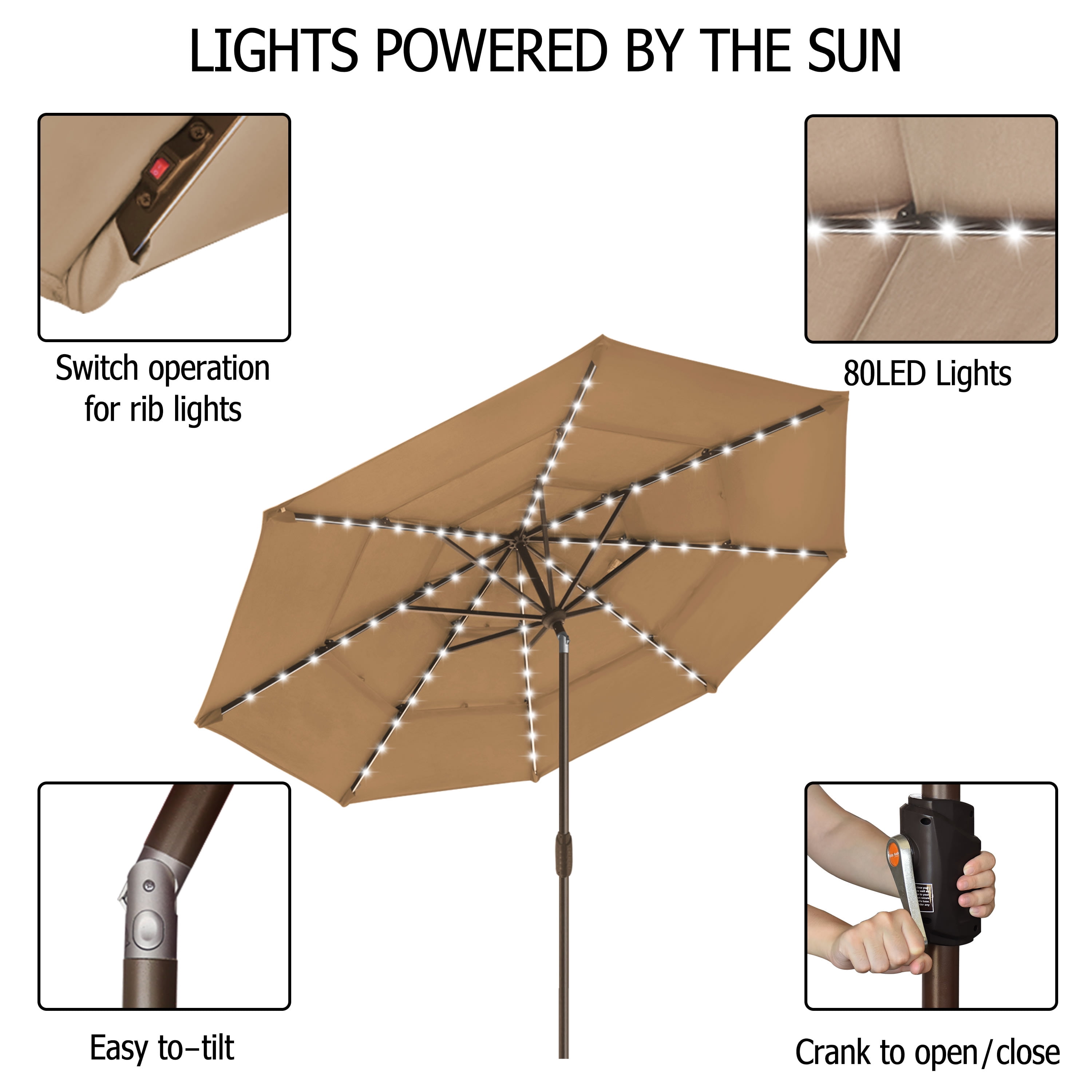 EliteShade Sunbrella Solar 9ft 3 Tiers Market Umbrella with 80 LED Lights Patio Umbrellas Outdoor Table with Ventilation and 5 Years Non-Fading Top,Tan