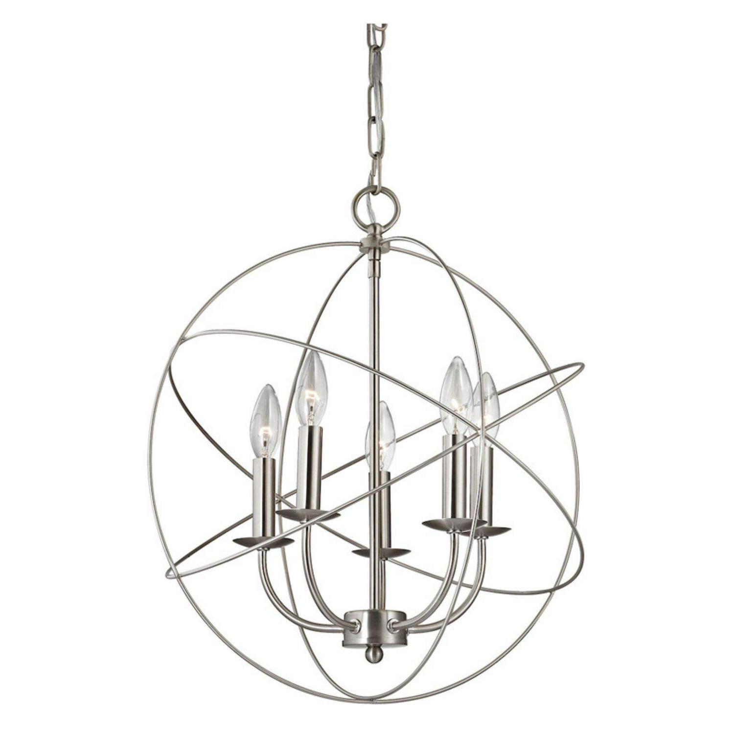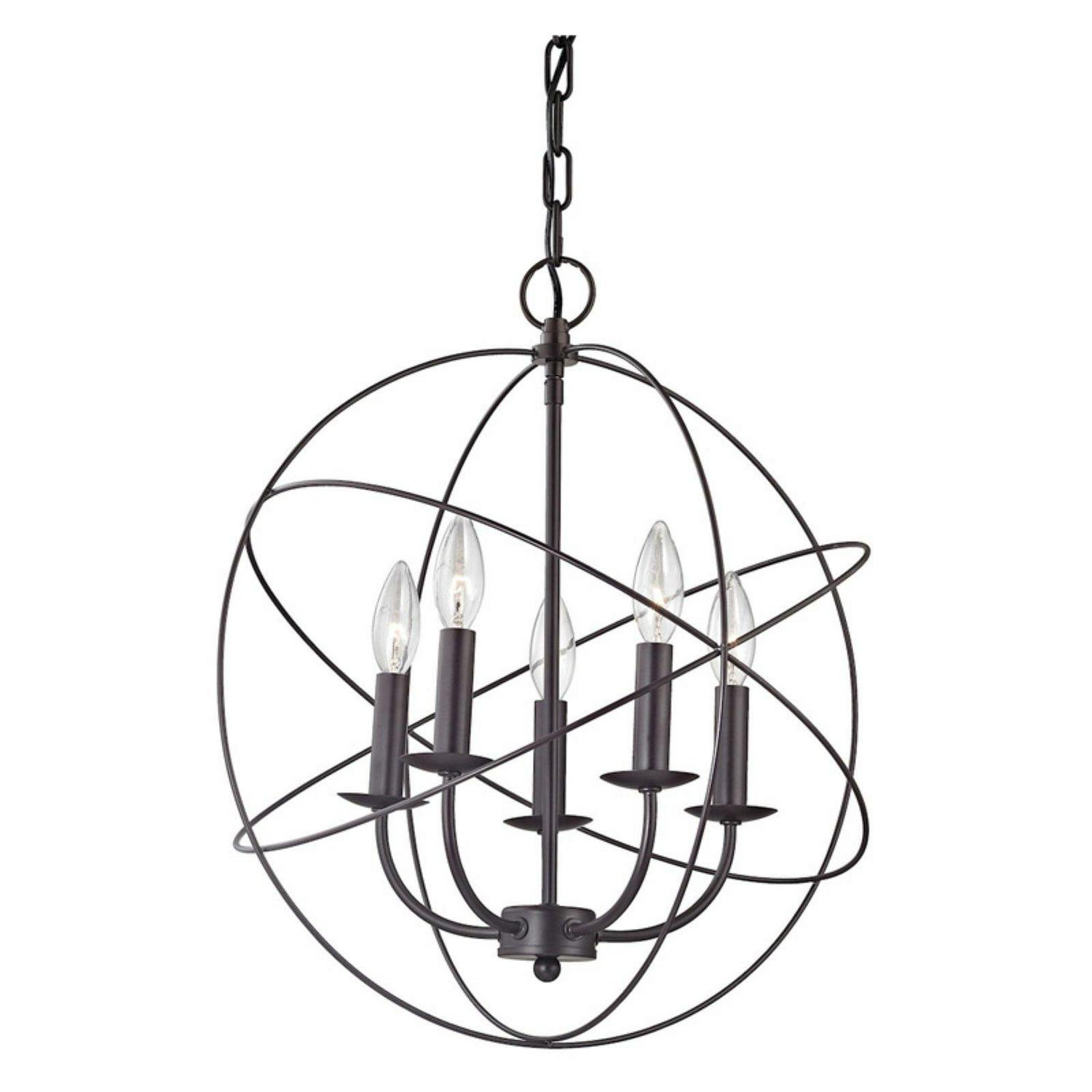 Interlocking metal rings surround five candelabra lights in the striking design of the Thomas Lighting Williamsport 1515CH Chandelier. With its open shade, this contemporary chandelier bathes living spaces in plenty of soft light.