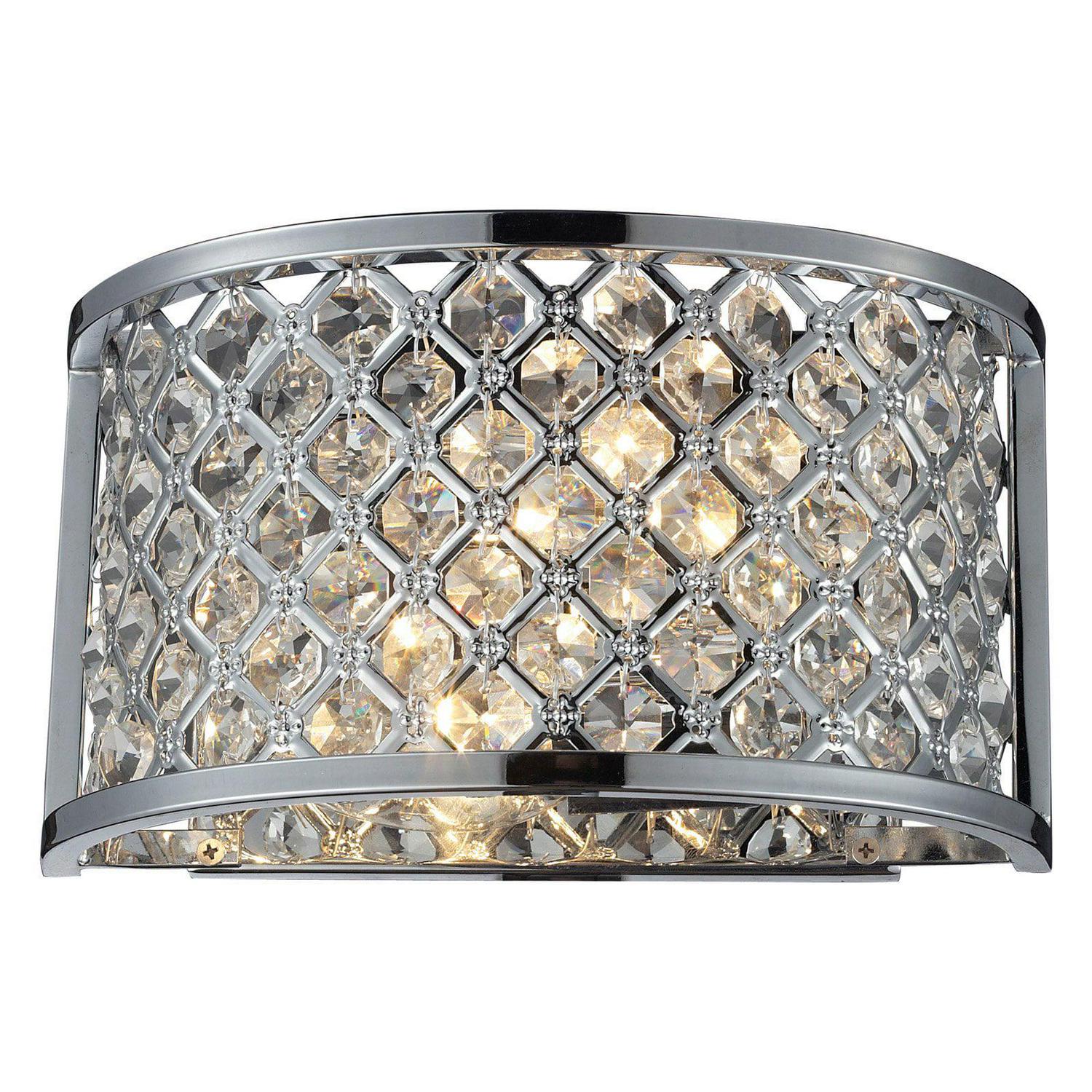 The sophisticated, transitional style of the ELK Lighting Genevieve 31100/2 Wall Sconce – Polished Chrome – 10W in. blends easily with both traditional and contemporary decor, making it a perfect choice for almost any home. Loads of shimmering crystals create a dramatic display on this gorgeous wall sconce, while a frosted glass diffuser provides gentle light from two candelabra bulbs (not included).