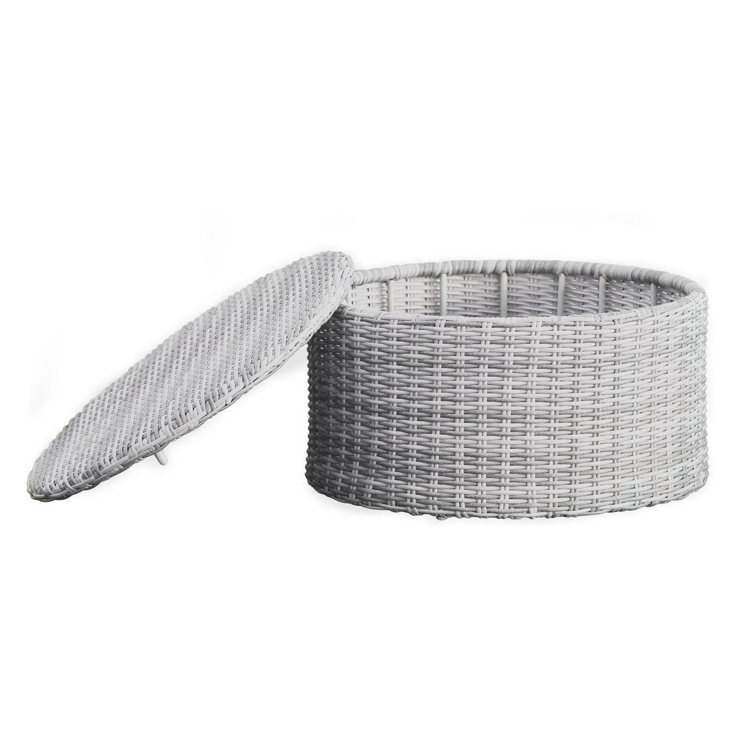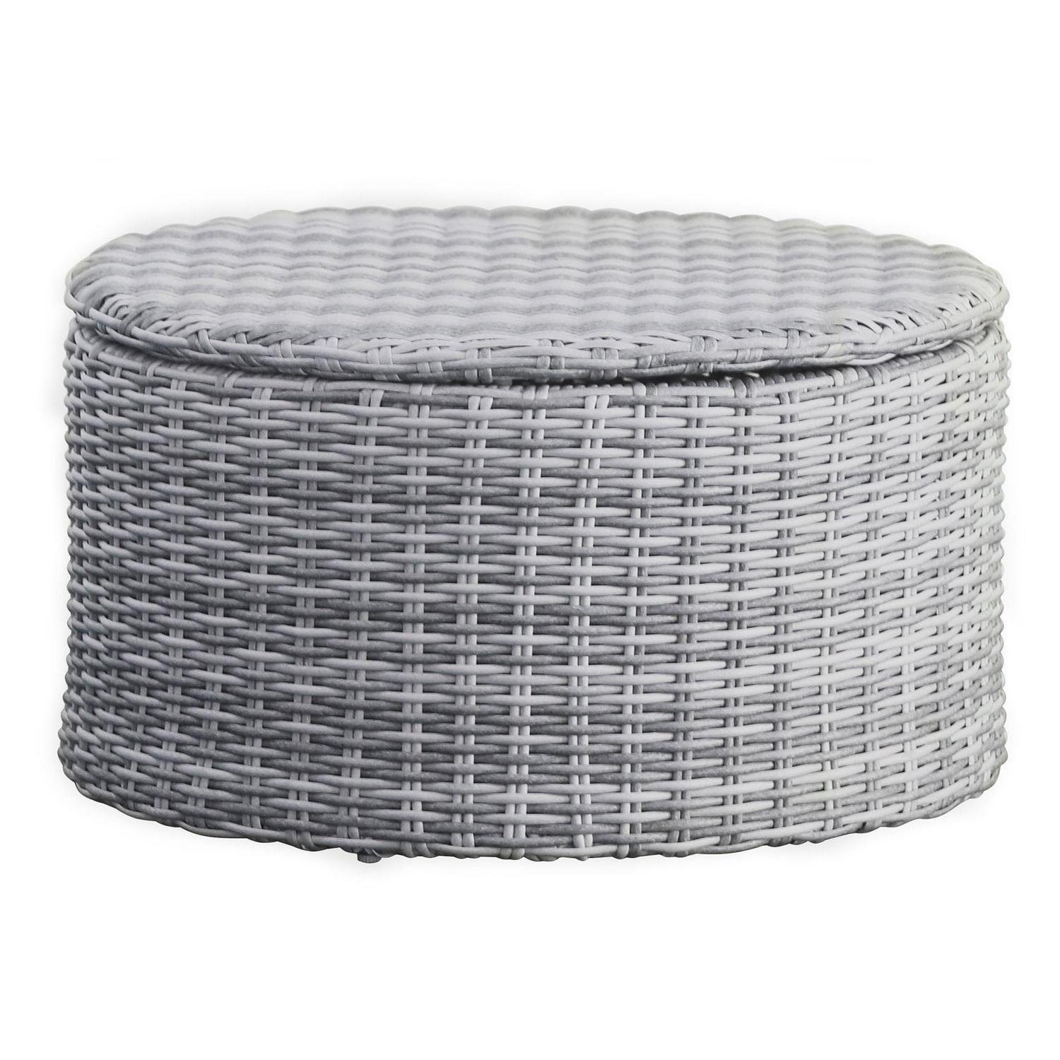 For unmatched versatility and sophisticated style, add the Elle Decor Vallauris Wicker Patio Storage Coffee Table to your outdoor living space or lounge. Soft gray all-weather polyethylene wicker is hand-woven over the rust-resistant powder-coated aluminum frame. This round coffee table will also get used as an ottoman for your patio, deck, or pool area. Lift off the lid to reveal ample storage space inside.