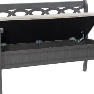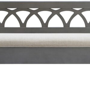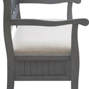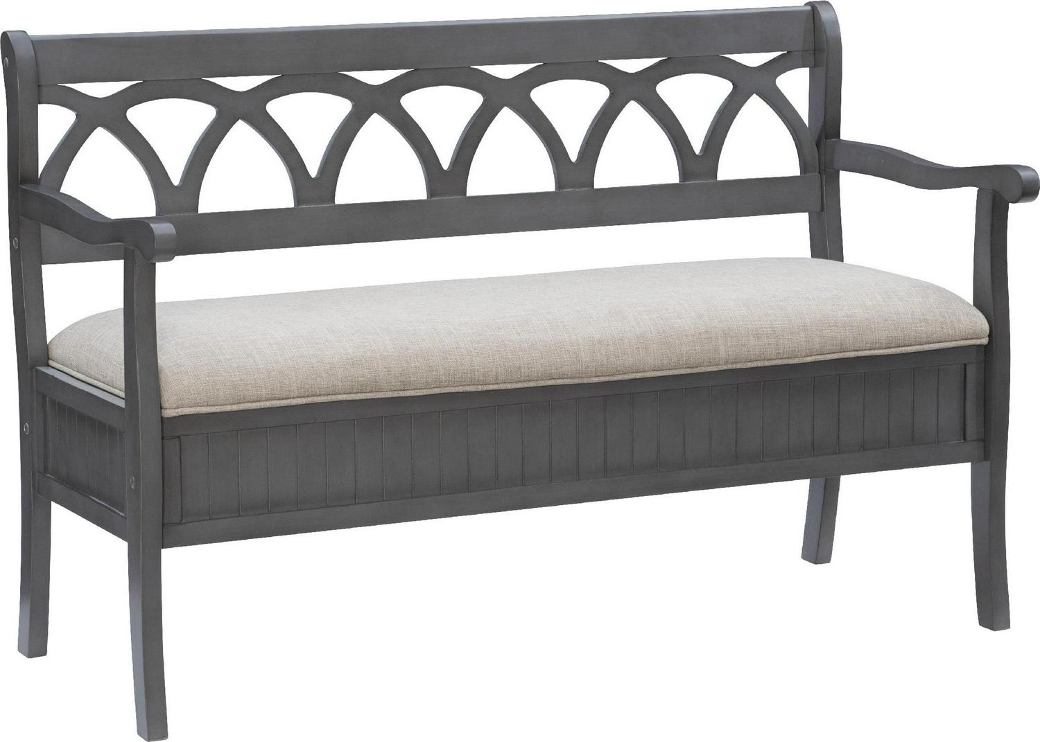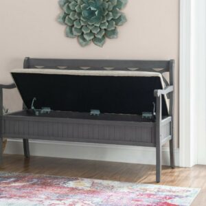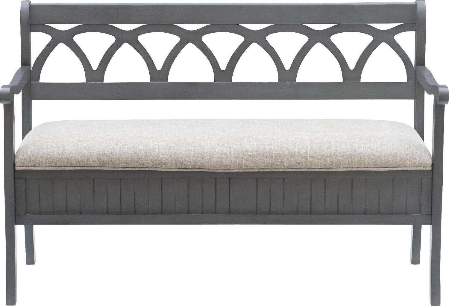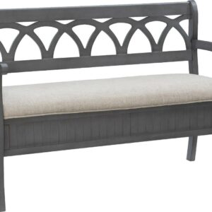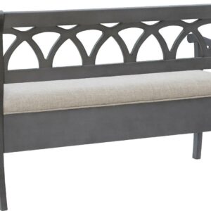 The Powell Elliana Storage Bench adds a stylish touch to your home. The 48″ lift top storage bench opens to deep storage with a built-in separation divider in the center for organization. Safety is a priority with child safe hinges and breathe holes. The bead board detailing on the front and sides of the seat adds charm, while the slightly curved arms accentuate the back decorative arched fretwork. With a comfortable foam seat, the bench is upholstered with a neutral, 100% Polyester fabric. Beautiful gray finish.