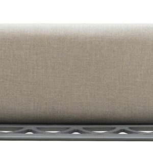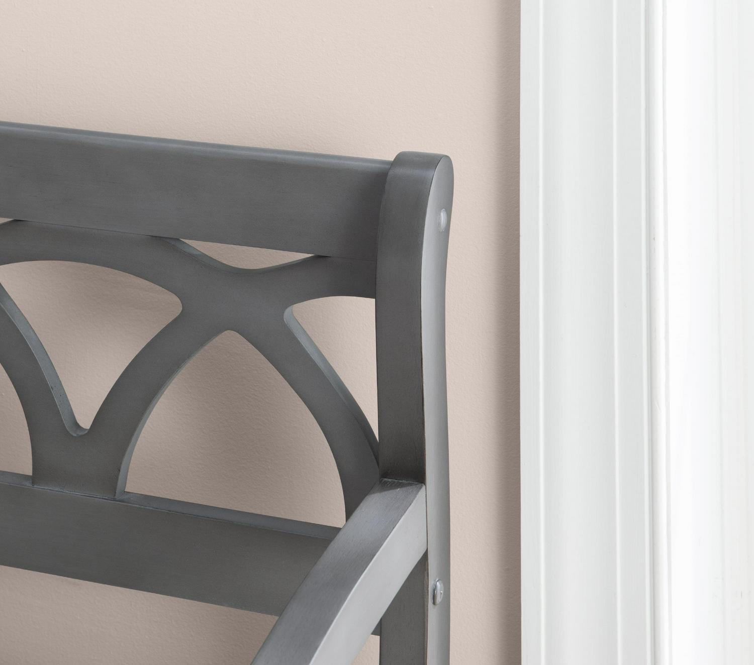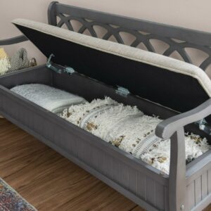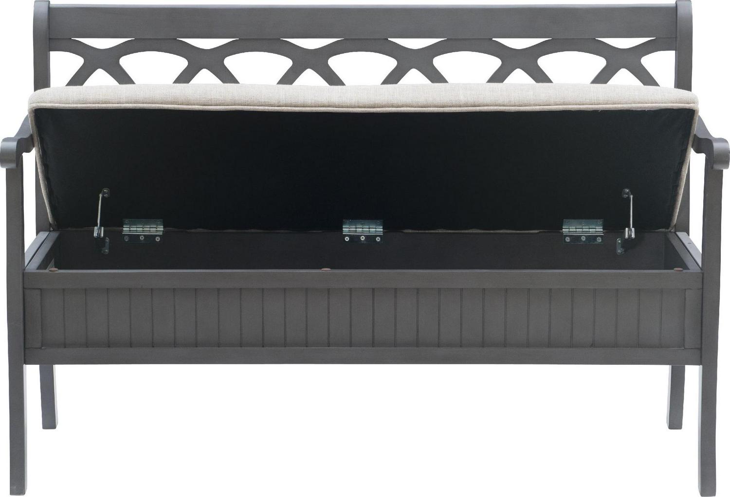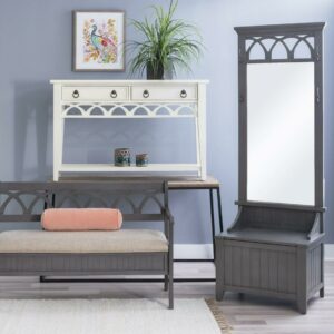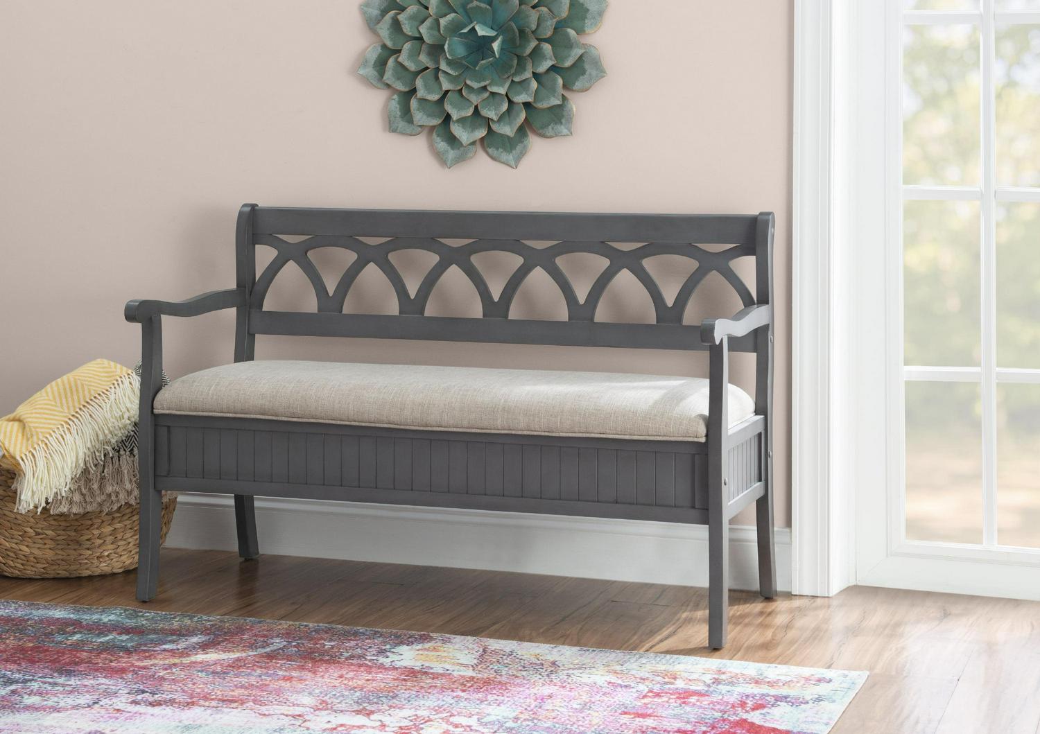 The Powell Elliana Storage Bench adds a stylish touch to your home. The 48″ lift top storage bench opens to deep storage with a built-in separation divider in the center for organization. Safety is a priority with child safe hinges and breathe holes. The bead board detailing on the front and sides of the seat adds charm, while the slightly curved arms accentuate the back decorative arched fretwork. With a comfortable foam seat, the bench is upholstered with a neutral, 100% Polyester fabric. Beautiful gray finish.
