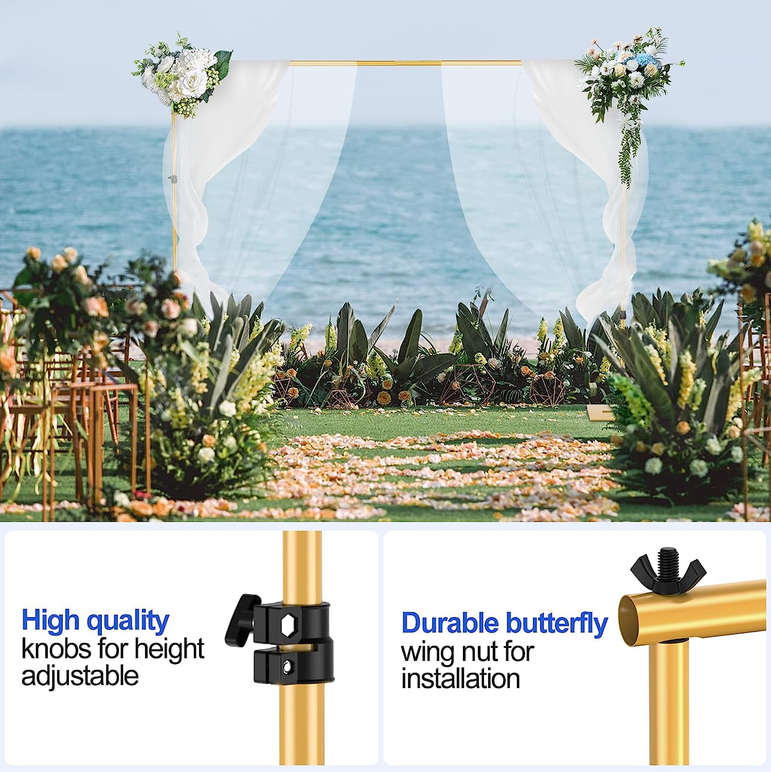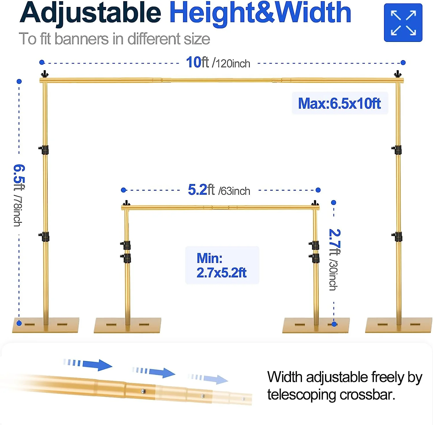 【Heavy Metal Base】 The base is made of high-quality iron. And the large contact area as well as the weight ensure the stable support. 【Retractable Crossbar】 The telescopic design is adopted to make the width of the cross bar freely adjustable. The minimum width is 63inch/5.3ft and the maximum width is 120inch/10ft. It can adapt to backdrops of different sizes. Refer to the product manual for specific dimensions and installation. 【Durable Light Stand】 The stand is made of high-quality aluminum alloy, which is both durable and sturdy; Use the knob lock to adjust the height from 30inch/2.7ft-78inch/6.5ft. 【Convenient Assembly】 The metal background support stand is easy to install. Before installing, refer to the instruction manual or installation video on the product page to learn how to complete the installation correctly and quickly. 【Multiple Application】 Suitable for wedding, reception, birthday party, baby shower, photography, studio, banner frame background, business activities and many other occasions.