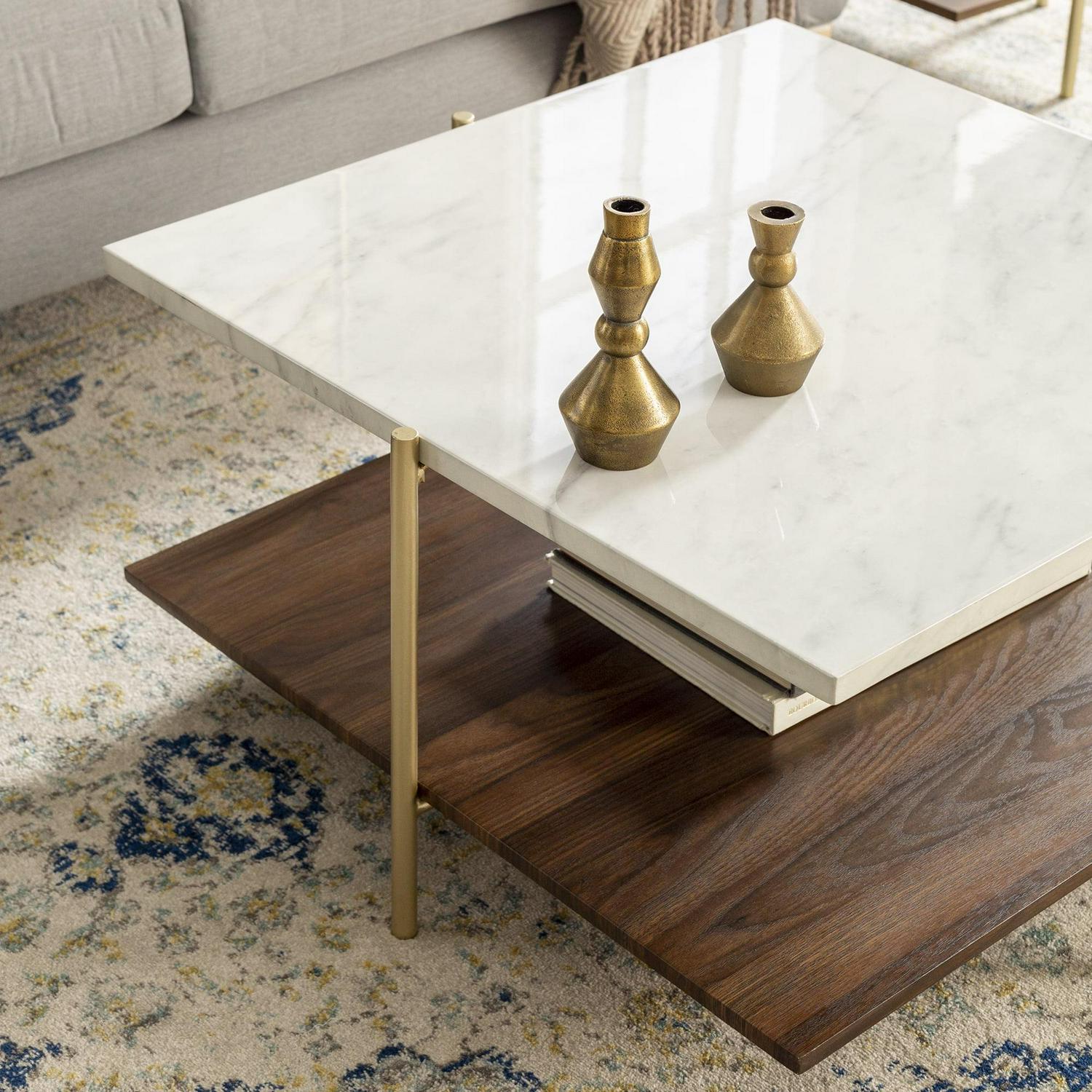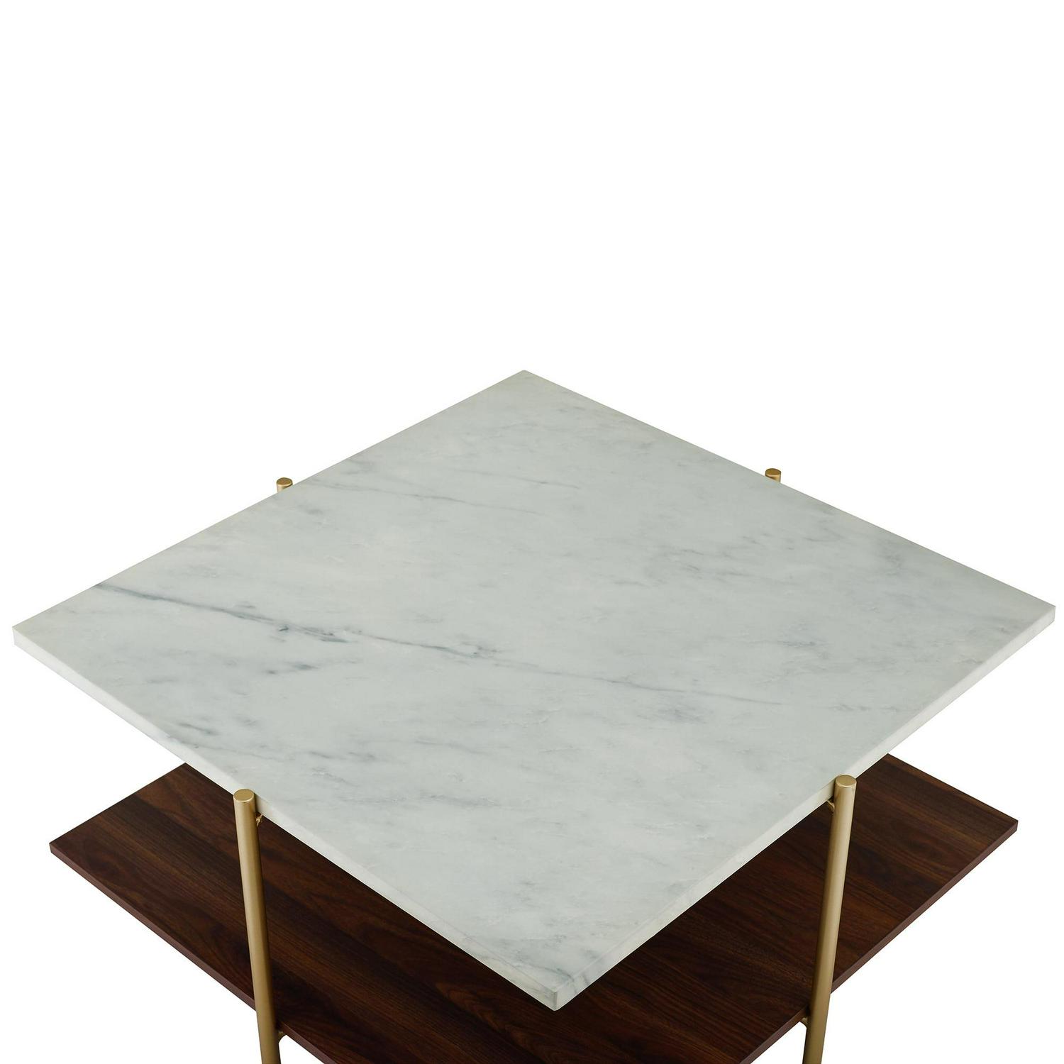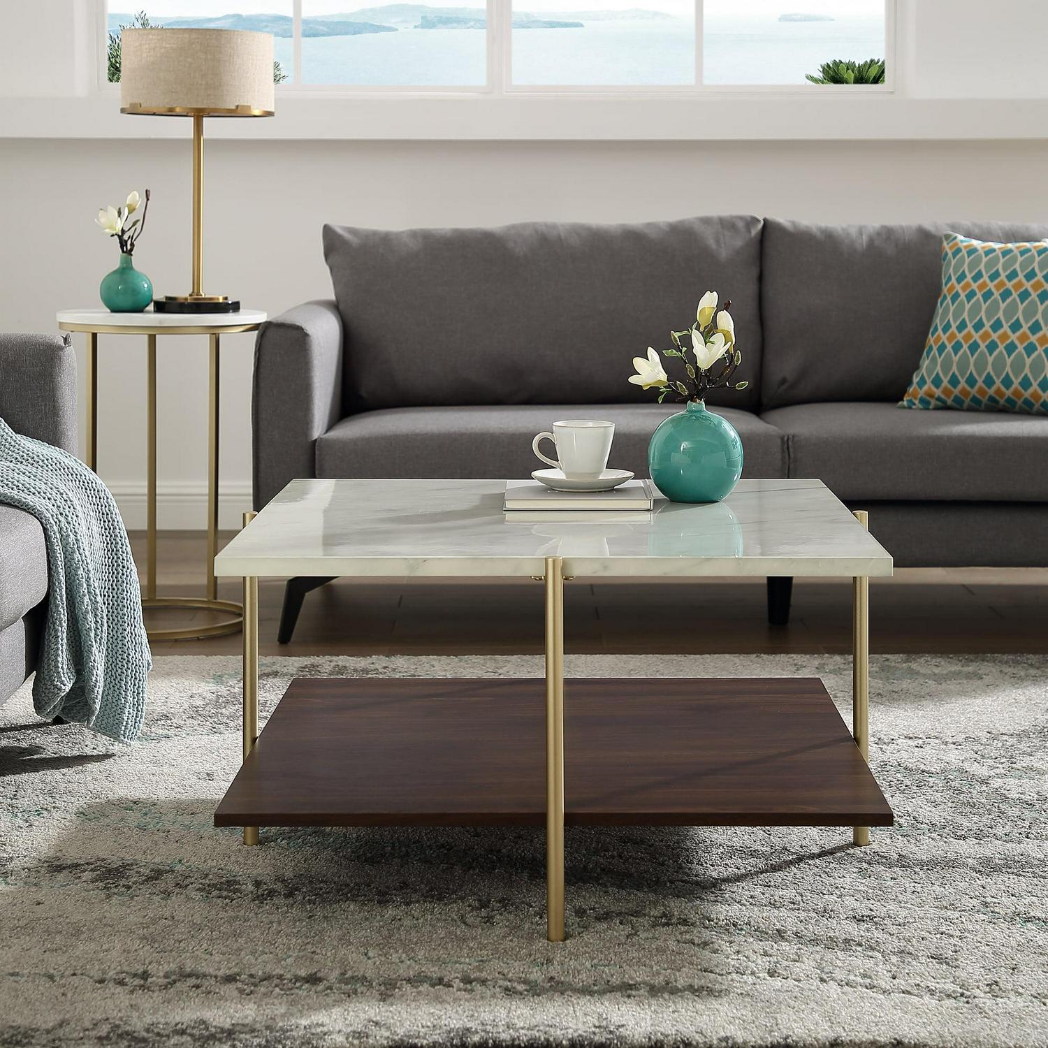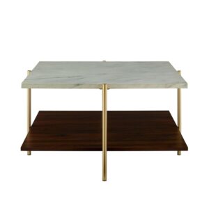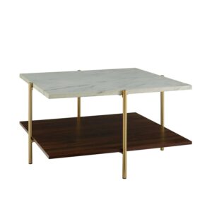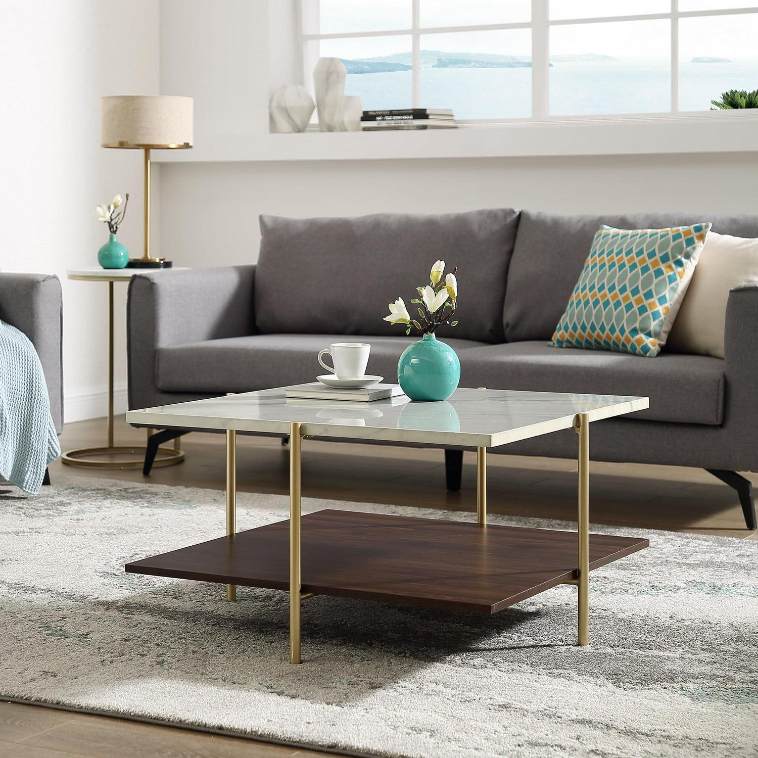 As classy as a first lady, the Ember Interiors Jackie Faux White Marble Square Coffee Table will be an unforgettable addition to your home. Its slick silhouette makes it a standout cocktail table. It features a faux white marble tabletop that’s finished with a UV coating. The UV coating creates a high gloss look and provides a moisture-resistant layer so go ahead and plan your next cocktail party without worrying about setting out any coasters. Painted gold metal legs frame the accent table. The lower shelf is finished with a dark walnut high-quality laminate that offers an additional richness to this multi-tone glam coffee table. Add form, function, and style to your space with the Ember Interiors Jackie Faux White Marble Square Coffee Table.