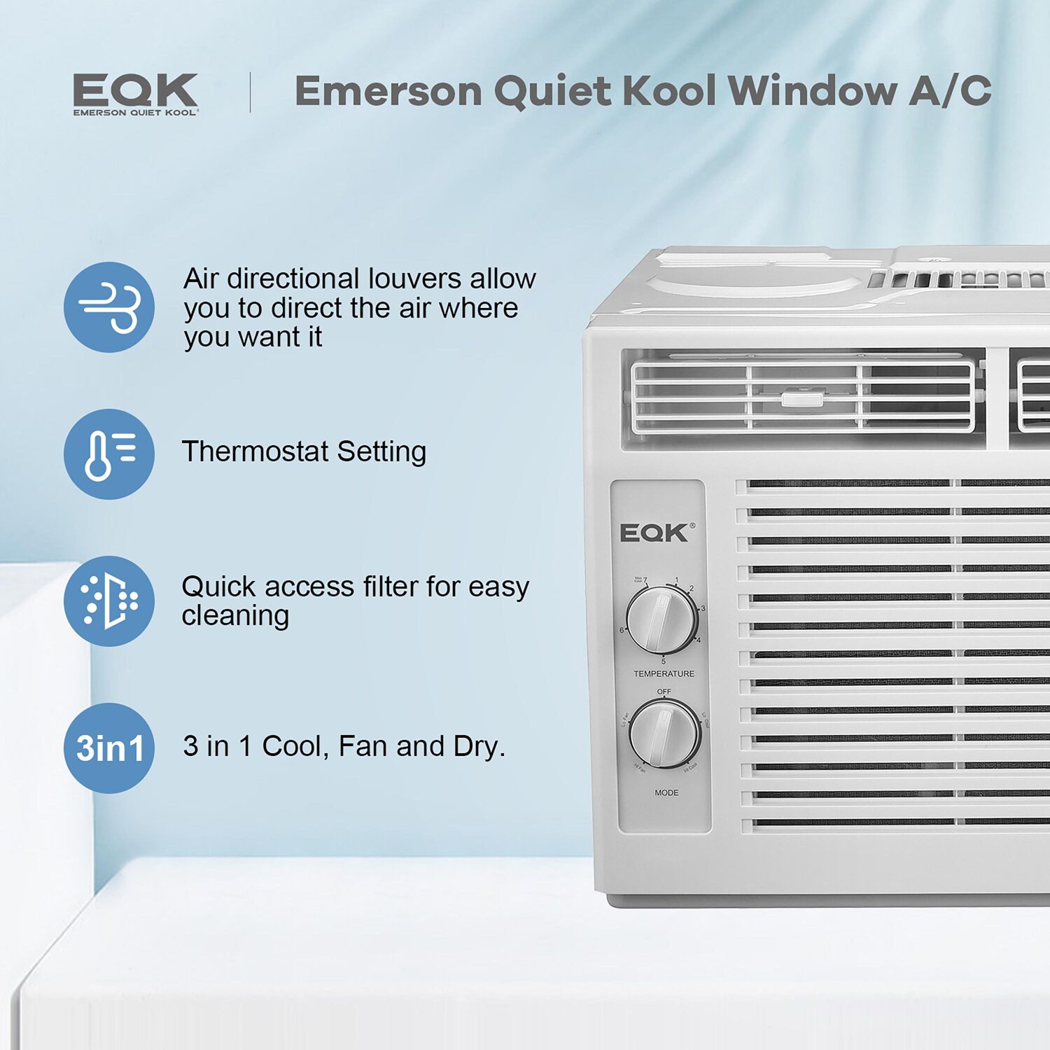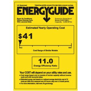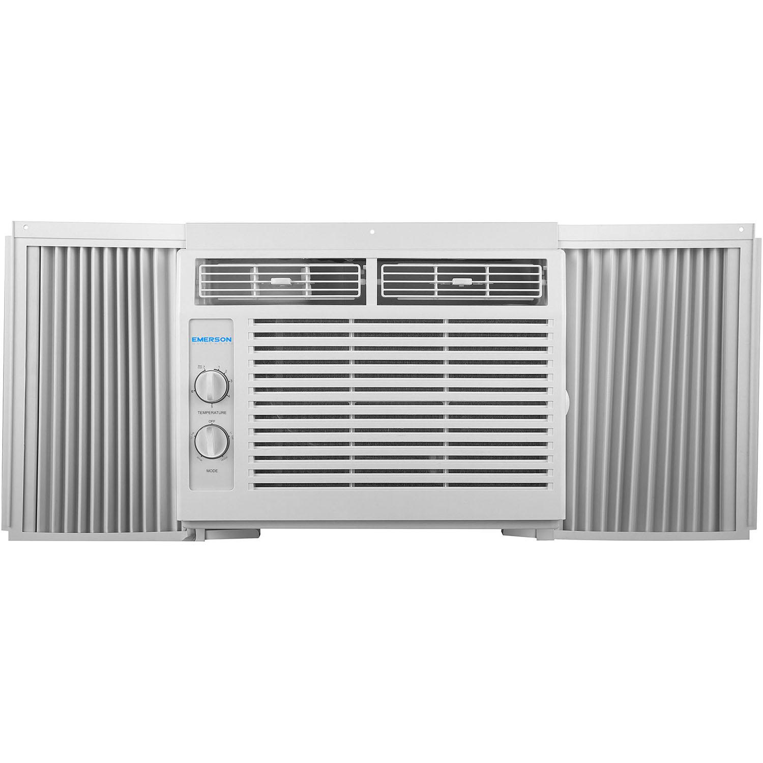 The Emerson Quiet Kool 5,000 BTU window air conditioner with mechanical rotary controls is the perfect cooling solution for your home or office. Designed for a room from 100 to 150 square feet, this easy-to-install mini-compact unit features 2 cooling speeds and 2 fan speeds with 8-way directional air louvers. You’ll also enjoy quiet operation, low voltage startup to conserve energy and save money, plus convenient auto restart in case of a power failure. And for peace of mind, you get our 1-2-5 years warranty: 1 year labor, 2 years parts and 5 years compressor. Emerson Quiet Kool air conditioners are a great way to beat the heat and stay comfortable.