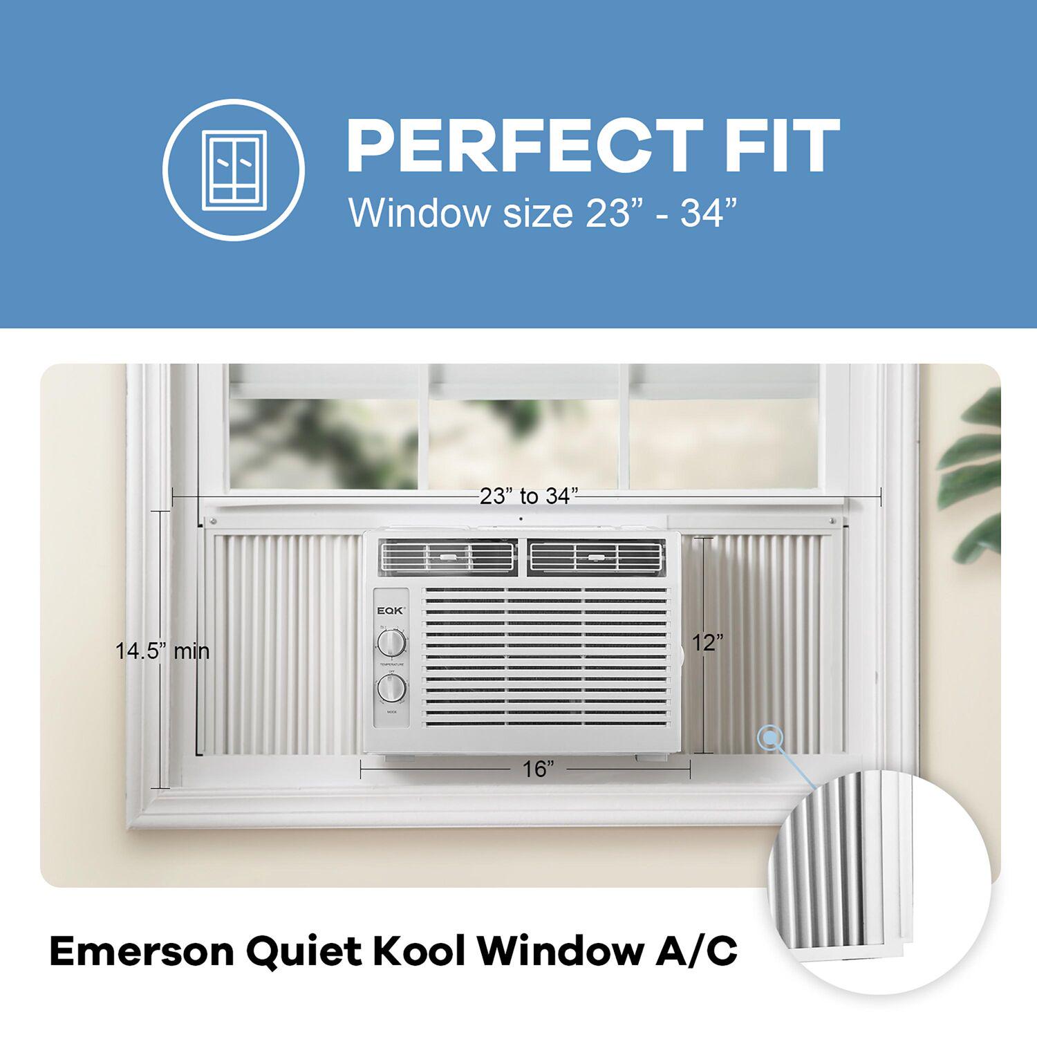– Smart-Fit Sizing: With dimensions of 16 W x 12 H, this Emerson Quiet Kool window air conditioner was designed with Smart-Fit dimensions, meaning it will fit any 23 to 26 window you have. Included foam insulation with help you retro-fit your sleeve to this new design. Don t have a sleeve Remember to check the dimensions prior to purchasing.