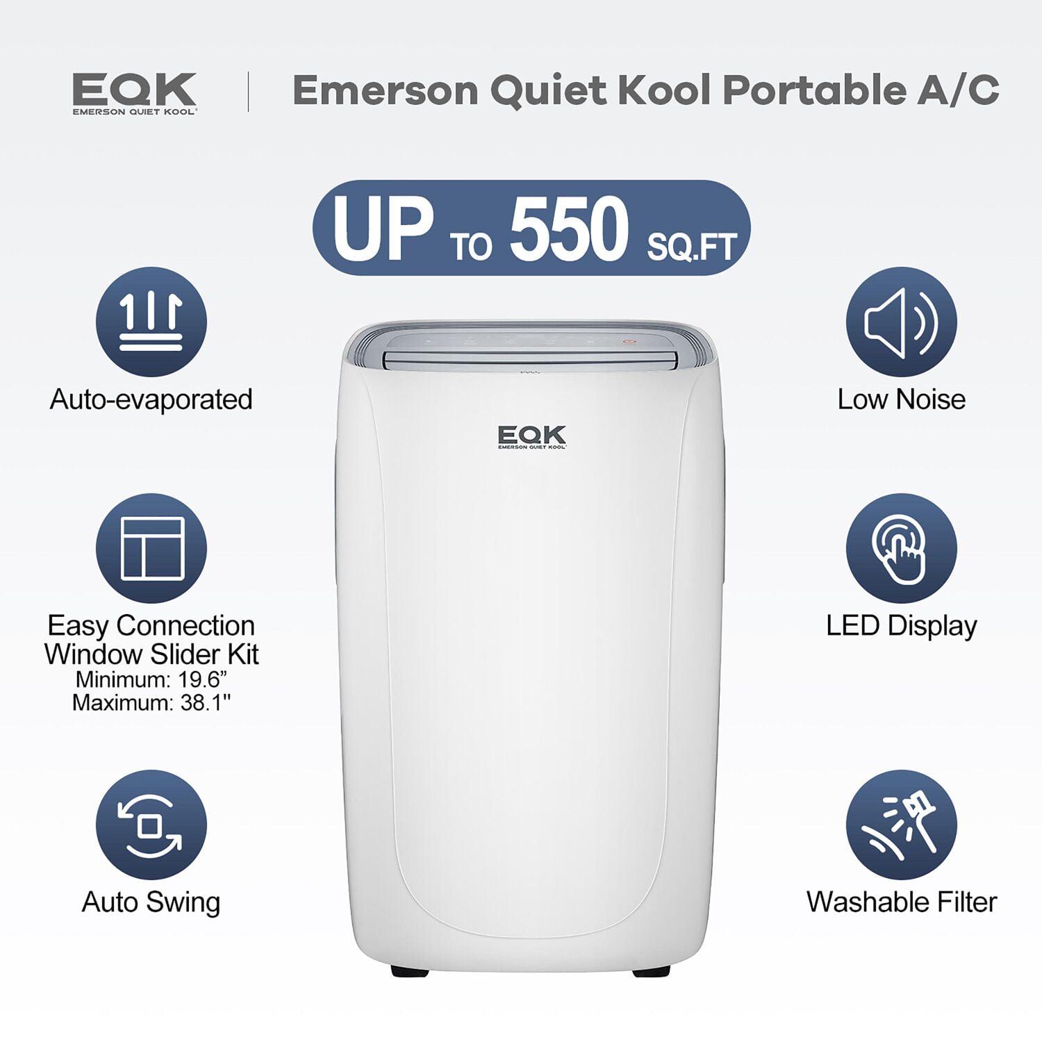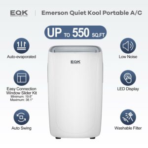 Enjoy flexible, energy-saving, spot cooling with the Emerson Quiet Kool portable air conditioner. With the included window venting kit, it can be easily installed and put into operation anywhere. Using auto evaporation technology, our portable air conditioner also functions as a dehumidifier by reducing unwanted moisture in the air without any necessary drainage. Convenient features include a remote control, 24-hour on/off timer, and sleep mode. And for Peace of mind, you get our 1-2-5 years warranty: 1 year labor, 2 years parts and 5 years compressor. Emerson Quiet Kool air conditioners are a great way to beat the heat and stay comfortable.
