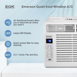 The easy-to-install Emerson Quiet Kool 6,000 BTU window air conditioner with remote control is the perfect cooling solution for your home or office. Designed for a room from 150 to 250 square feet, convenient features include electronic controls with 3 speeds, flexible cooling options and a 24-hour on/off timer. You’ll also enjoy quiet operation, low voltage startup to conserve energy and save money, plus convenient auto restart in case of a power failure. And for peace of mind, you get our 1-2-5 years warranty: 1 year labor, 2 years parts and 5 years compressor. Emerson Quiet Kool air conditioners are a great way to beat the heat and stay comfortable.