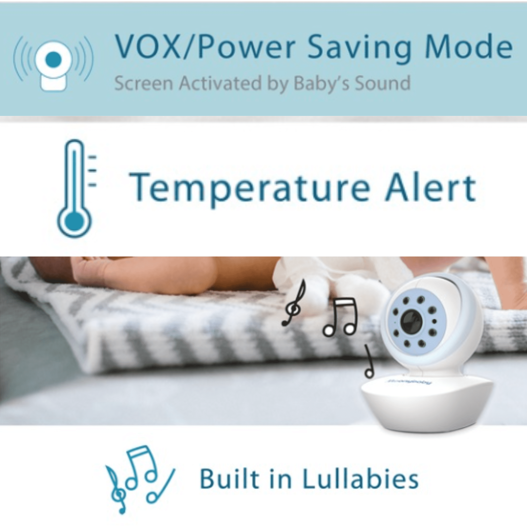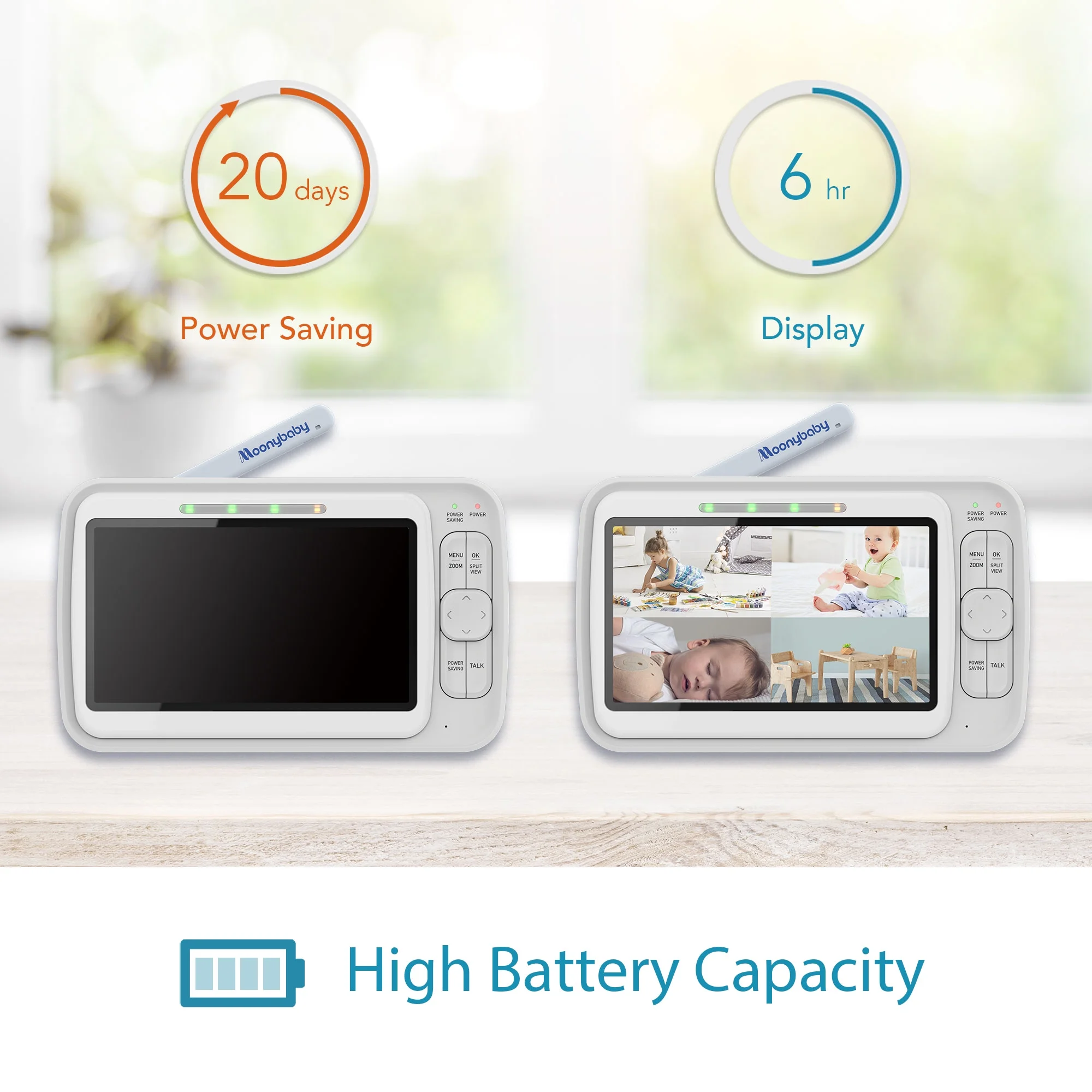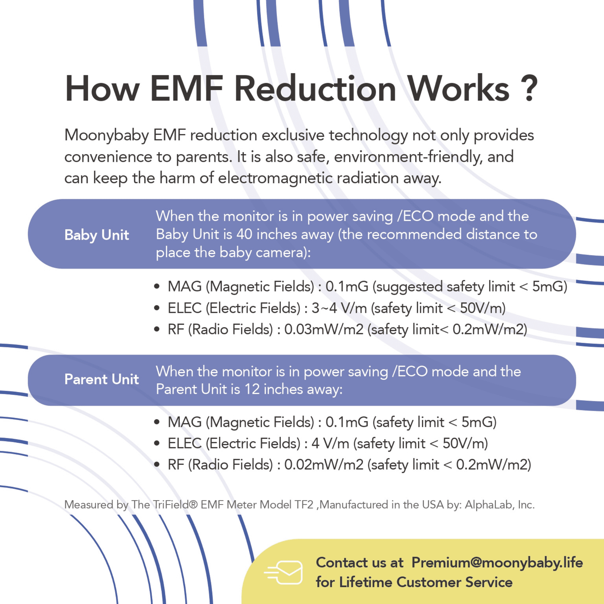 EMF Reduction Baby Monitor: Moonybaby exclusive Energy Saving Technology can tremendously reduce the magnetic fields, electric fields, and radio fields generated by the baby monitors and keep them under safe value 5″ 720p Quad View Split Screen for Maximum 4 Cameras: The monitor can connect up to 4 cameras and display them in a quad view split screen. The audio can stay on one camera or automatically navigate between cameras every 10 seconds to keep you updated on all cameras 20-Day Stand-by Battery Life in ECO Mode: When the monitor is in ECO mode, the battery life is extended to 20 days, and the power efficiency is enhanced by nearly 50 times, which can effectively reduce the consumption of energy. No more suffering from low-battery anxiety No Wi-Fi, Privacy Provided: The 100% digital wireless secured technology ensures a private and secure connection between the camera and the monitor. The 2.4GHz interference-free signal works in the home between rooms and upstairs, and downstairs. No Wi-Fi, and internet setup is required and hack-free Support You Wholeheartedly: Our products come with great features including 2-way talkback, room temperature monitoring, 5 built-in lullabies, and most importantly