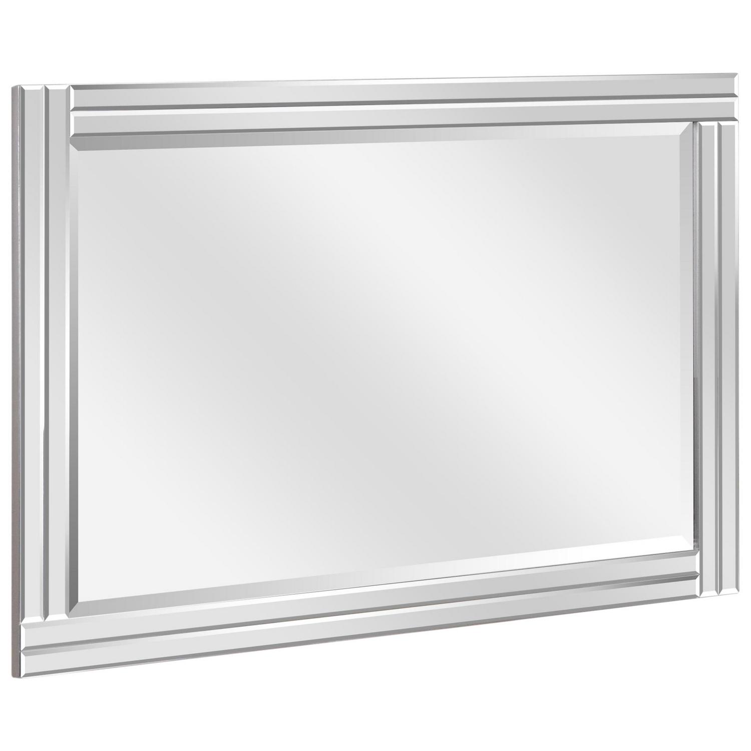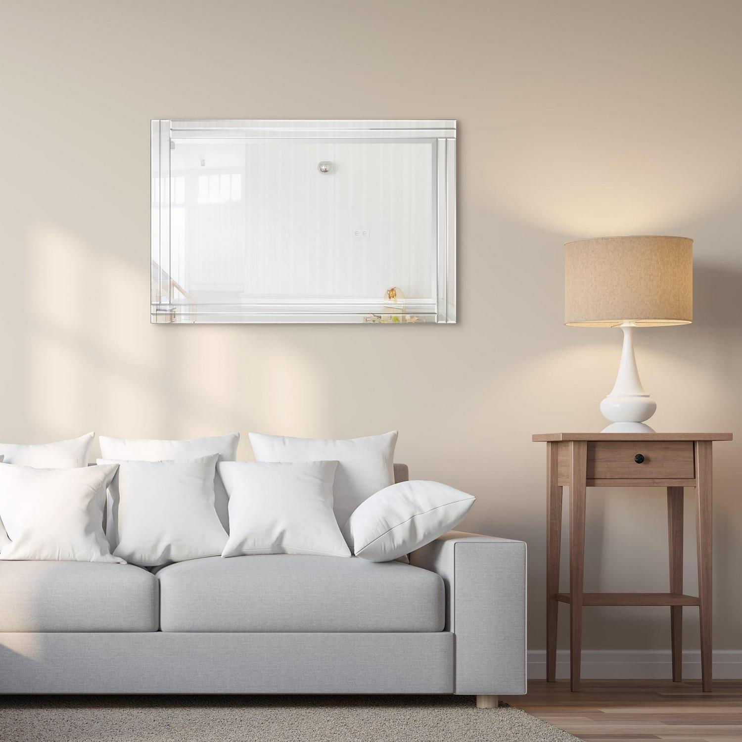 - Features a dimensional beveled-mirror “step” frame
