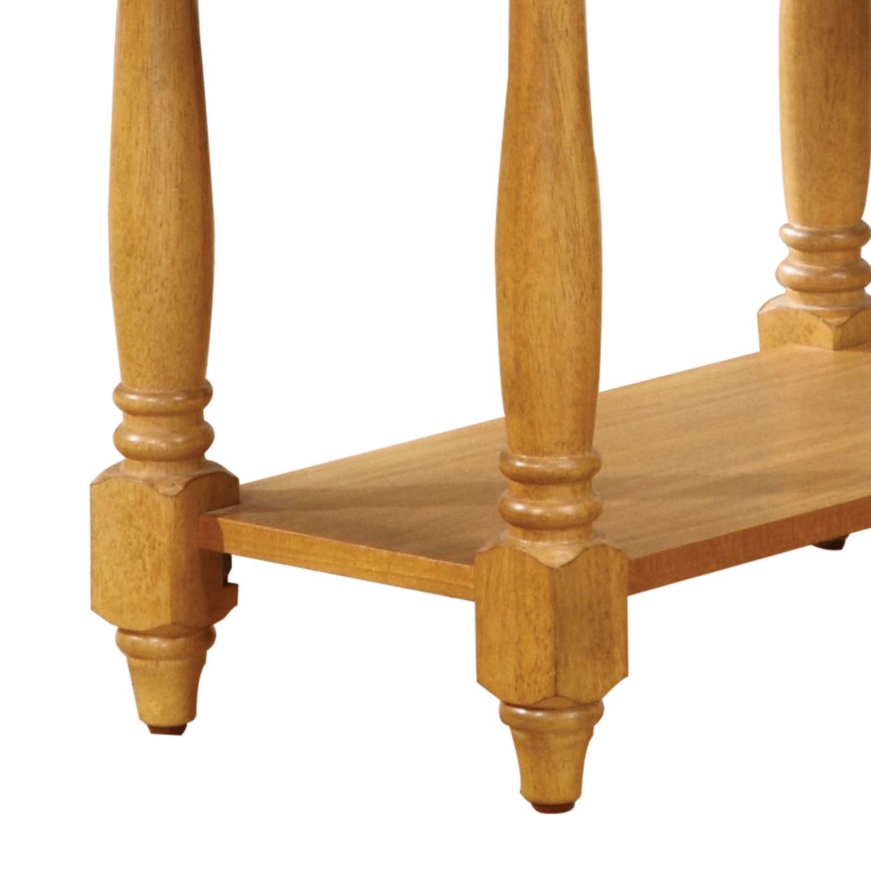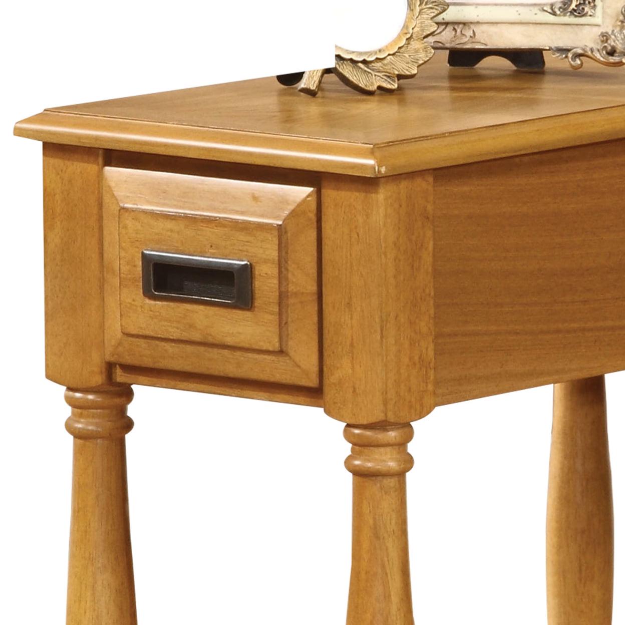 Enchanting Side Table, Light Oak Brown- Saltoro Sherpi The occasional side table features smooth table top, storage drawer, turned legs and convenient bottom shelf-board. Expertly crafted with selected woods and veneers in light oak finish. This beautiful casual style that will make a great addition for any room