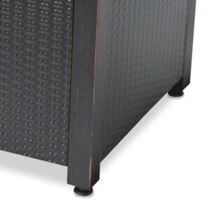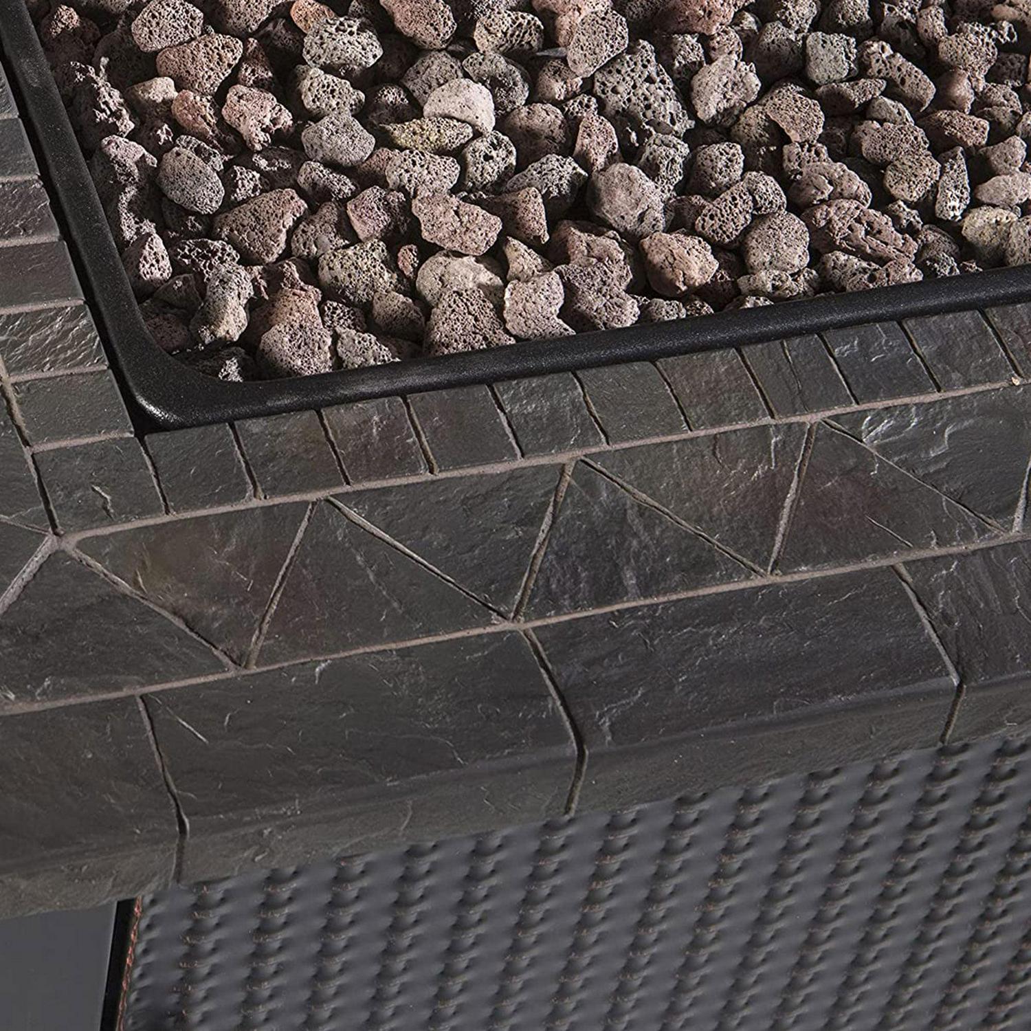 – Contemporary design with lava rock, wicker-style steel base, and mosaic resin mosaic mantel showcase a polished look