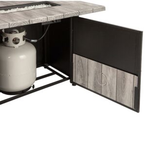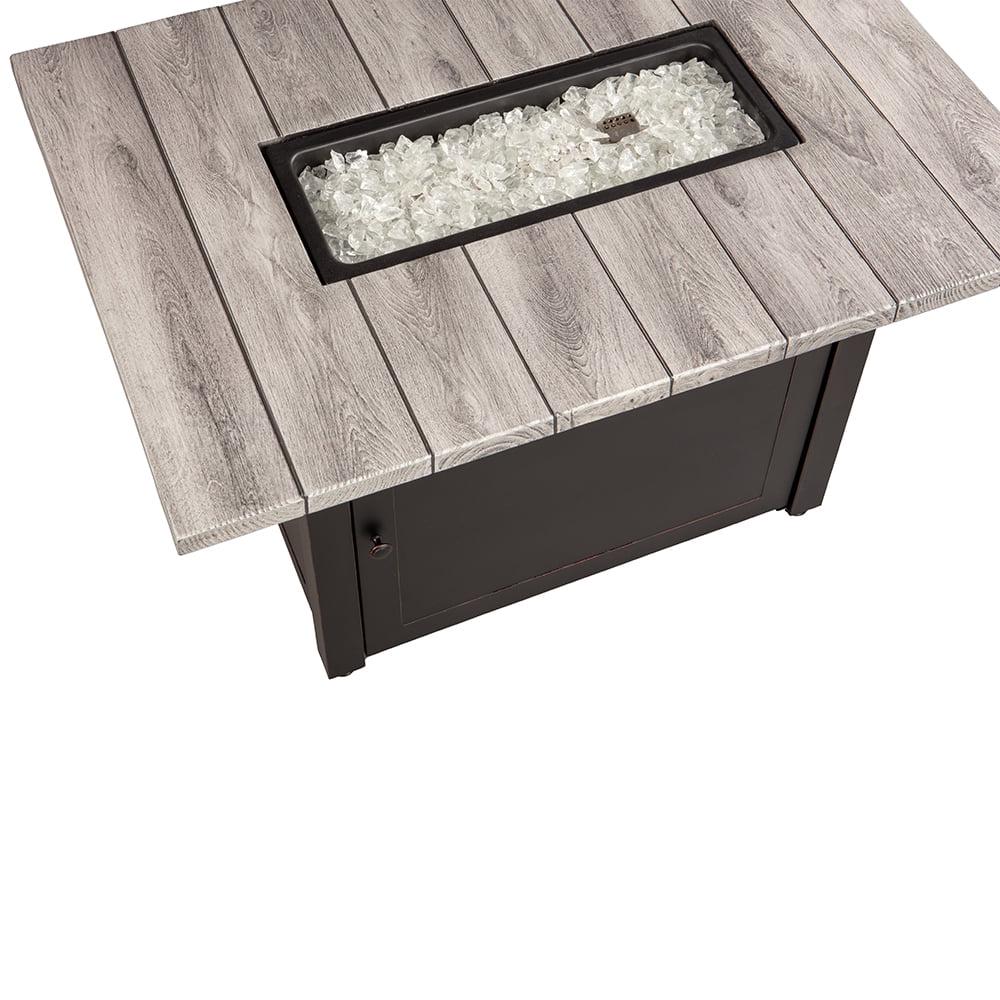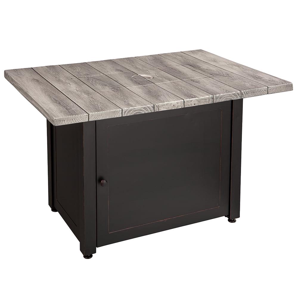 This large rectangular 48-inch Endless Summer fire pit also serves as a table when not in use. The mantel is a stylish wood grain UV print, and the matching table insert completes the look when the fire pit is not in use. The oil rubbed bronze finish base cleverly conceals the propane tank (not included) and a Hide-A-Way spot for storing your table insert when using the fire pit. Includes a 45,000 BTU stainless steel burner that keeps you and your guests warm. The white fire glass (included) reflects the flame creating an attractive glow. A protective cover is also included.