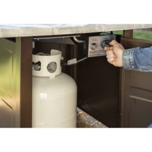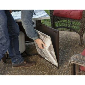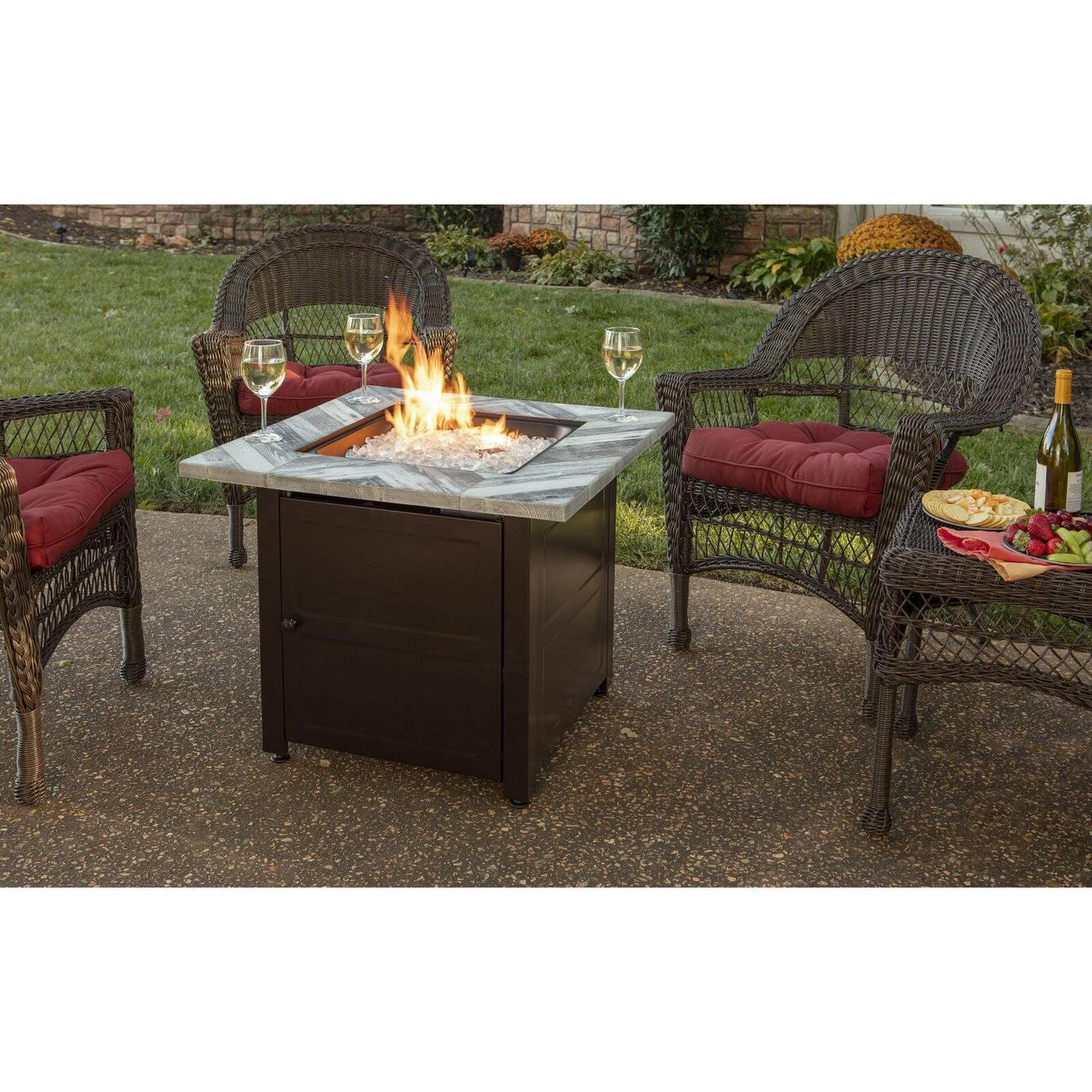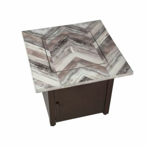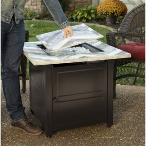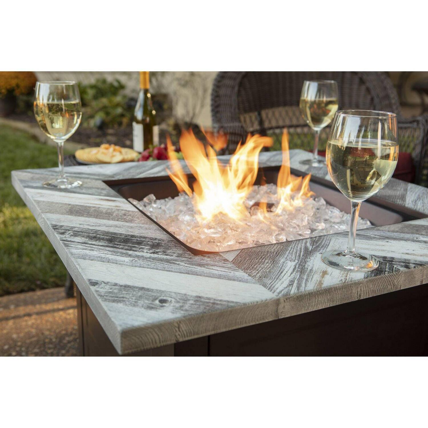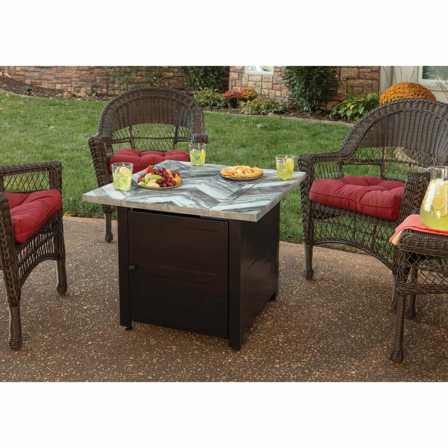 Bring the warmth and ambiance of a fireplace to your patio, deck or backyard with the Endless Summer Duval 30 in. LP Gas Fire Pit. Featuring a chevron designed wood grain printed resin hearth, this fire pit is complete with an attractive black finish steel base, making it the perfect centerpiece for your outdoor living space. Complete with a 50,000 BTU stainless steel burner and integrated ignition, you can enjoy all the ambiance of a classic fire without the mess of tending ashes. This unit also comes with white fire glass, a table insert to match the mantel which is conveniently stored inside the unit in Hide-A-Way feature when not in use, and a protective cover.