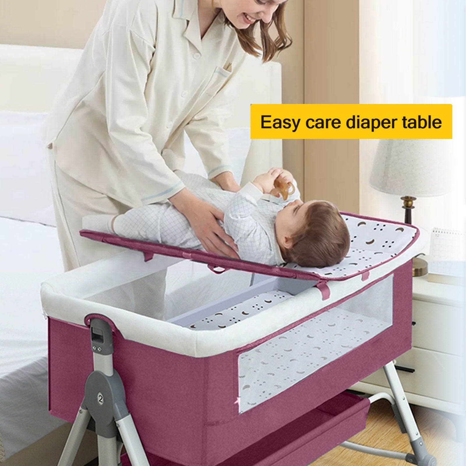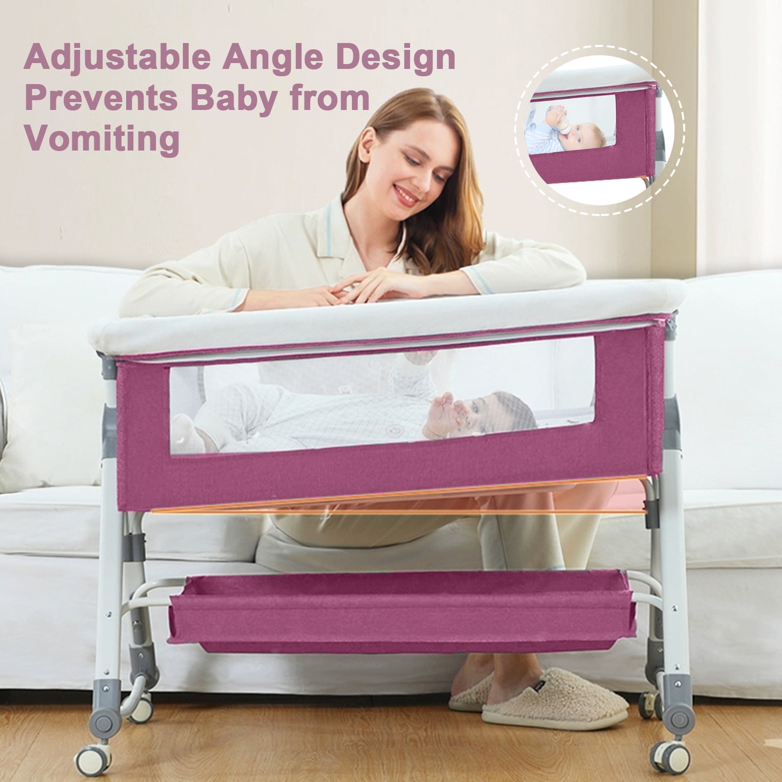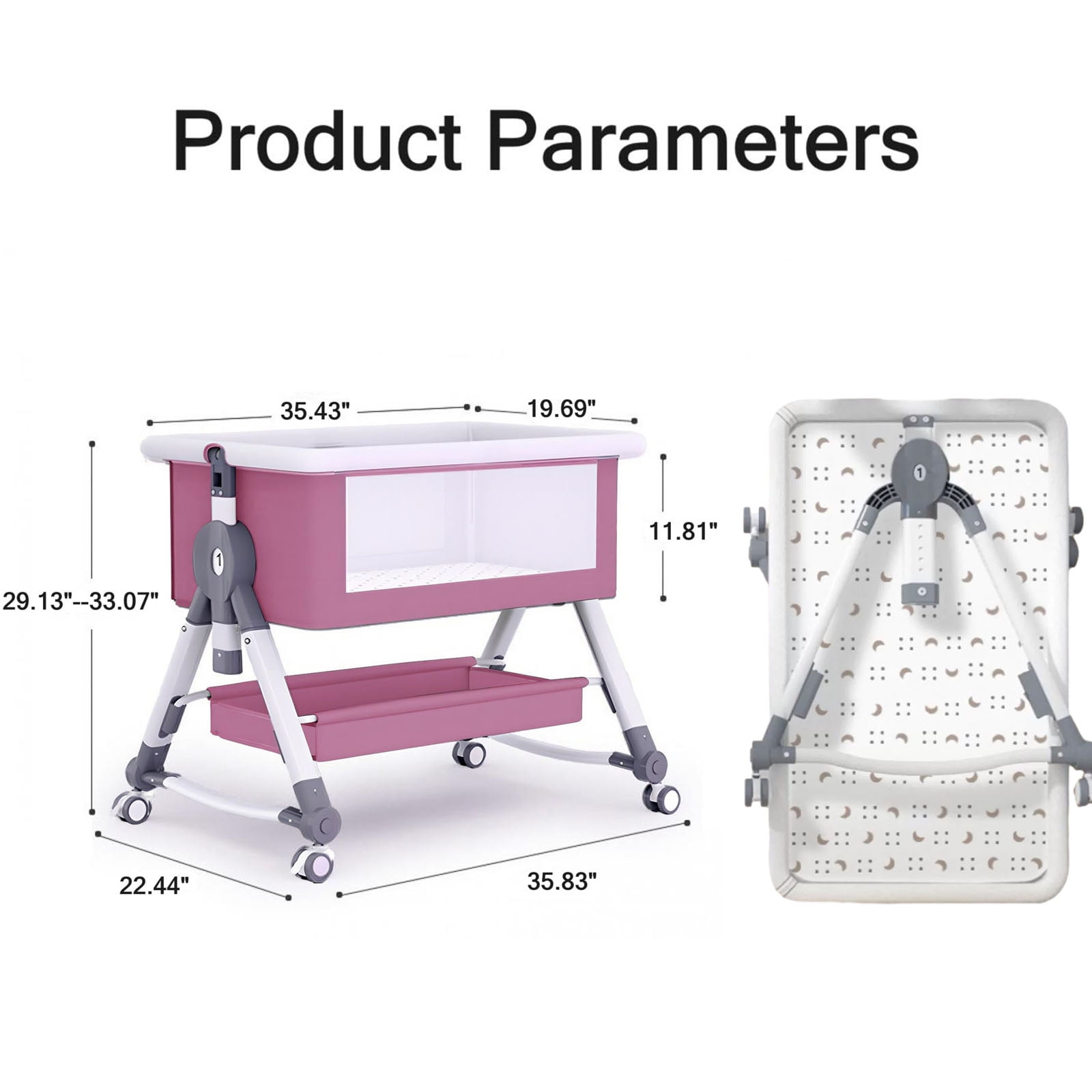 【5 Height Adjustment & Stable Structure】The baby bedside crib has 5 levels of height adjustment, suitable for adult beds of different heights. Adopting a high load-bearing thick steel pipe bracket and a golden triangle stable structure, it effectively prevents the baby’s bassinet from flipping over. 【Changing Table & Large Storage Basket】The baby bassinet is equipped with a changing table and a large storage basket to store various items of the baby, providing convenience for parents to change diapers for their babies. 【Rocking Mode & Stationary Mode 】There are two modes for the Bedside Crib, stationary mode and rocking mode. You can easily switch to rocking mode to let your baby relax. Detachable mosquito net with zipper to prevent mosquitoes and block strong light. 【Silent Universal Wheels & Comfort Mattresses】The silent universal wheel can be locked, making it easy for you to push it effortlessly. Equipped with a comfortable mattress to protect the baby’s spine, detachable and washable. Baby Bedside Crib fabric is skin friendly, comfortable and breathable. 【Foldable and Easy to Store】You can quickly and easily fold it, store it in the corners of your home and in the back of your car, making it more convenient to carry when going out. 【After-sale Service】If there are any quality issues, please feel free to contact us at any time. Brand: EONROACOO Color: Gray, Pink Weight: 18.82 lb Material: Carbon Steel Linen Cotton Gender: unisex, baby girls, baby boys Design: foldable, 5 adjustable height Type: Bassinet with wheels and changing table Weight bearing: 50KG Age range: 0-24 months Size: 35.83″ x 22.44″ x 33.07″