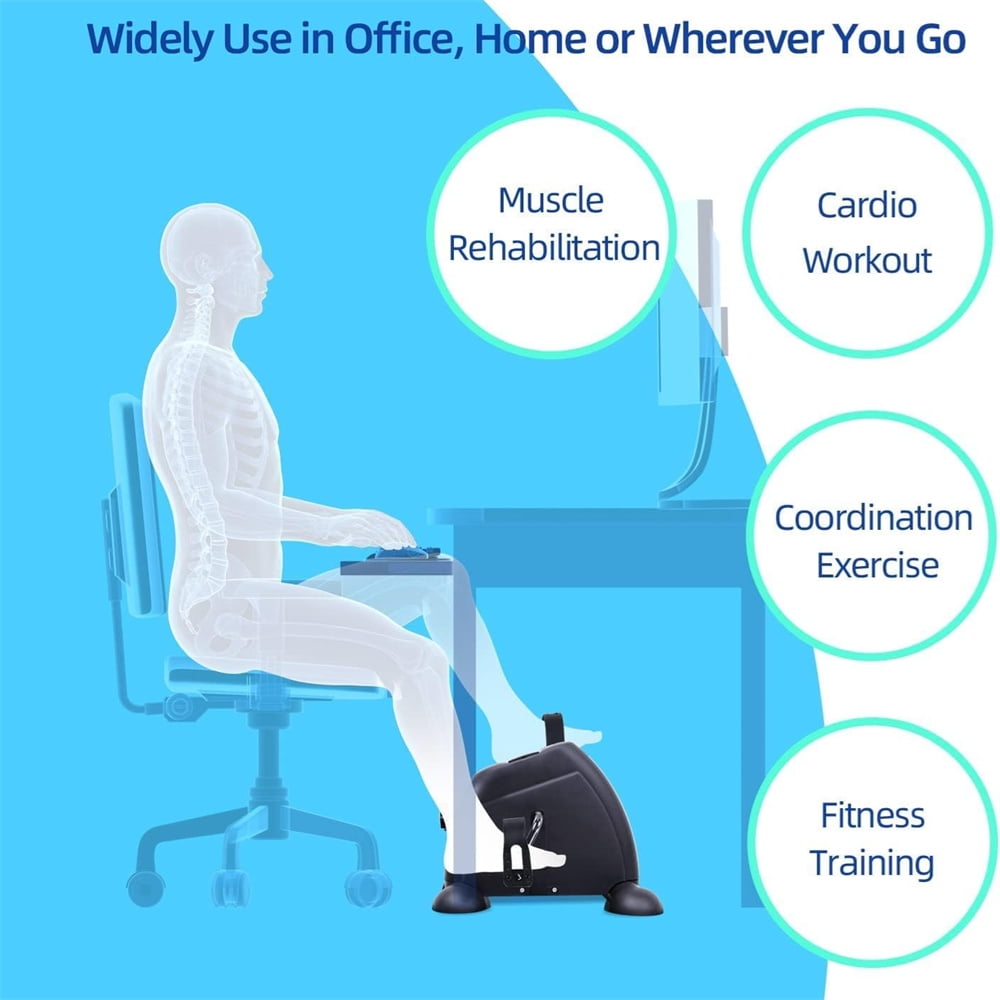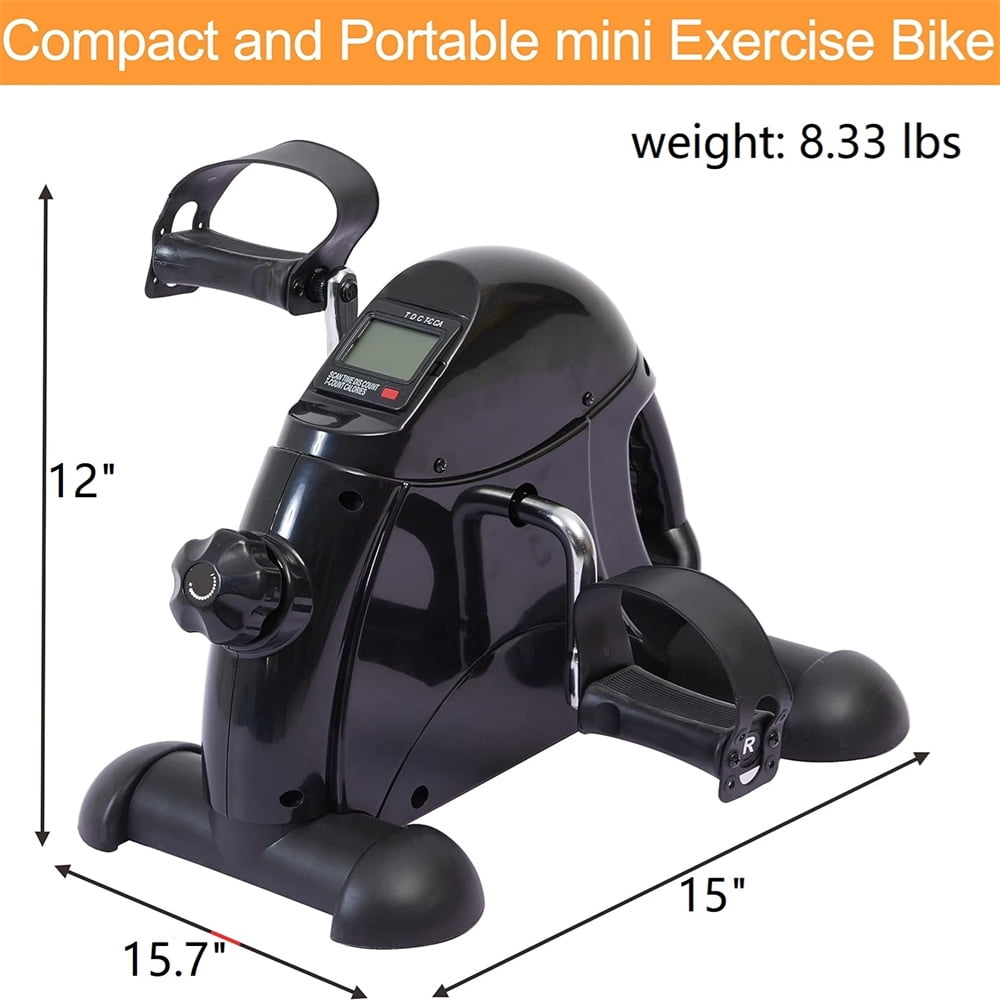 STATIONARY BIKES FOR HOME This under desk cycle combining arm and leg exercises, not only allows you to exercise to the muscles and joints of the knees, ankles, feet, but also can be served on the table to exercise the arms, wrists, shoulders and other joints. It is served for office workers, elderly people, people with sports injuries, and rehabilitators to do physical therapy to relieve pain, restore and maintain motor function. MULTIPLE STABILITY DESIGN Weighing only 8.33 pounds, This under desk bike pedal exerciser supports one-handed hold and release with non-slip pedals as well as non-slip feet for stability during exercise, and adjustable four-hole straps serve to protect both feet and hands for added comfort and safety, making it ideal for home use. NON-SLIP PEDALS This desk exercise equipment features non-slip rubber feet pads for added stability and to stop the mini bike from sliding when in use. Non-slip grips on the exercise bike pedals prevent hands and feet from slipping. ADJUSTABLE RESISTANCE The adjustable resistance knob of the exercise mini bike can meet different physical conditions and bring a personalized experience. No noise is made during exercise, which is great for beginners with this low impact exercise, ideal for rehabilitation after surgery or injury. Specially designed for the elderly and rehabilitators. MULTI-FUNCTIONAL DISPLAY The multi-function digital display can display time, distance, total count and calories through the buttons in use. Helps increase strength, improve coordination and circulation. Large and easy-to-read display can keep track of your workout progress easily and allow you to read all data clearly. PORTABLE AND EASY TO STORE Lightweight design, portable and easy to assemble. The portable handle function makes the fitness exercise bike always ready. Product size: 15″ x 15.7″ x 12″(LxWxH). You can put it under the desk, beside the sofa or in the locker. Small size and space saving – can be served at home or office. Specification: Material: Stainless Steel + Plastic Main Color: Black Size: 15″ x 15.7″ x 12″(LxWxH) Weight: 8.33 lbs Power supply for electronic watch: 1 x AAA battery(not included battery) Package List: 1 x Main body 2 x Pedal 2 x Front and rear pads 1 x Instruction 5 x Screw 5 x Gasket 2 x Tools