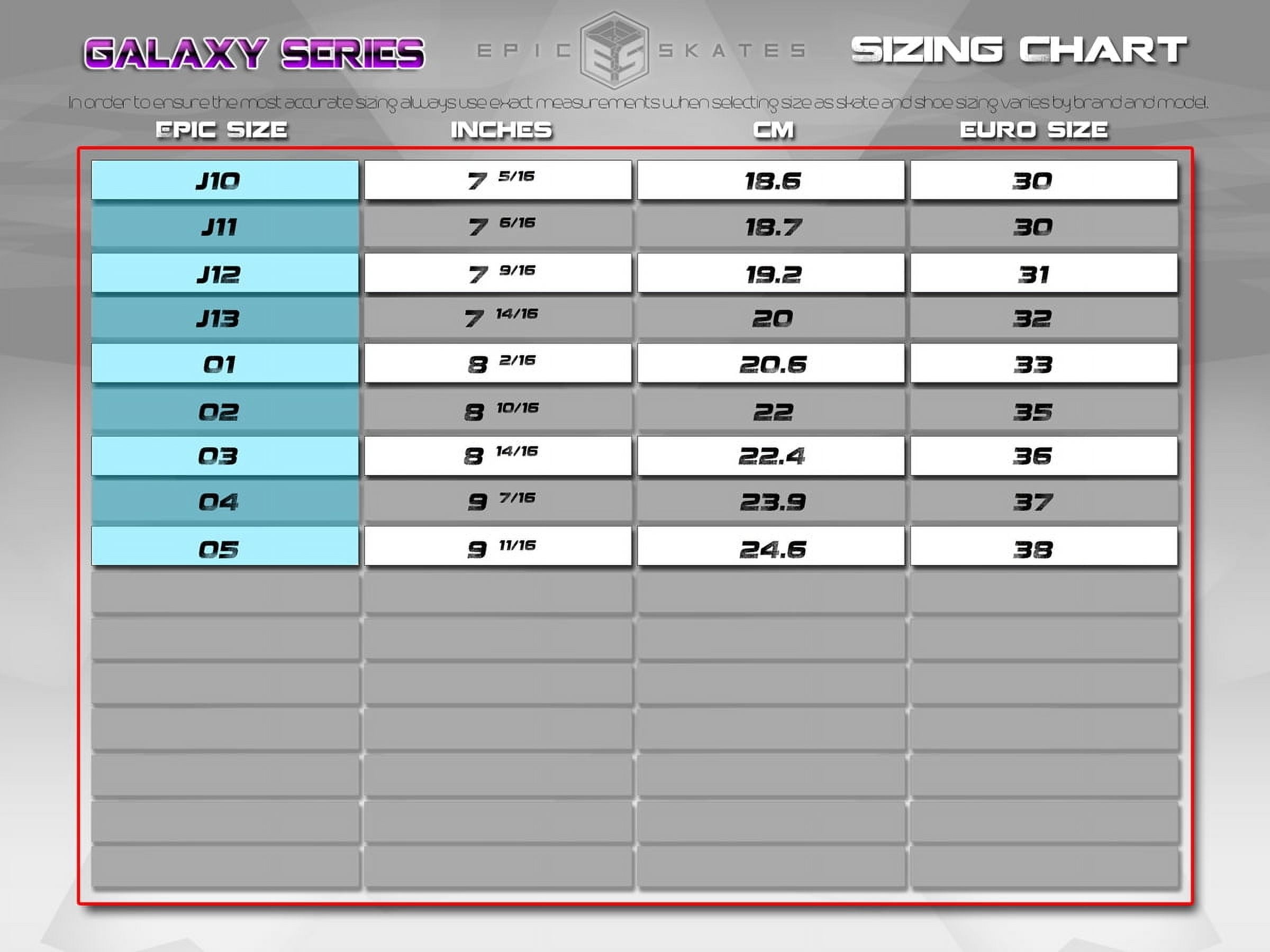 Epic Galaxy Elite Purple Quad Speed Roller Skates: Comfortable padded boot Mid top boot design Colorful man-made uppers Purple with white highlights Plates: Epic nylon Lightweight nylon Double action trucks White with white cushions Wheels: Epic galaxy Quad roller skate wheels Polyurethane compound Purple with white For use on indoor and outdoor surfaces Bearings: Epic ABEC-3 8mm axle size Precision speed bearings Toe stops: Epic fixed toe stops Non-adjustable toe stops Non-marking compound White, kids sizes Epic skates run true to size For more information regarding sizing please visit our website at or contact us directly