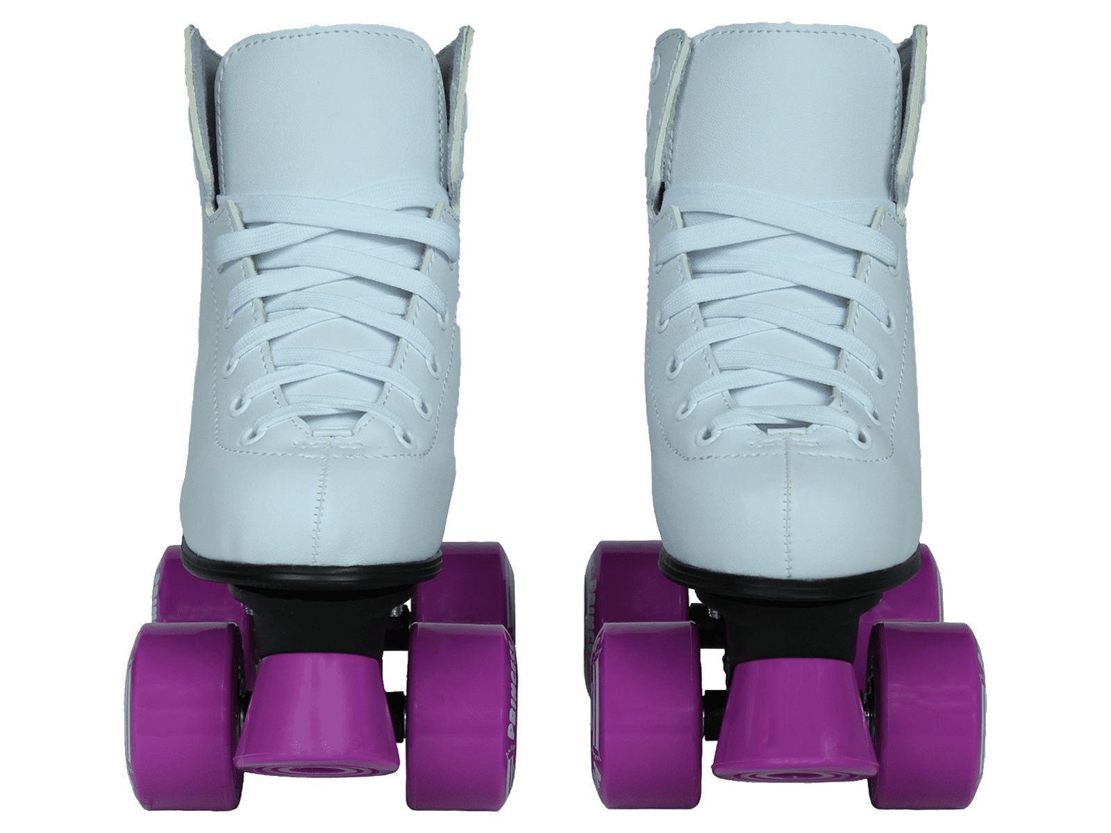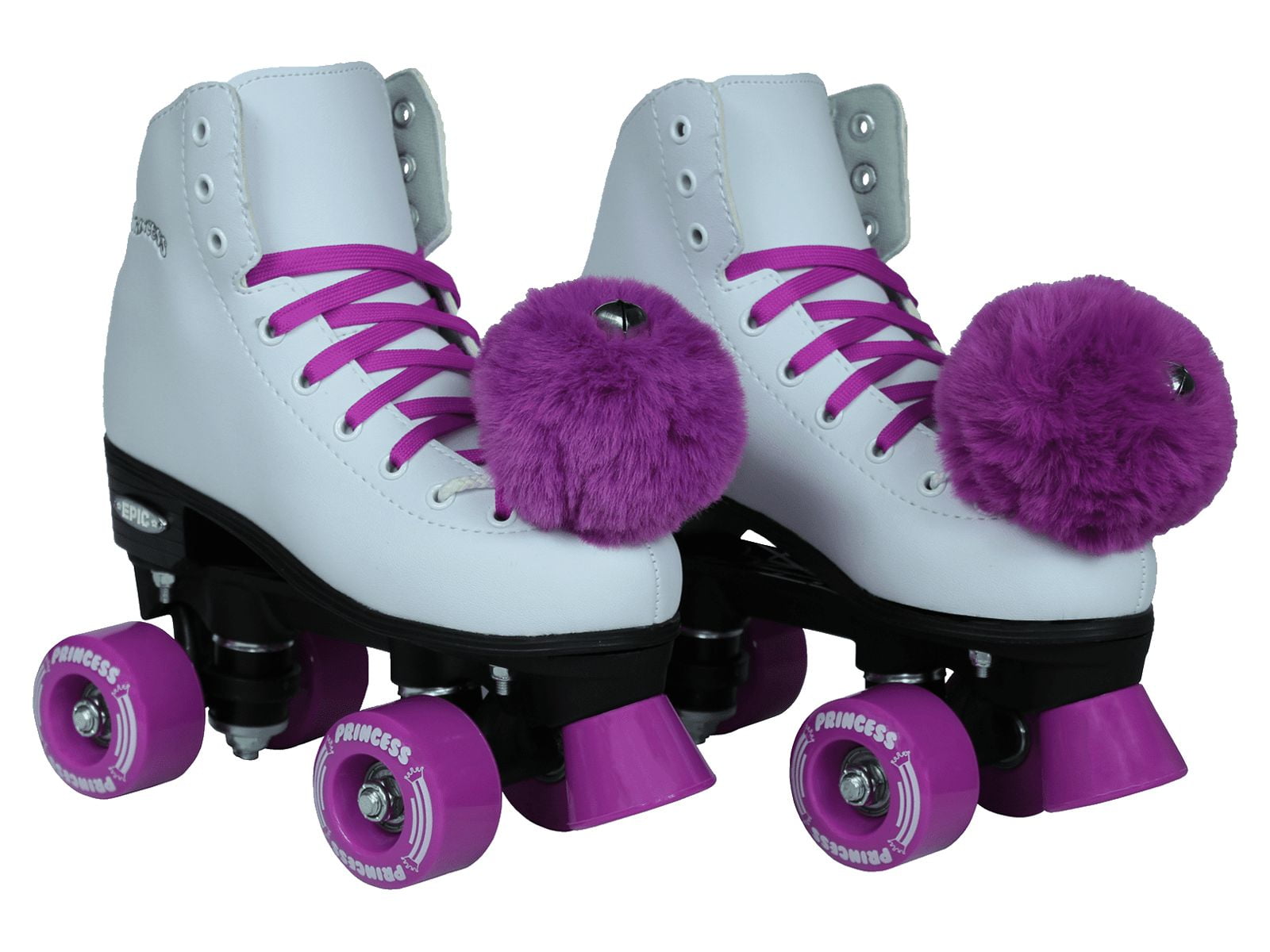 Epic Purple Princess Quad Roller Skates are exactly what you are looking for in a quality, affordable, classic quad roller skate for your little skater. Girls love this all-white classic roller skate with purple roller skate wheels and pom-poms. This classic-designed roller skate for girls is a great choice for beginner to intermediate level skaters. Epic Princess roller skates all come standard with two sets of laces and a set of pom-poms in addition to the indoor/outdoor polyurethane wheels, ABEC 3 bearings, nylon plates and double action trucks. As one of the most popular girls roller skates, the Epic Purple Princess sells out fast, so order yours today!