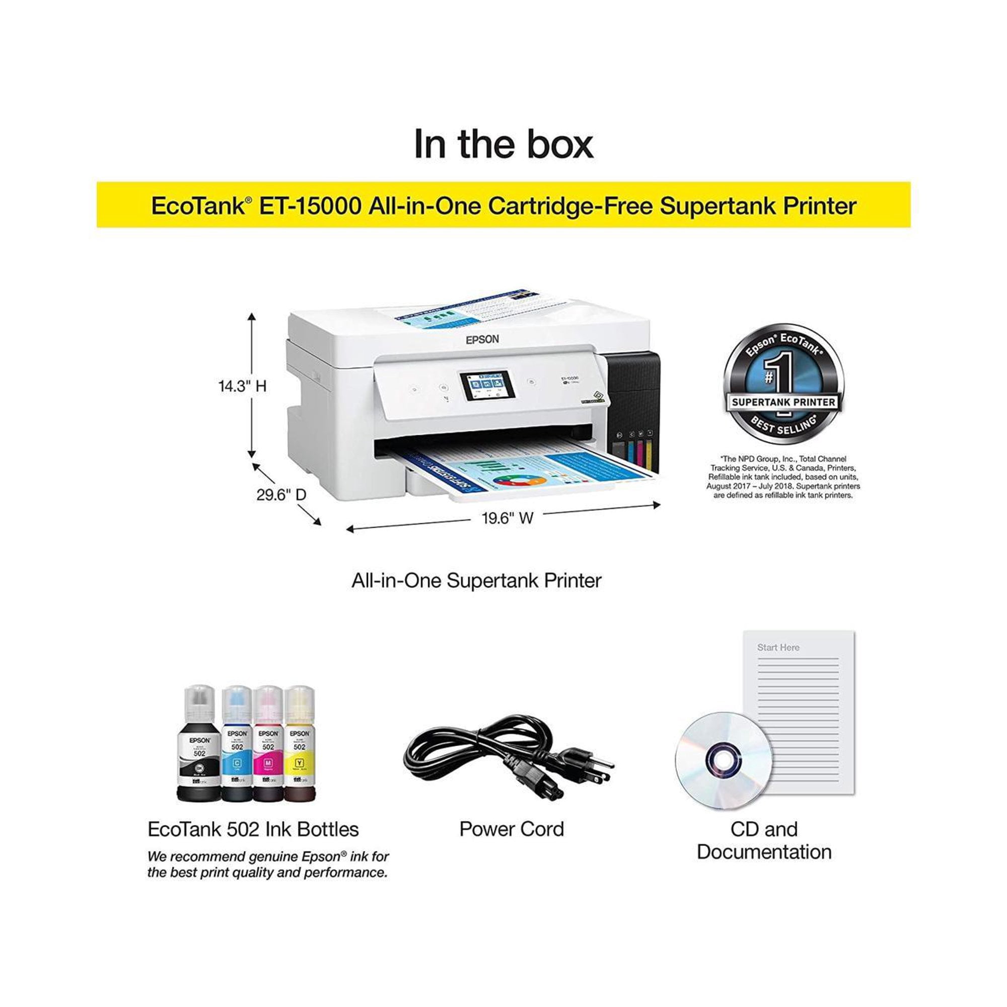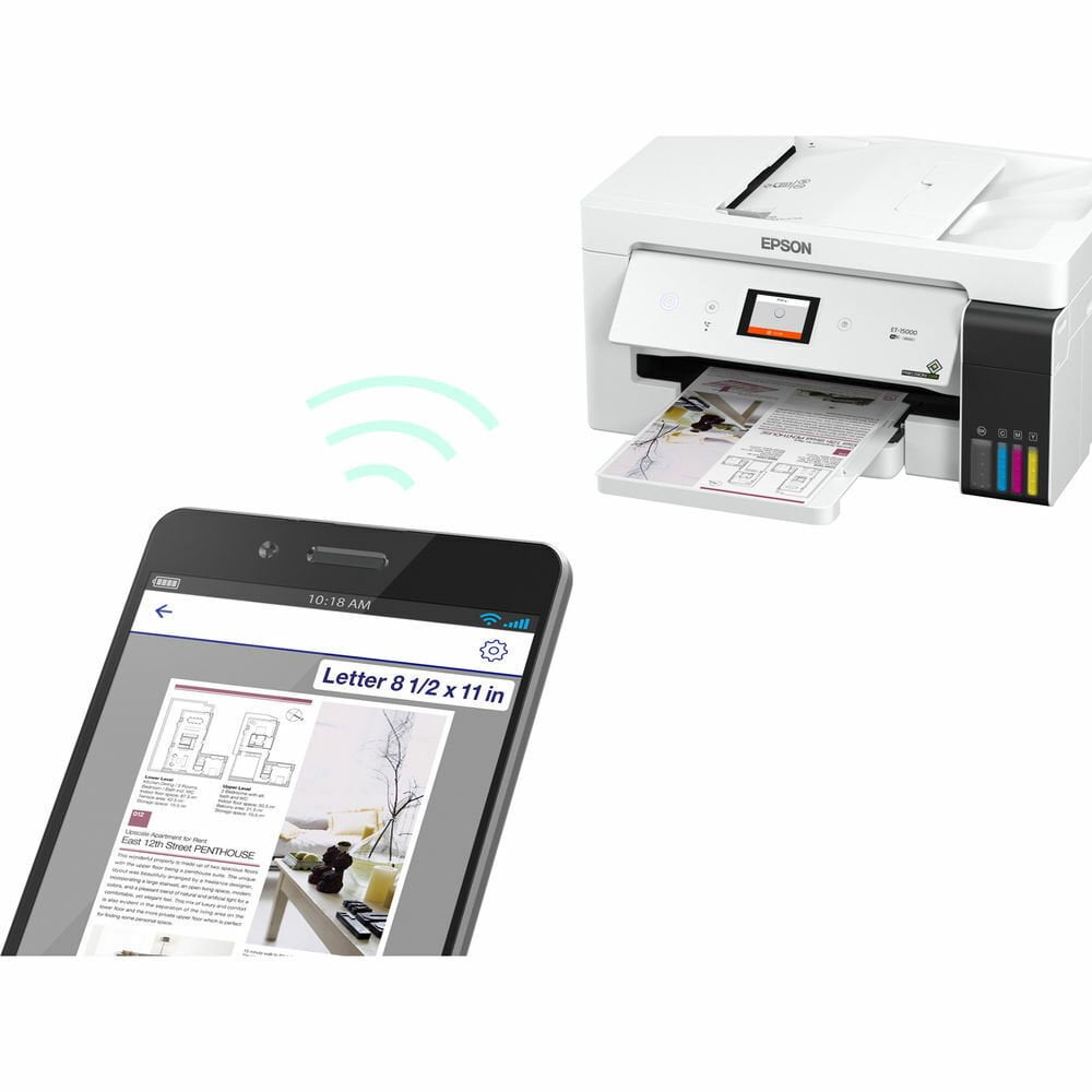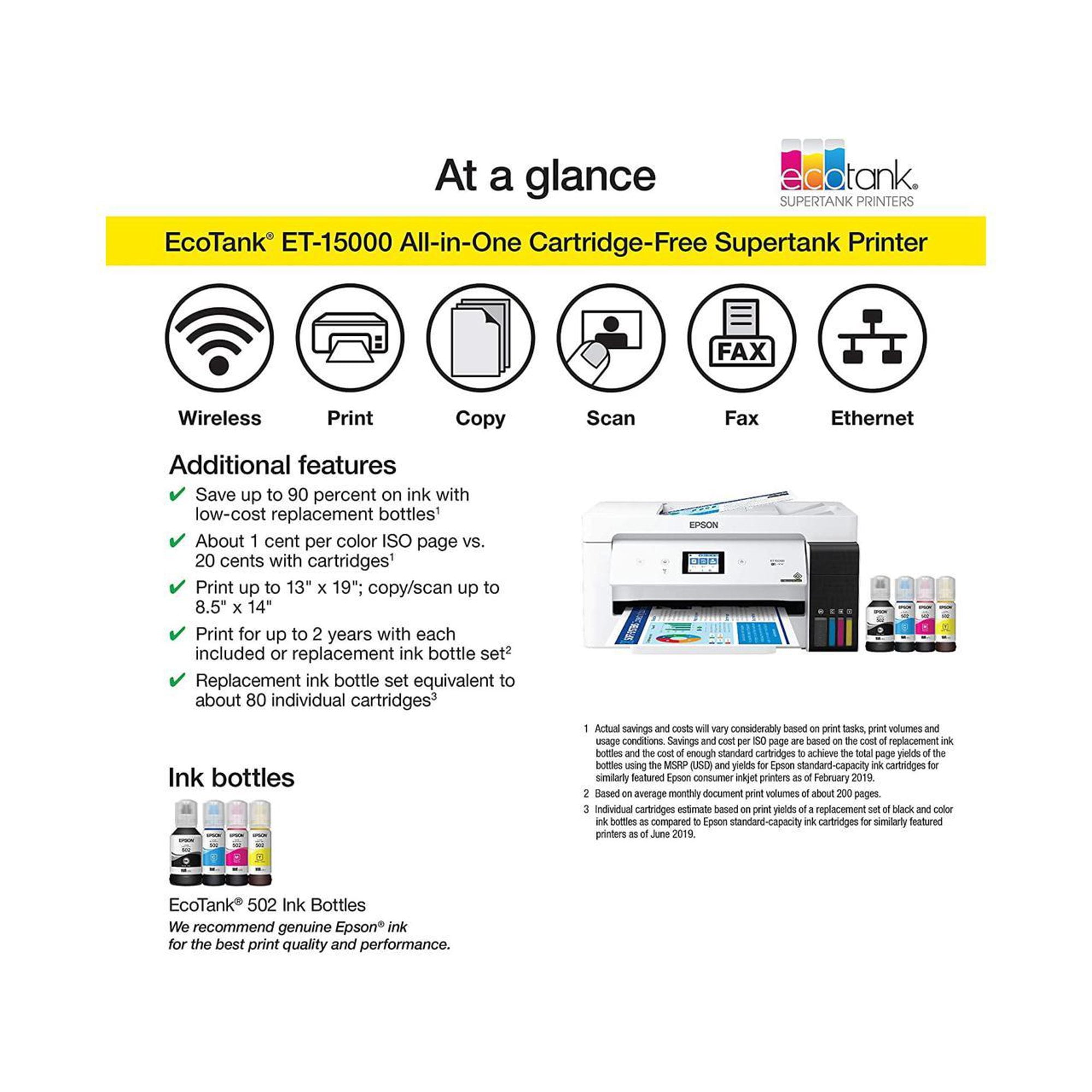 Mobile Device Printing: Yes; Networking: Wired, Wireless; ENERGY STAR Certified: Yes; Printer Type: All In One; ISO Color Print Speed: 9 pages per minute; ISO Mono Print Speed: 17 pages per minute; Touch Screen: Yes; Printer Connectivity: Apple AirPrint, Epson iPrint, Ethernet, Google Cloud Print, Mopria Print Service, USB 2.0, Wi-Fi, Wi-Fi Direct; Portable: No; Automatic Document Feeder: Yes; Photo Printing: Yes; Monochromatic/Color: Color; Automatic Reduction/Enlargement: Yes; Automatic Two-Sided Printing: Yes; Tray Capacity: 270; Drop Size: 3.3 picoliters. Scanner Type: Flatbed Scanner Resolution: Up to 1200 x 2400 Integrated Fax: Yes Compatible Cartridges: Epson 502 Black ink bottle, Epson 502 Magenta ink bottle, Epson 502 Cyan ink bottle, Epson 502 Yellow ink bottle; Number of Ink Bottles/Tanks Required: 4; Number of Ink Bottles/Tanks Included: 4; Automatic Document Feeder Capacity: 35 sheets; Maximum Document Length: 47.24 inches; Maximum Document Width: 12.95 inches; Supported Paper Sizes: A6, Half letter, Letter, A4, Executive, Legal Paper Feeder: Cassette; Paper Handling: 250-sheet input cassette, 20-sheet rear feed; Compatible Media Types: Ultra Premium Photo Paper Glossy, Ultra Premium Photo Paper Luster, Premium Photo Paper Glossy, Premium Photo Paper Semigloss, Photo Paper Glossy, Value Glossy Photo Paper, Velvet Fine Art Paper, Ultra Premium Presentation Paper Matte, Premium Presentation Paper Matte, Presentation Paper Matte, Brochure and Flyer Paper Matte, Bright White Pro Paper, Bright White Premium Paper, Multipurpose Plus Paper; Maximum Number Of Copies: 99; Printer Resolution (Black): Up to 4800 x 1200; Printer Resolution (Color): Up to 4800 x 1200; Included Software: Epson printer driver, Epson Scan 2, PC-Fax, ScanSmart. What’s Included: Epson EcoTank ET-15000 Wireless All-In-One Inkjet Printer; Bottle of Epson 502 Black ink (127 mL); One bottle each of Epson 502 Cyan, Magenta, Yellow (70 mL) ink; Power cord; Owner’s manual.