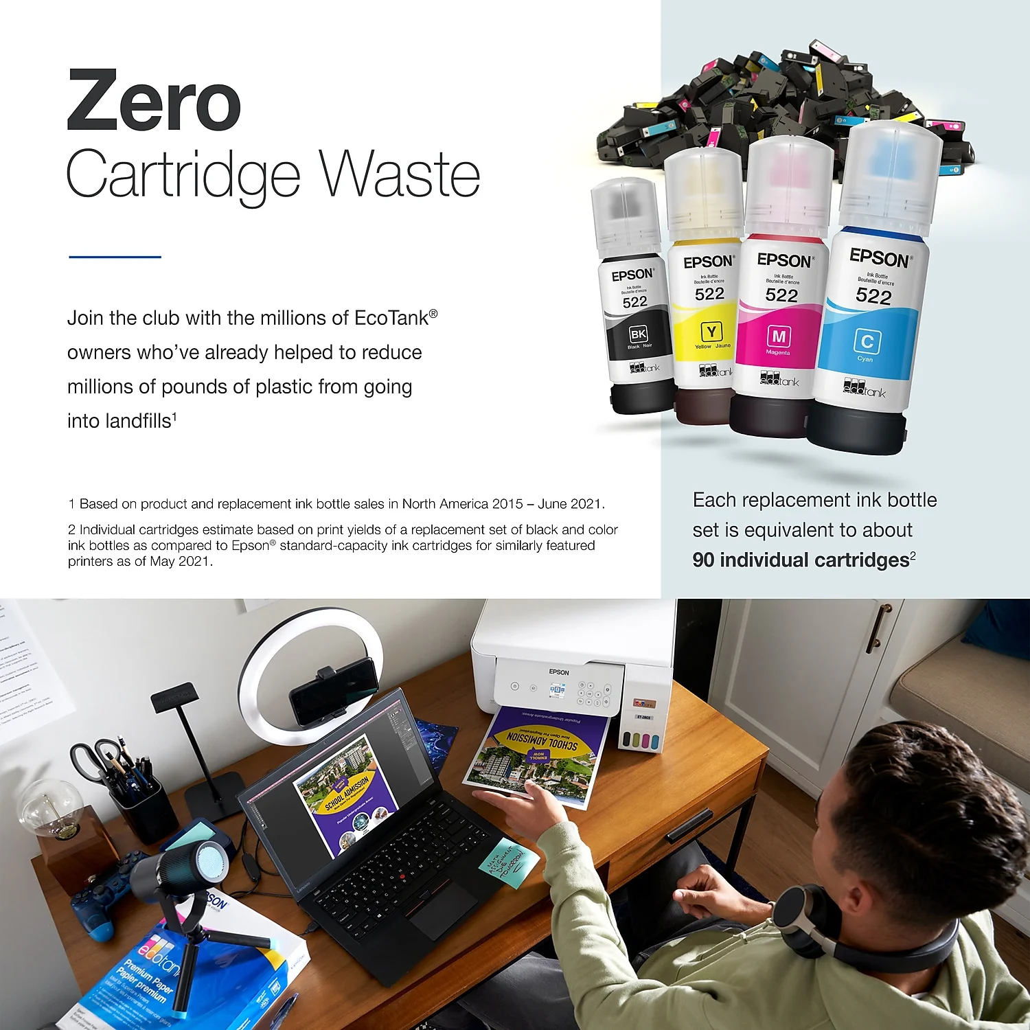 Innovative Cartridge-Free Printing ? High-capacity ink tanks mean no more tiny, expensive ink cartridges; Epson?s exclusive EcoFit ink bottles make filling easy and worry-free Dramatic Savings on Replacement Ink ? Save up to 90% with replacement ink bottles vs. ink cartridges (1) ? that?s enough to print up to 4,500 pages black/7,500 color (2), equivalent to about 90 individual ink cartridges (3) Stress-Free Printing ? Up to 2 years of ink in the box (4) ? and with every replacement ink set ? for fewer out of ink frustrations Zero Cartridge Waste ? By using an EcoTank printer, you can help reduce the amount of cartridge waste ending up in landfills Impressive Print Quality ? Unique Micro Piezo Heat-Free Technology produces sharp text ? plus impressive color photos and graphics ? on virtually any paper type Built-in Scanner & Copier ? High-resolution flatbed scanner and a color display for easy document copying and navigation Modern Connectivity ? Features wireless, plus hands-free voice-activated printing (5). Easily print from your smart device (6) using AirPrint or the intuitive Epson Smart Panel App (7) Designed for Reliability ? Worry-free 2-year limited warranty with registration (8), including full unit replacement Genuine Epson Ink ? For genuine Epson quality; use of non-genuine ink could cause damage not covered under the printer?s limited warranty