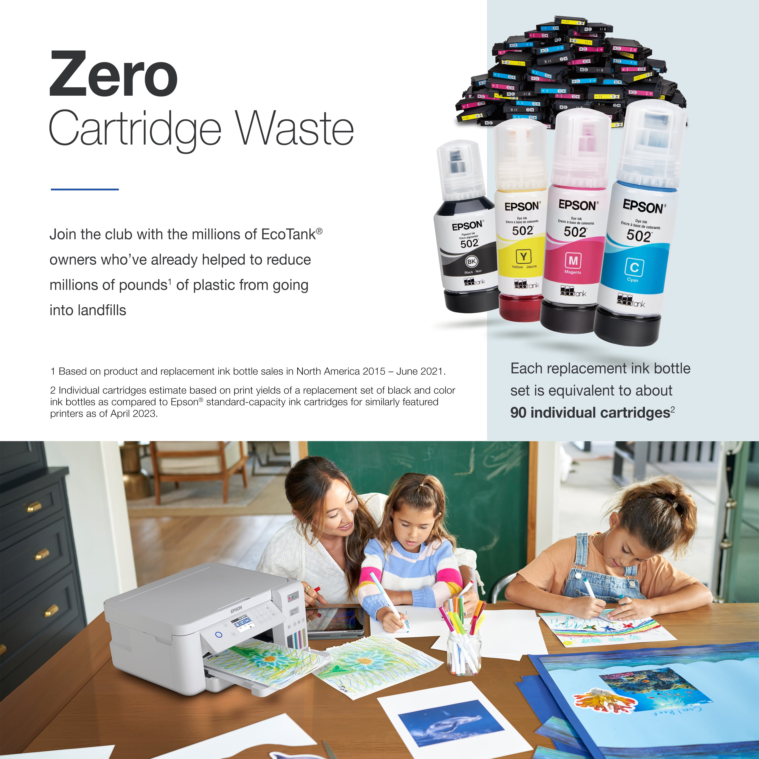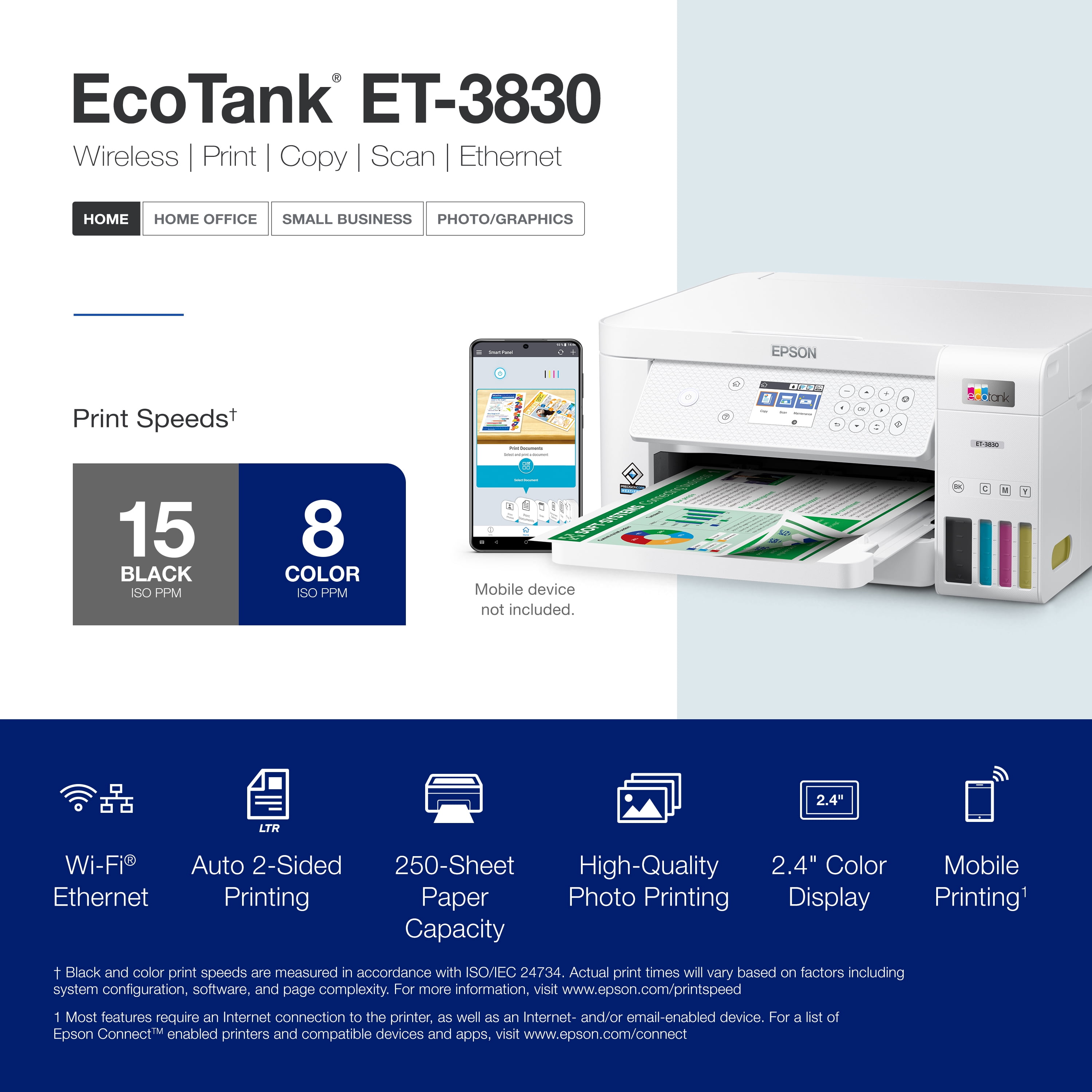 Innovative Cartridge-Free Printing ? High-capacity ink tanks mean no more tiny, expensive ink cartridges; Epson?s exclusive EcoFit ink bottles make filling easy and worry-free Dramatic Savings on Replacement Ink ? Save up to 90% with replacement ink bottles vs. ink cartridges (1) ? that?s enough to print up to 7,500 pages black/6,000 color (2), equivalent to about 90 individual ink cartridges (3) Stress-Free Printing ? Up to 2 years of ink in the box (4) ? and with every replacement ink set ? for fewer out of ink frustrations Zero Cartridge Waste ? By using an EcoTank printer, you can help reduce the amount of cartridge waste ending up in landfills Impressive Print Quality ? Unique PrecisionCore Heat-Free Technology and pigment black ink produce extremely sharp text ? plus impressive color photos and graphics ? on virtually any paper type Robust Paper Handling ? Paper-saving auto 2-sided printing and a 250-sheet paper tray for higher productivity Built-in Scanner & Copier ? High-resolution flatbed scanner and a 2.4″ color display for easy document copying and navigation Modern Connectivity ? Features Ethernet and wireless, plus hands-free voice-activated printing (5). Easily print from your smart device (6) with the intuitive Epson Smart Panel App (7) Designed for Reliability ? Worry-free 2-year limited warranty with registration (8), including full unit replacement