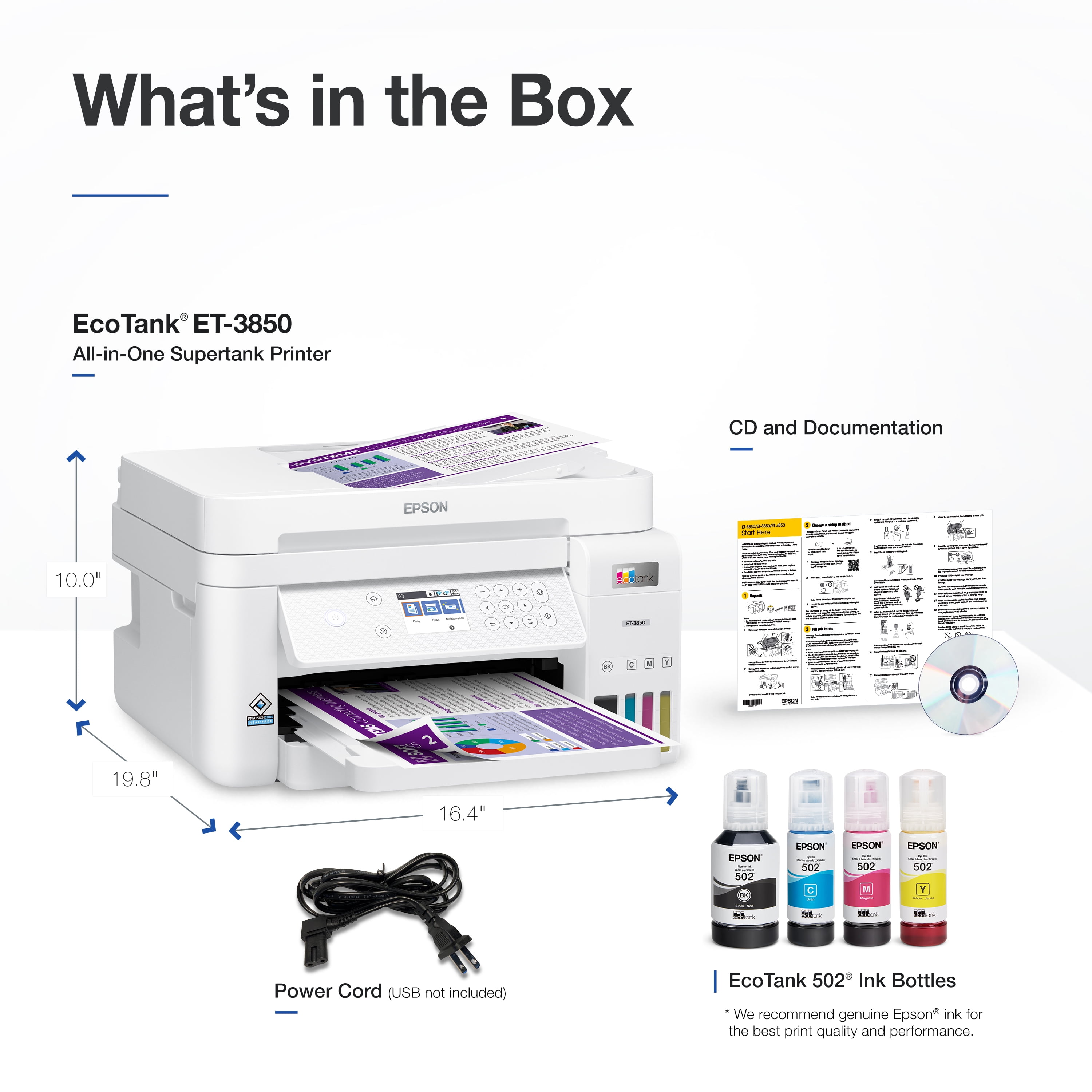 Epson EcoTank ET-3850 Wireless Color All-in-One Cartridge-Free Supertank Printer with Scanner, Copier, ADF and Ethernet