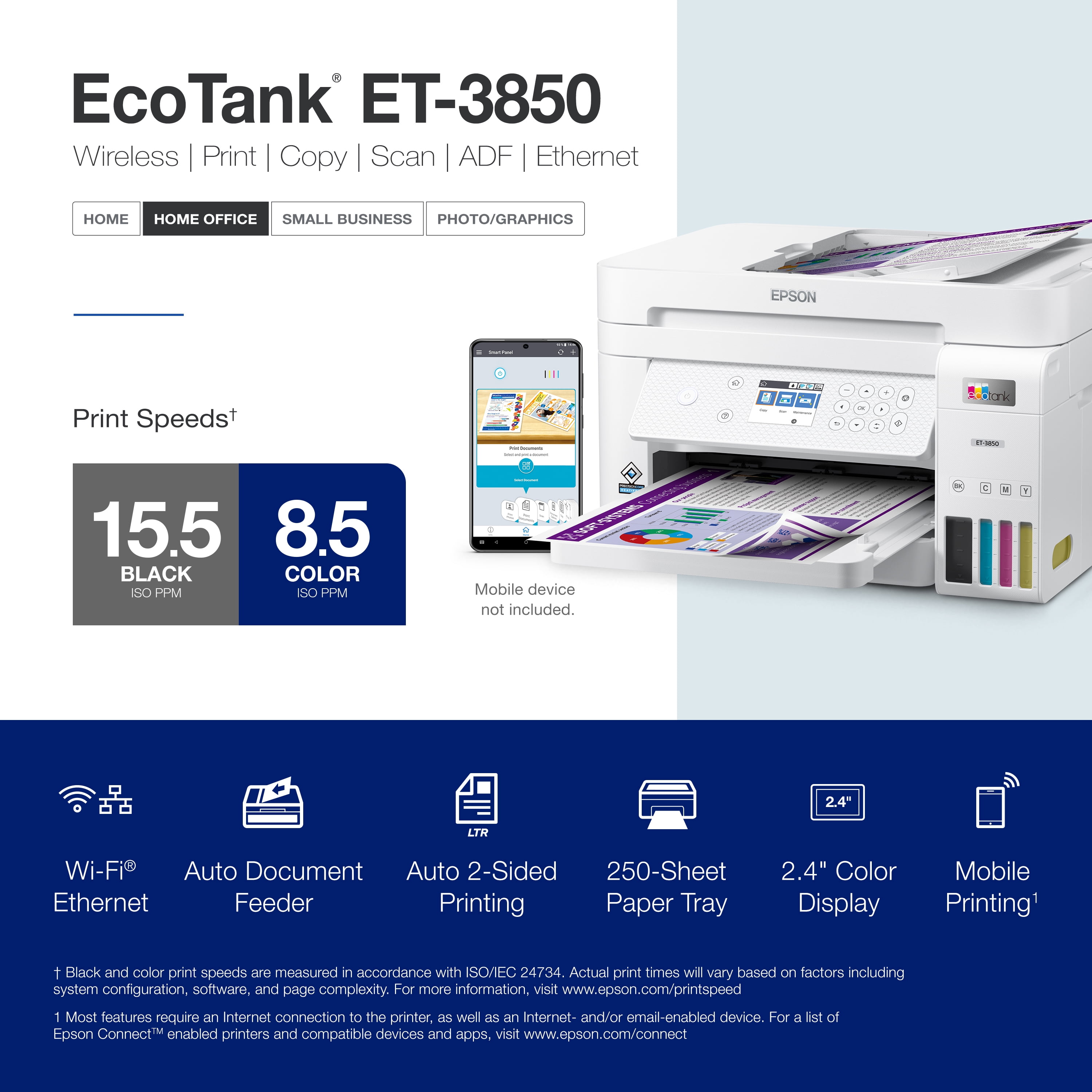 Your busy office needs a printer that?s fast, affordable, easy to use, and has great features. That?s why we developed the EcoTank ET-3850 ? an innovative cartridge-free solution that uses high-capacity, easily refillable ink tanks. So you?ll worry less about running out of ink, and save a lot on replacement ink (1). The ET-3850 features an auto document feeder, fast printing with outstanding print quality, productive paper handling, a high-resolution flatbed scanner, and a large color display ? making it the perfect printer for your home office.
