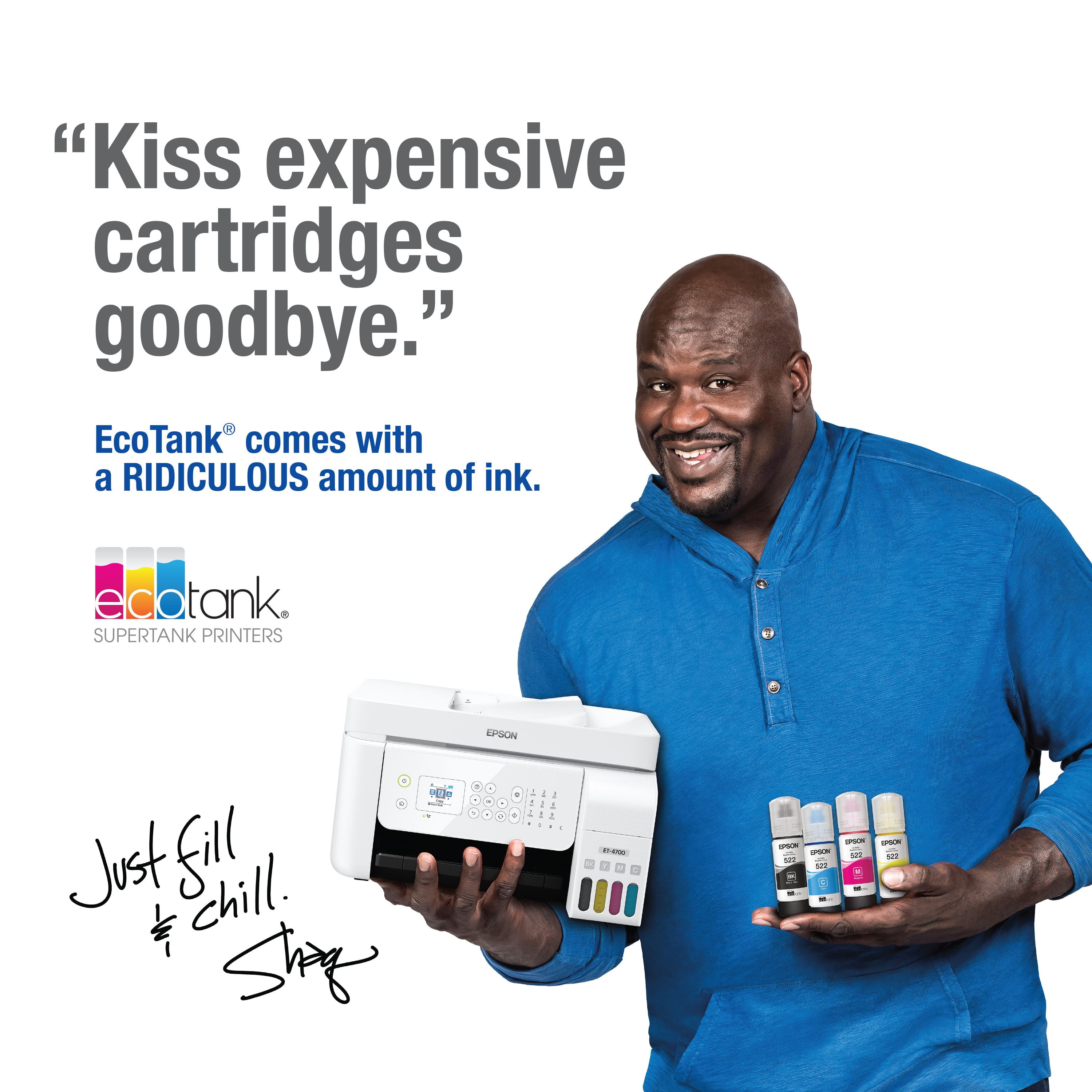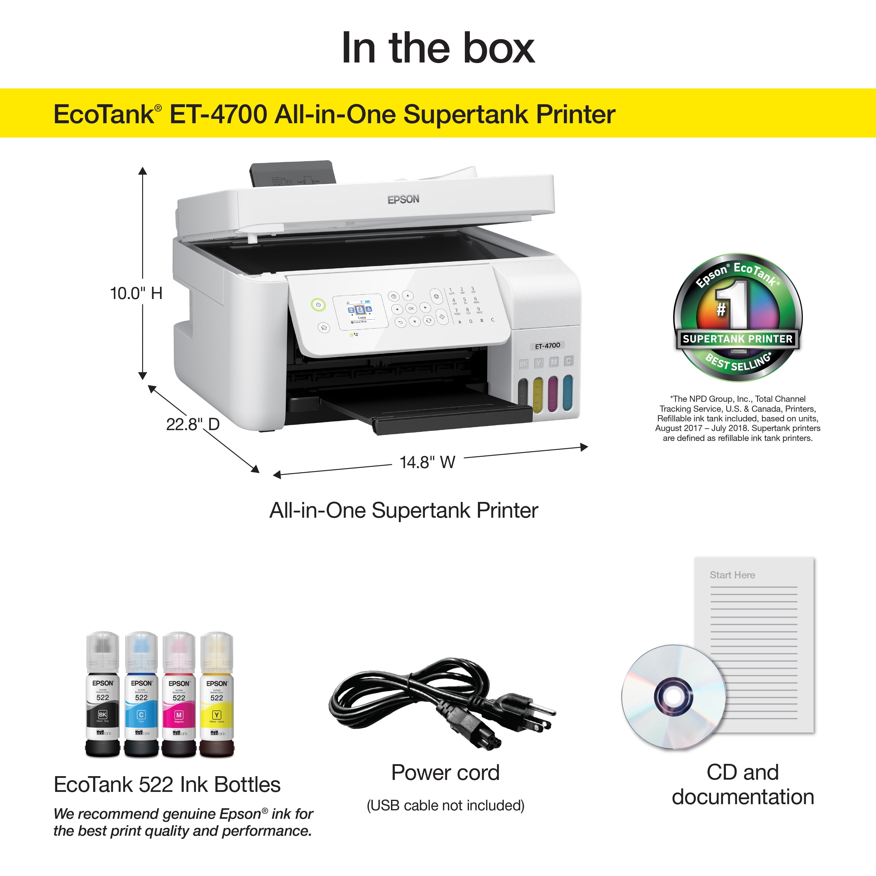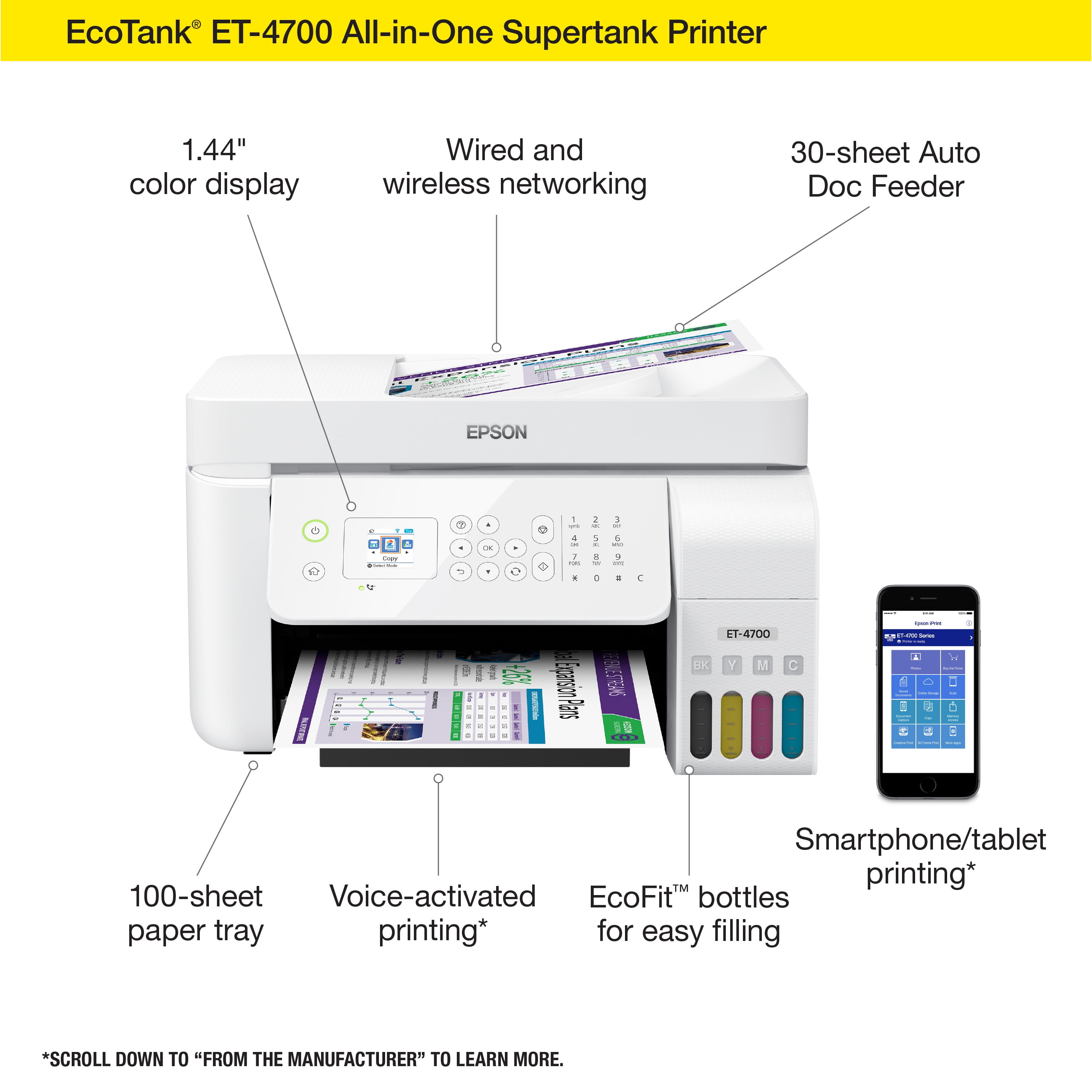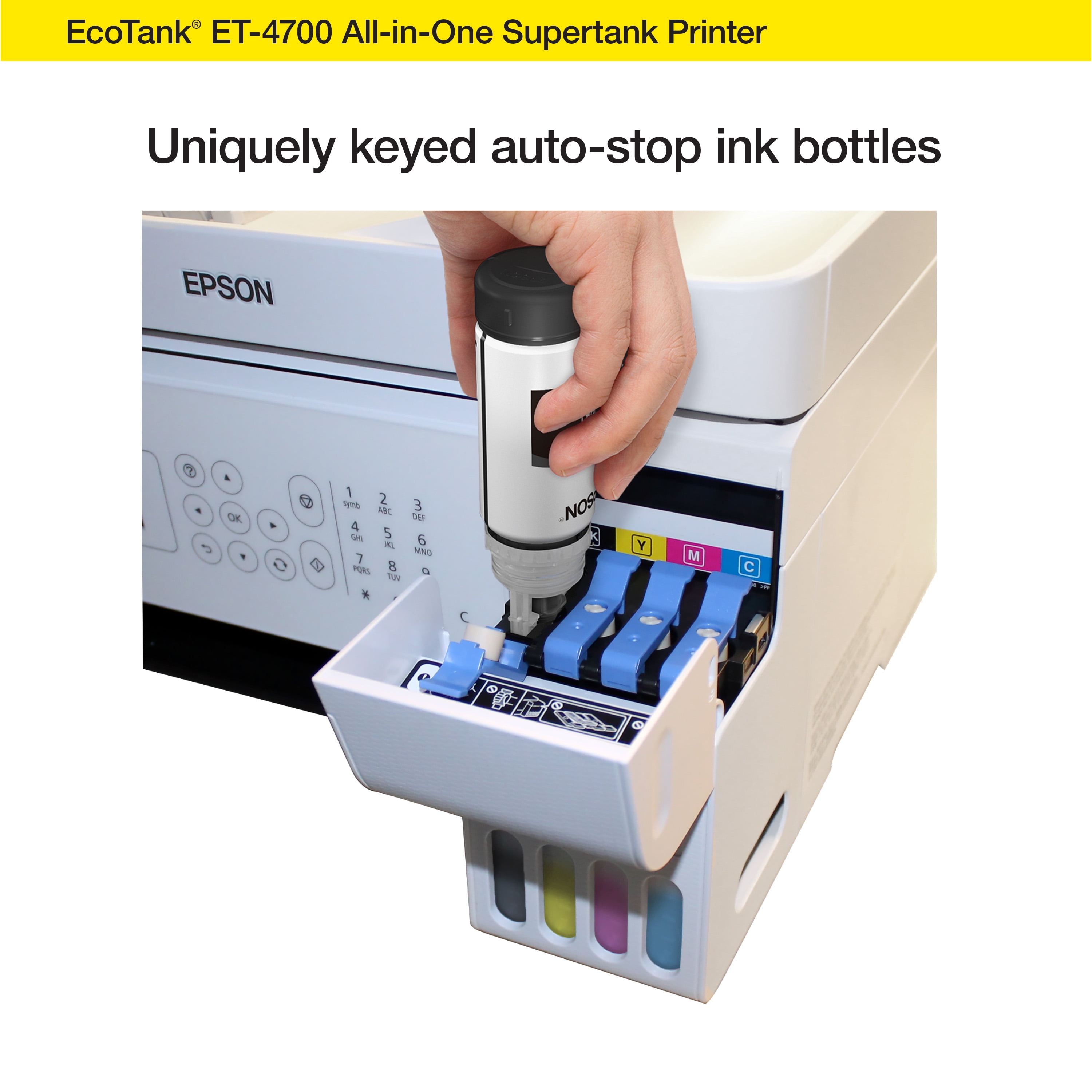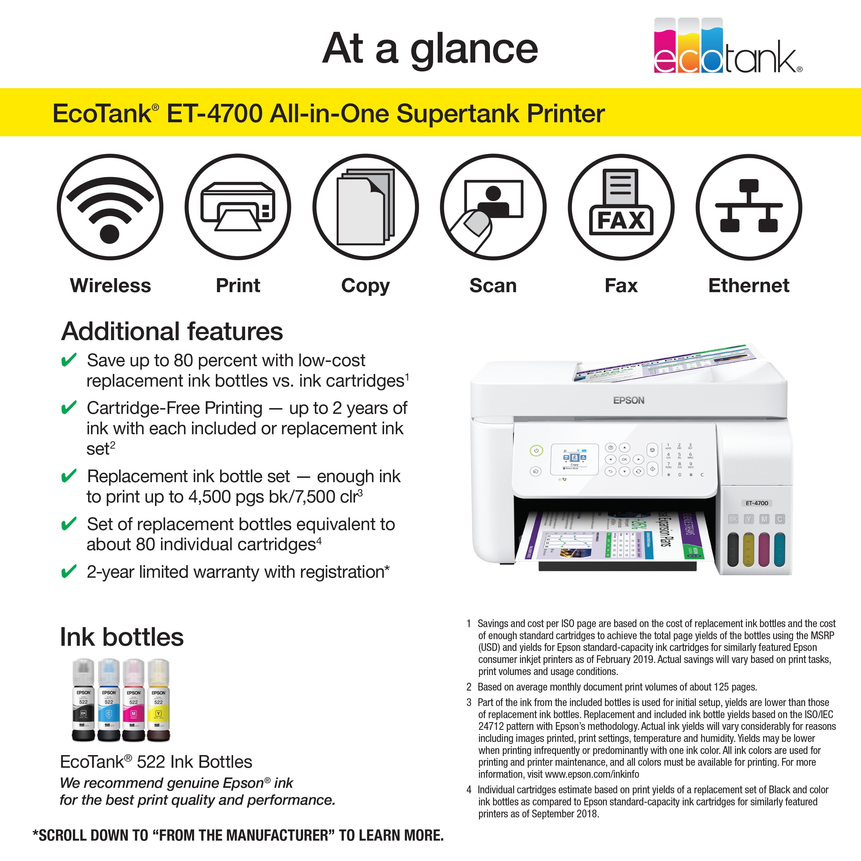 The EcoTank ET-4700 wireless all-in-one supertank printer offers Cartridge-Free Printing with easy-to-fill, supersized ink tanks. You get up to 2 years of ink with each included or replacement ink set1. And, each replacement ink bottle set includes enough ink to print up to 4,500 pages2 equivalent to about 80 individual cartridges3. Plus, you save up to 80 percent with low-cost replacement ink bottles vs. ink cartridges4. That means less waste. Exclusive uniquely keyed EcoFit bottles make it easy to fill each color tank. The ET-4700 also offers a 30-sheet ADF, wired and wireless networking and a 2-year limited warranty with registration5.