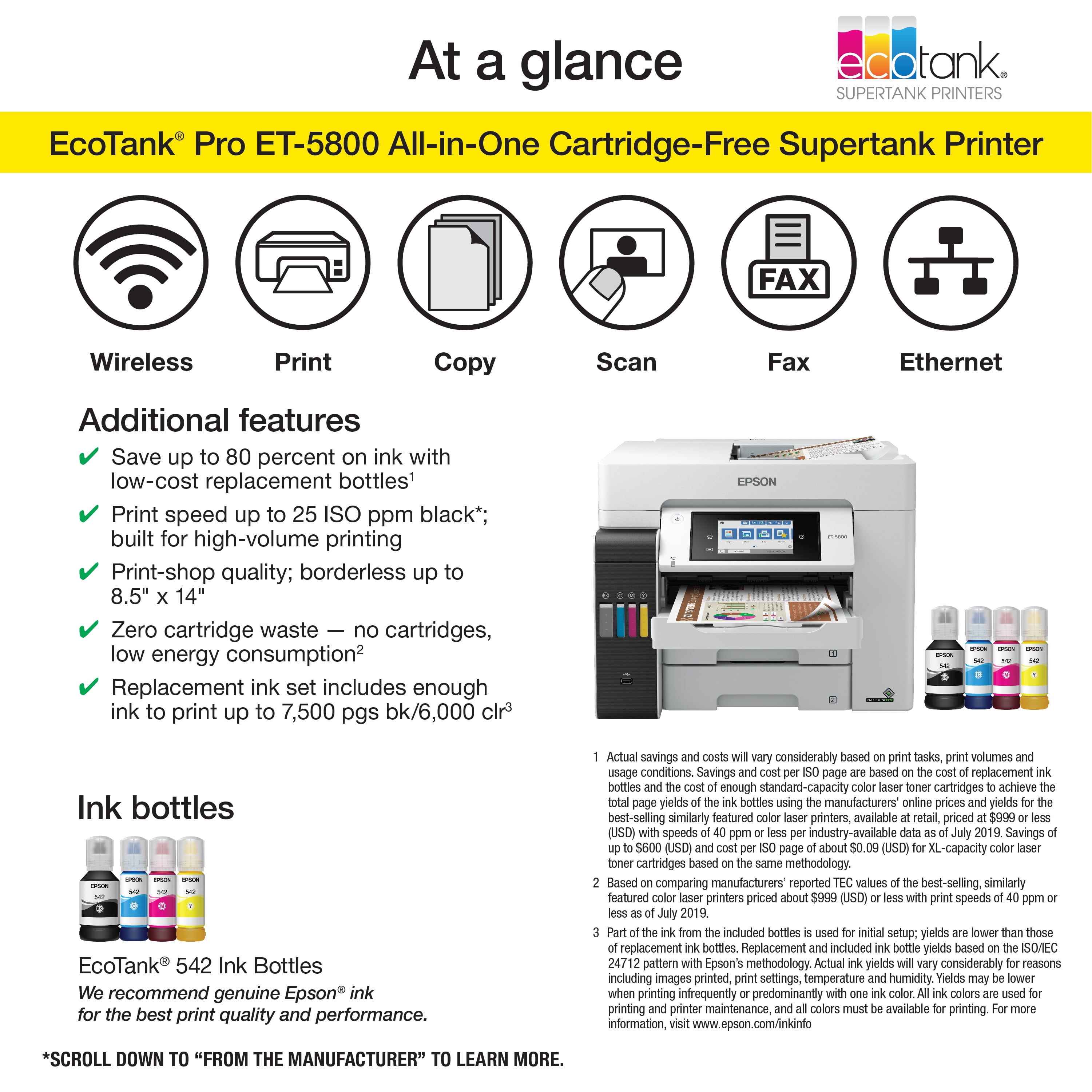 1. You can save up to 80 percent with low-cost replacement ink bottles vs. standard-capacity color laser toner cartridges1 — very low cost per page with about 2 cents per color ISO page vs. 14 cents with cartridges1 2. Fast print speed — powered by PrecisionCore Heat-Free Technology; up to 25 ISO ppm blackƚ; no warmup time for fast first page out 3. Print-shop quality — Epson DURABrite Inks are pigment-based for crisp, vibrant prints in black-and-white and color that are instant-dry; borderless prints up to 8.5″ x 14″ 4. Less waste — zero-cartridge waste with high-yield ink bottles; very low energy consumption3 5. Set of replacement bottles includes enough ink to print up to 7,500 pages black/6,000 color2 — for fewer out-of-ink frustrations; you could save $1,000 with each one1