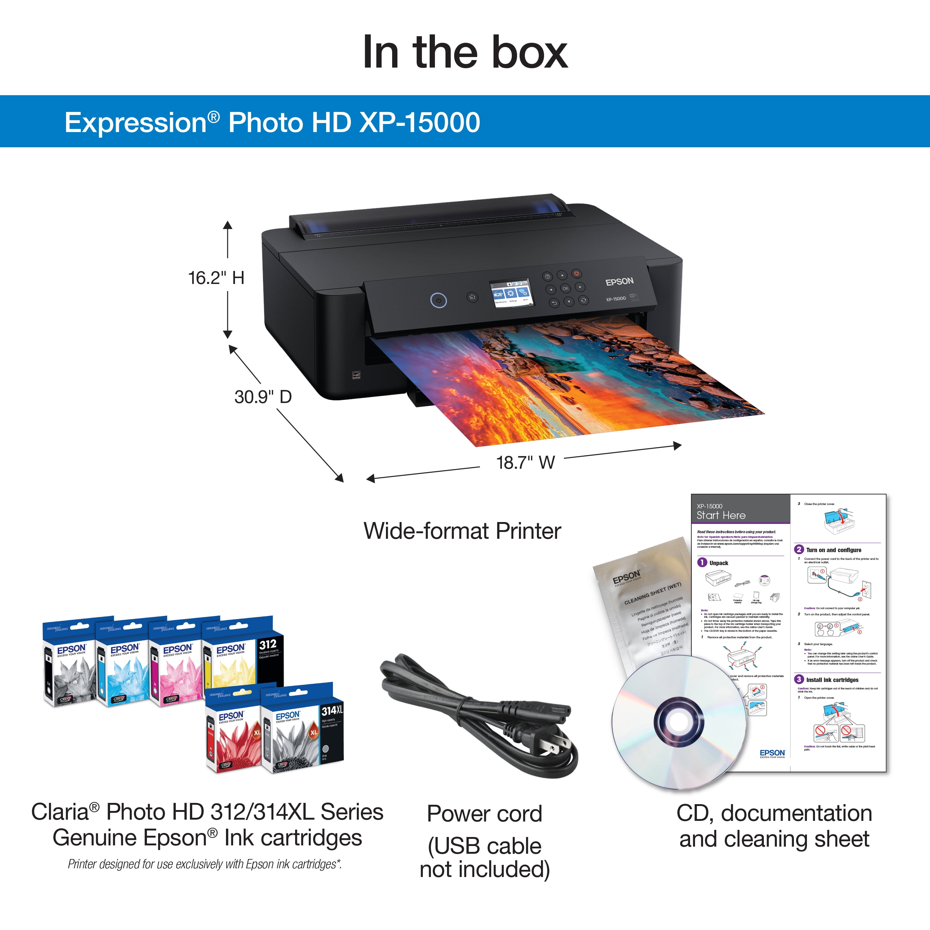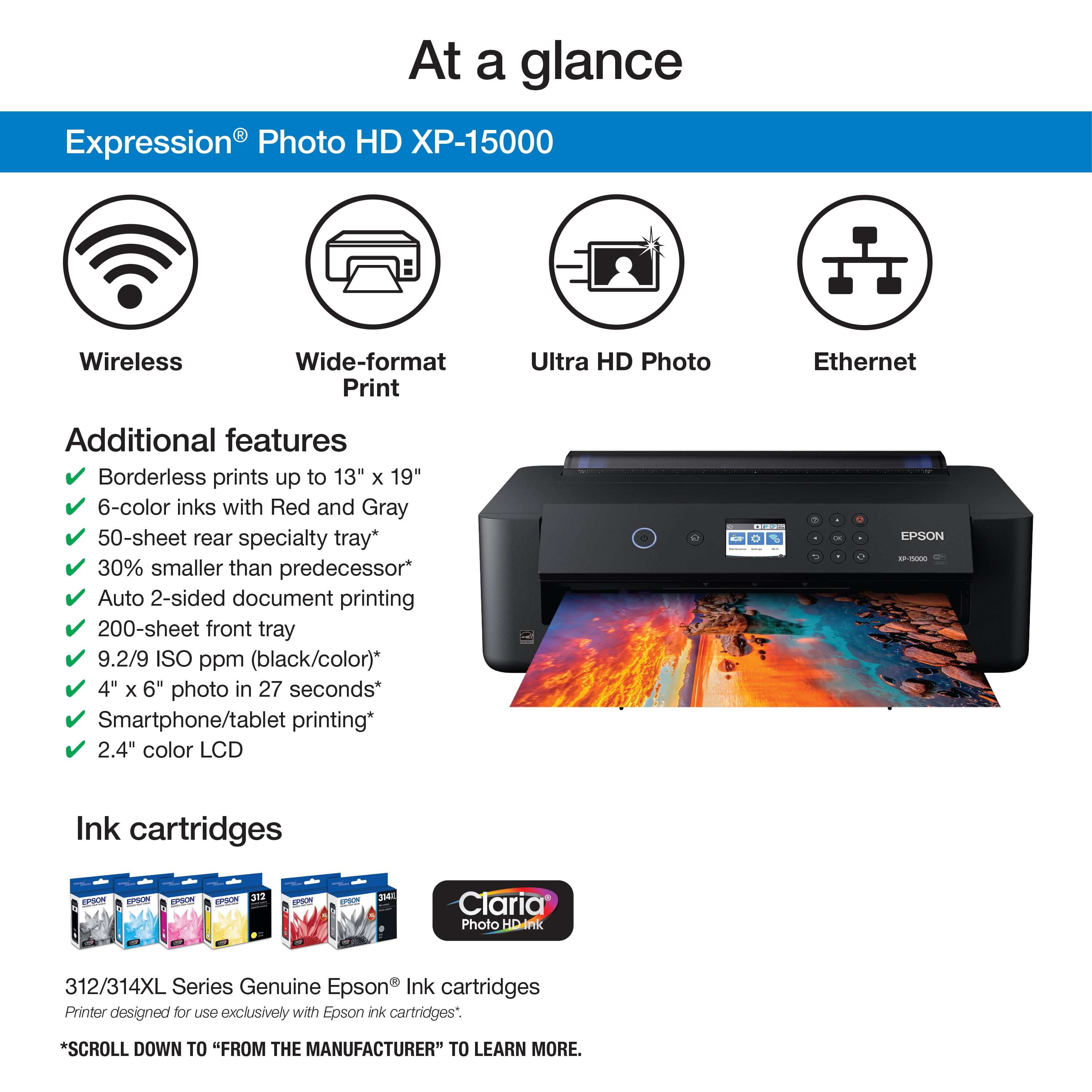 Take photo printing to new levels with the Expression Photo HD XP-15000 wireless wide-format printer, delivering brilliant, pro-quality borderless prints up 13 in x 19 in. Individual 6-color Claria® Photo HD Inks with all-new Red and Gray inks offer a wide color gamut and enhanced black-and-white photo printing. The large, 50-sheet rear specialty tray makes printing pro-quality projects easier than ever before even on cardstock1. And, with auto 2-sided printing, a 200-sheet front tray, and convenient wireless connectivity, printing stacks of documents is a breeze. Get all this, in a compact printer that’s 30 percent smaller than its predecessor. Individual 6-color Claria Photo HD Ink includes Red and Gray inks for an ultra-wide color gamut and enhanced black-and-white prints. Professional projects made easy feature a 50-sheet rear tray for specialty media, including cardstock1 accommodates a variety of paper finishes and borderless sizes from 4 in x 6 in to 13 in x 19.