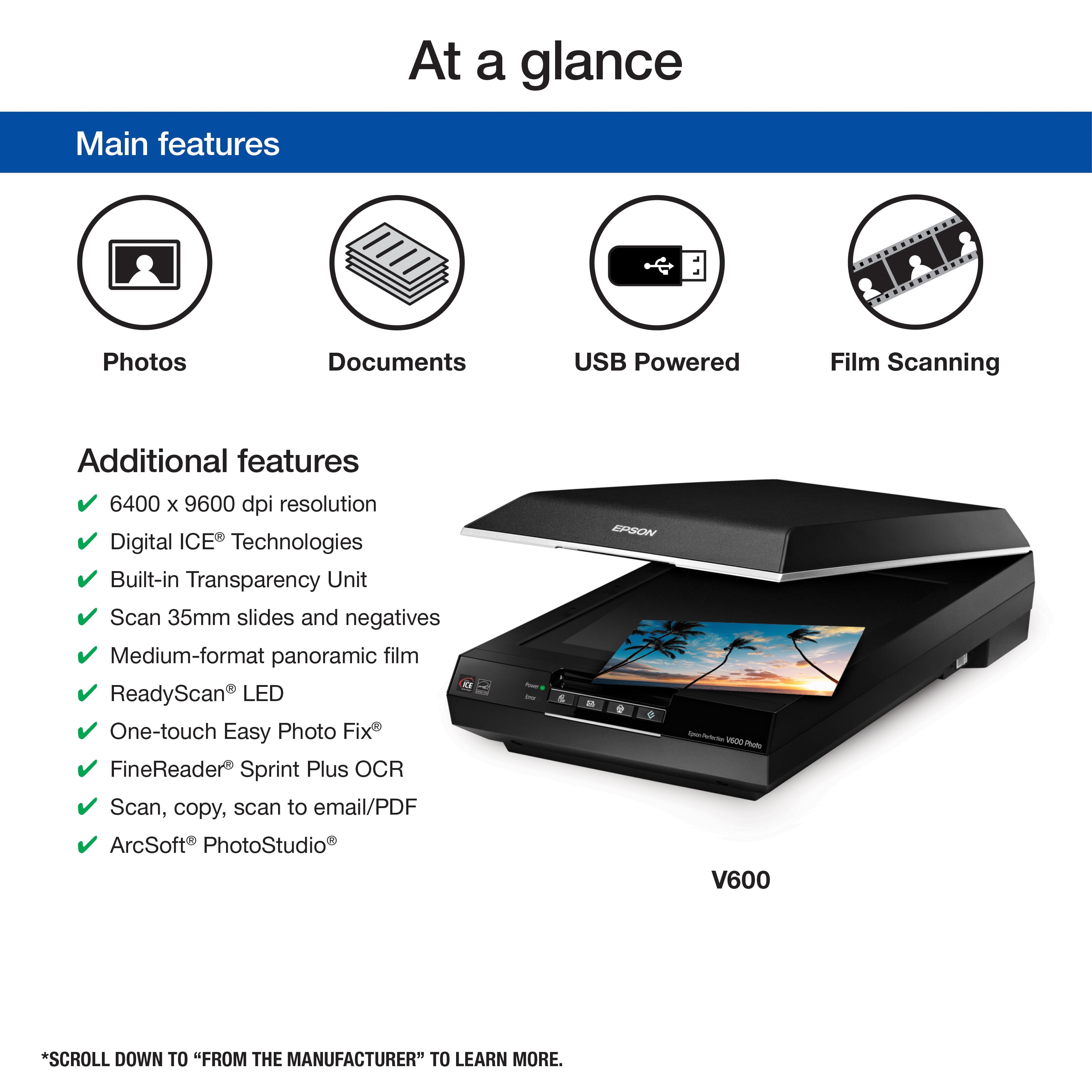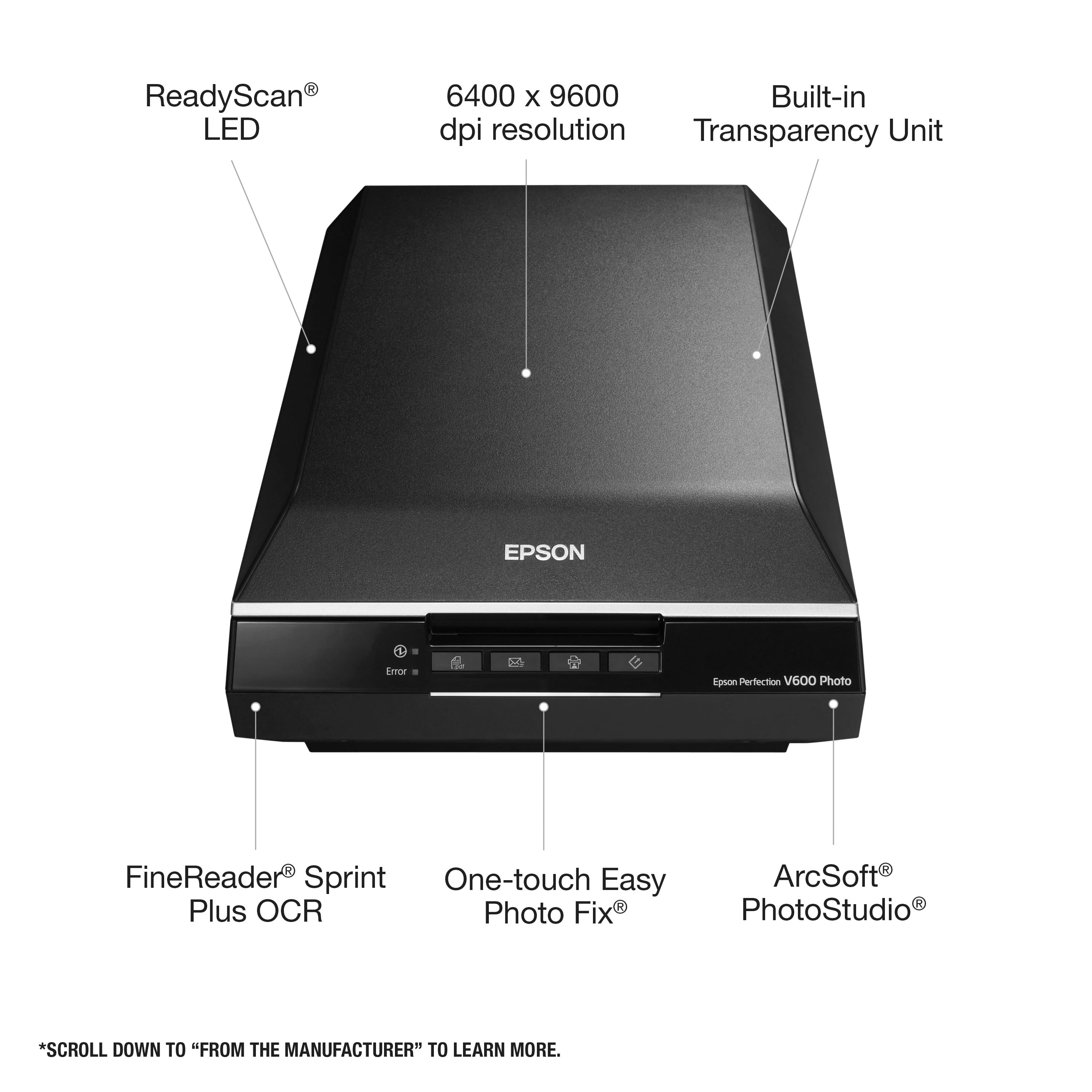 Epson Perfection V600 Photo Color Scanner, 6400 x 9600 dpi, Black: 6400 x 9600 dpi resolution Powerful Digital ICE technology Built-in transparency unit Four customizable buttons ReadyScan LED light source Advanced software bundle Model number: B11B198011 Produce up to 17″ x 22″ scans 1-touch color restoration Correct dust, scratches on film, tears or creases on photo prints Scan 35 mm film, slides, negatives and medium-format panoramic film Scan, copy, scan-to-email and create PDFs Photo color scanner produces sharp, vivid reproductions Color: Black