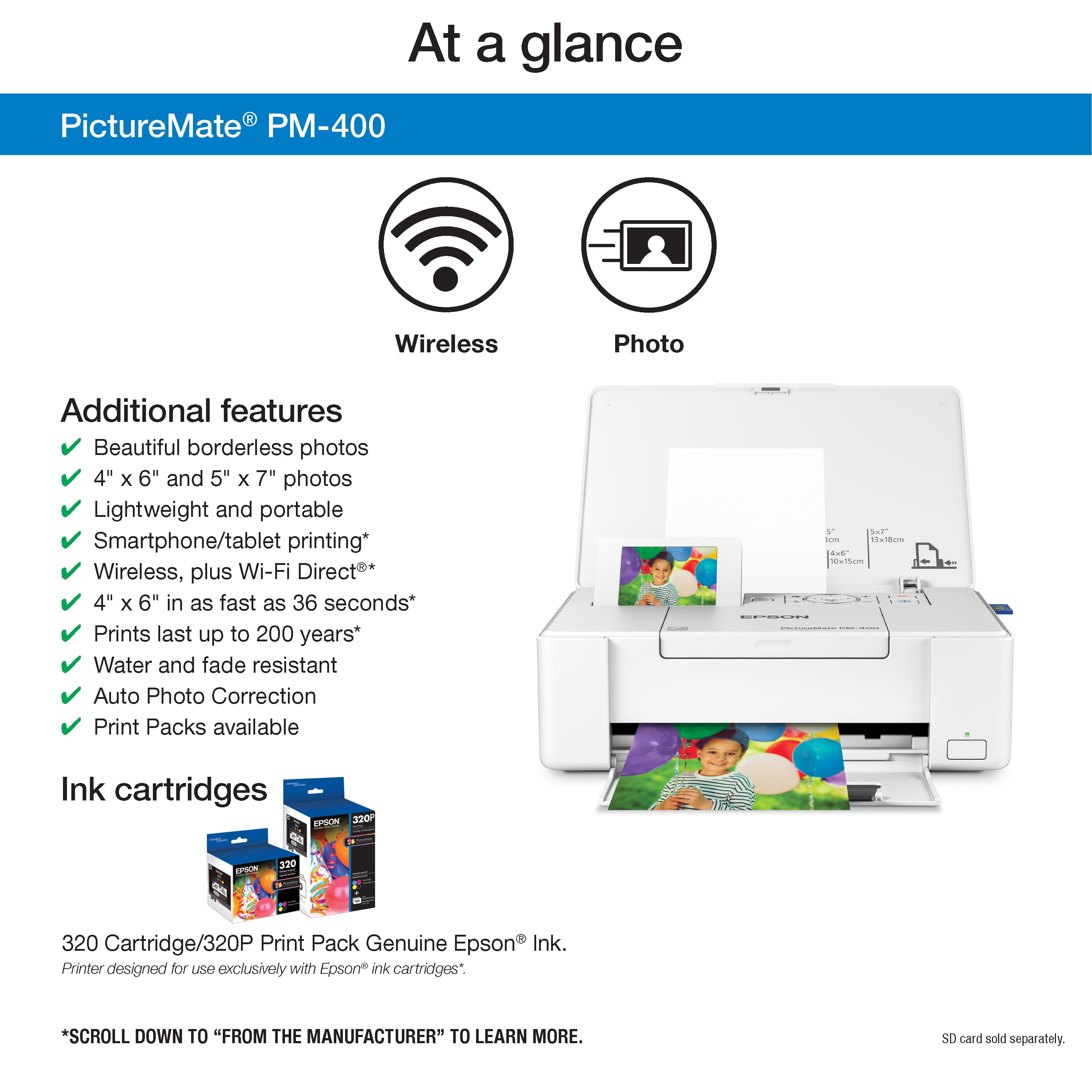 Quickly share that special moment â at family gatherings, parties and more â with the compact, portable PictureMate PM-400 wireless photo printer. This lightweight printer delivers beautiful borderless 4″ x 6″ and 5″ x 7″ photos. Featuring wireless printing, plus Wi-Fi Direct®1, it prints from your iPad®, iPhone®, tablet or smartphone2. Use the 2.7″ color display to preview photos. The PM-400 prints 4″ x 6″ photos in as fast as 37 seconds3. Get stacks of photos with convenient Print Packs (includes ink cartridge and 100 sheets of 4â x 6â photo paper). Photos are smudge, scratch, water and fade resistant4 and last up to 200 years5.