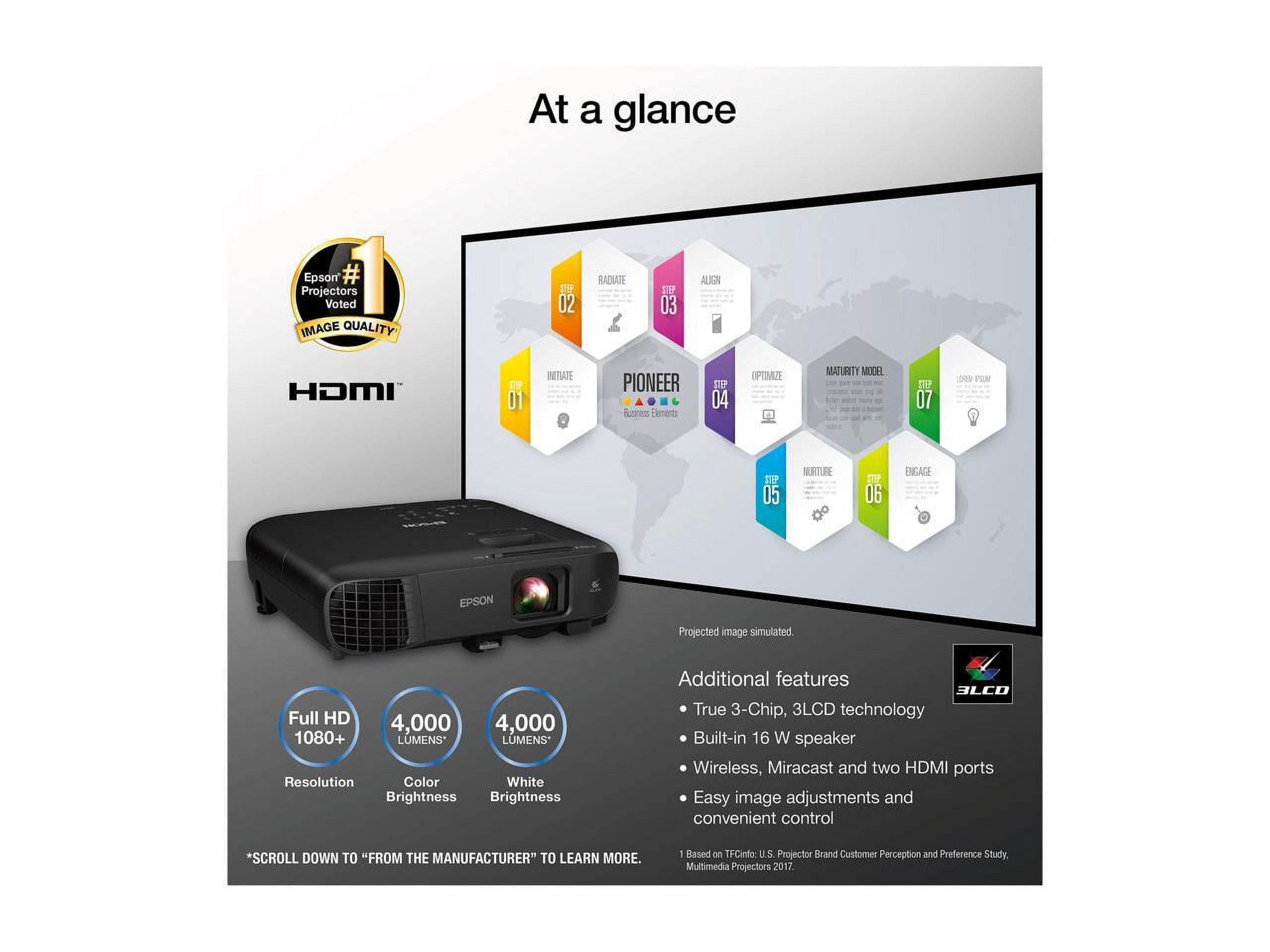 1. Amazing brightness — 4,000 lumens of color and white brightness1 ideal for displaying large-group presentations, spreadsheets and videos, even in well-lit rooms 2. Stunning image quality — amazing Full HD 1080p resolution delivers crisp text and images; perfect for displaying professional-quality presentations, video and more 3. True 3-Chip 3LCD technology — displays 100% of the RGB color signal for every frame, providing outstanding color accuracy while maintaining excellent color brightness, without any distracting “rainbowing” or “color brightness” issues seen with other projection technologies