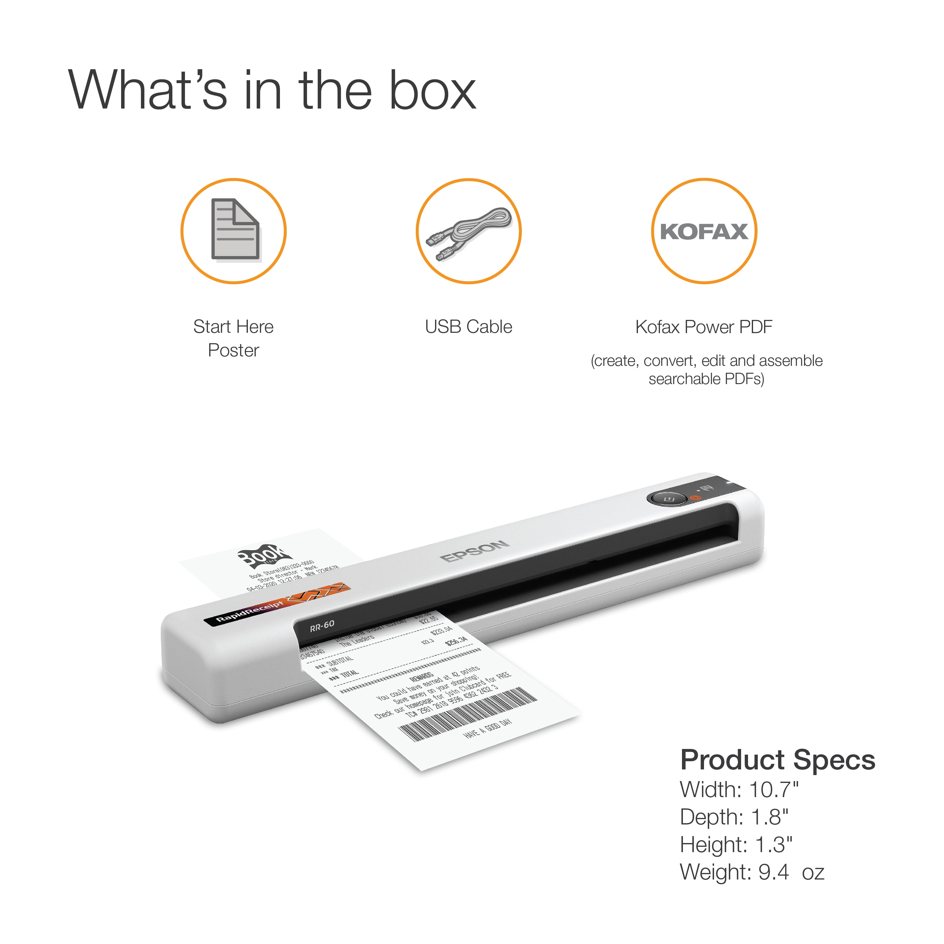 Ultra small and lightweight receipt scanner designed for managing receipts and invoices. The smallest and lightest mobile single-sheet-fed document scanner in its class, the Epson RapidReceipt RR-60 was specifically designed to quickly scan invoices and receipts of varying sizes, then automatically and accurately process the information into digital assets. With the included Epson ScanSmart financial software, you can turn unorganized receipts and invoices into categorized digital data that easily integrates into applications such as QuickBooks, TurboTax and more. Plus, you can create searchable/editable PDFs with the included bonus software.