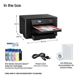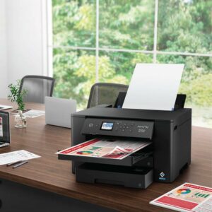 Enhance office productivity with the high-powered WorkForce Pro WF-7310. A high-performance, wide-format printing solution, the WorkForce Pro WF-7310 delivers print-shop-quality graphics up to 13″ x 19″ and borderless up to 11″ x 17″. Offering fast print speeds, this efficient printer streamlines workflow at an astounding 25 black/12 color ISO ppm ( ). Designed with durability and reliability in mind, the WorkForce Pro WF-7310 features PrecisionCore Heat-Free Technology and DURABrite Ultra instant-dry pigment inks to quickly and consistently deliver crisp, vibrant prints with sharp text and vivid colors. The perfect choice for fast, efficient printing, the WorkForce Pro WF-7310 easily tackles high-volume print jobs with two 250-sheet trays, a rear feed and Wi-Fi 5 compatibility (1). Plus, with the Epson Smart Panel App (2), you can conveniently manage printer workflow from your smart device (3).
