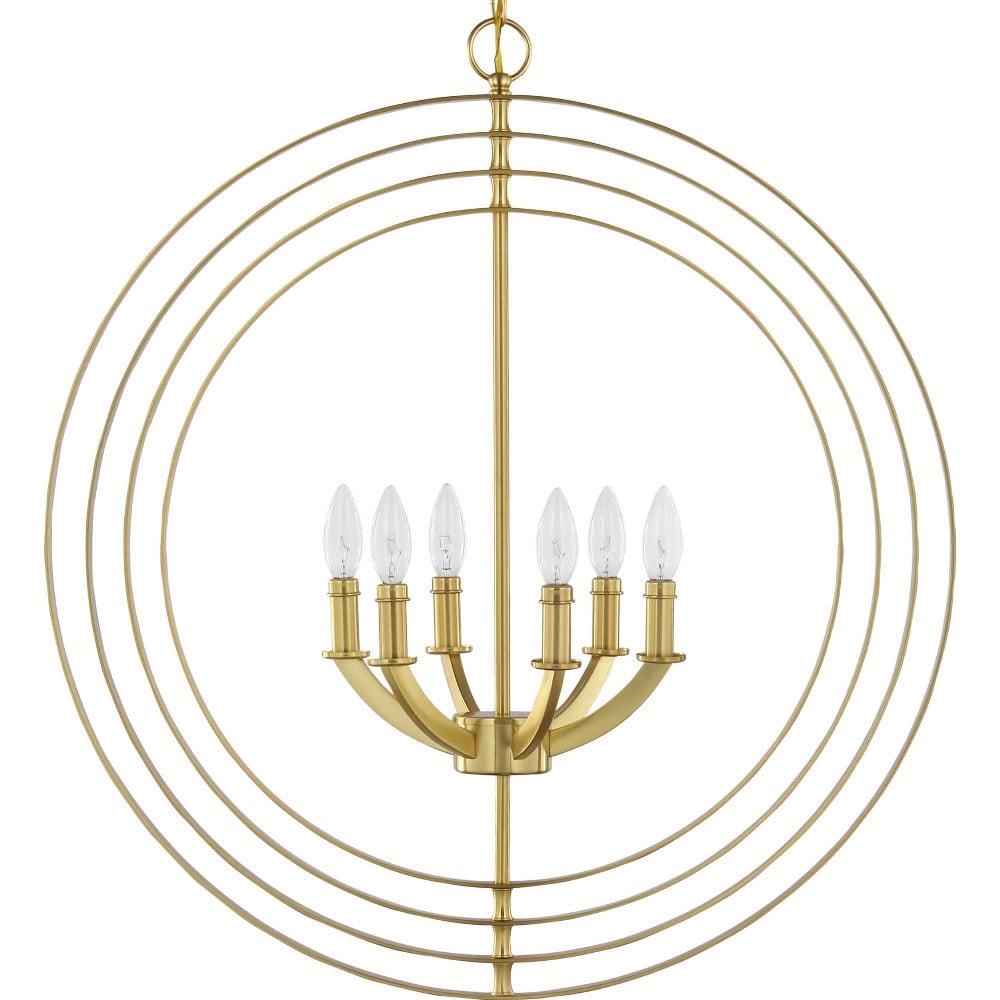 Inspired by ancient astronomy armillary spheres, the interlocking rings pivot for an infinite variety of positions. Six-light chandelier pendant in Antique Bronze is ideal for installations over a farmhouse table, dining room setting or kitchen island.