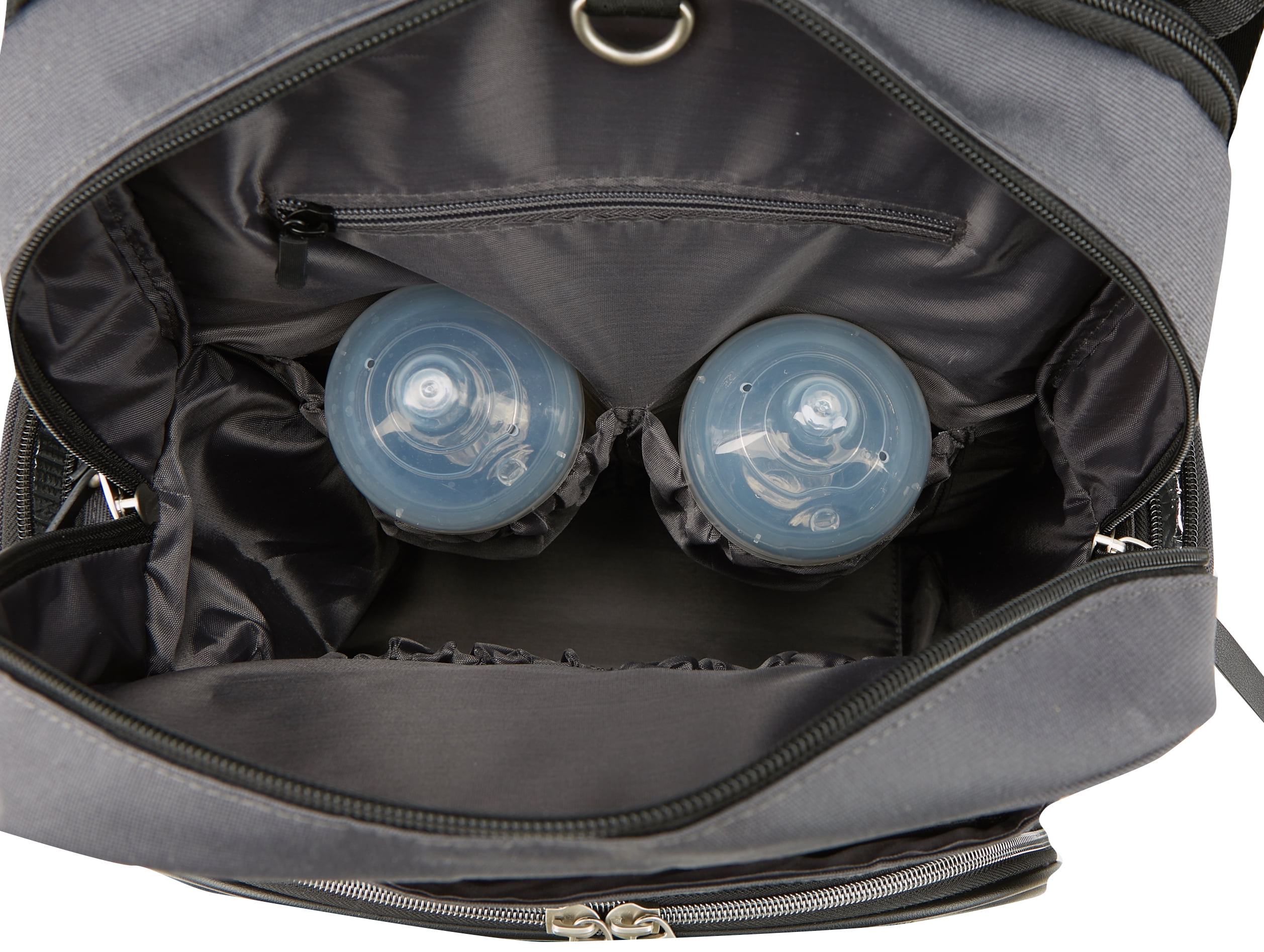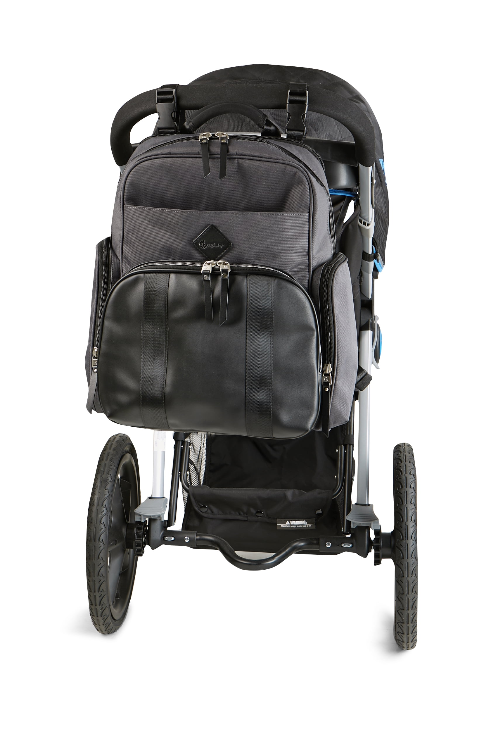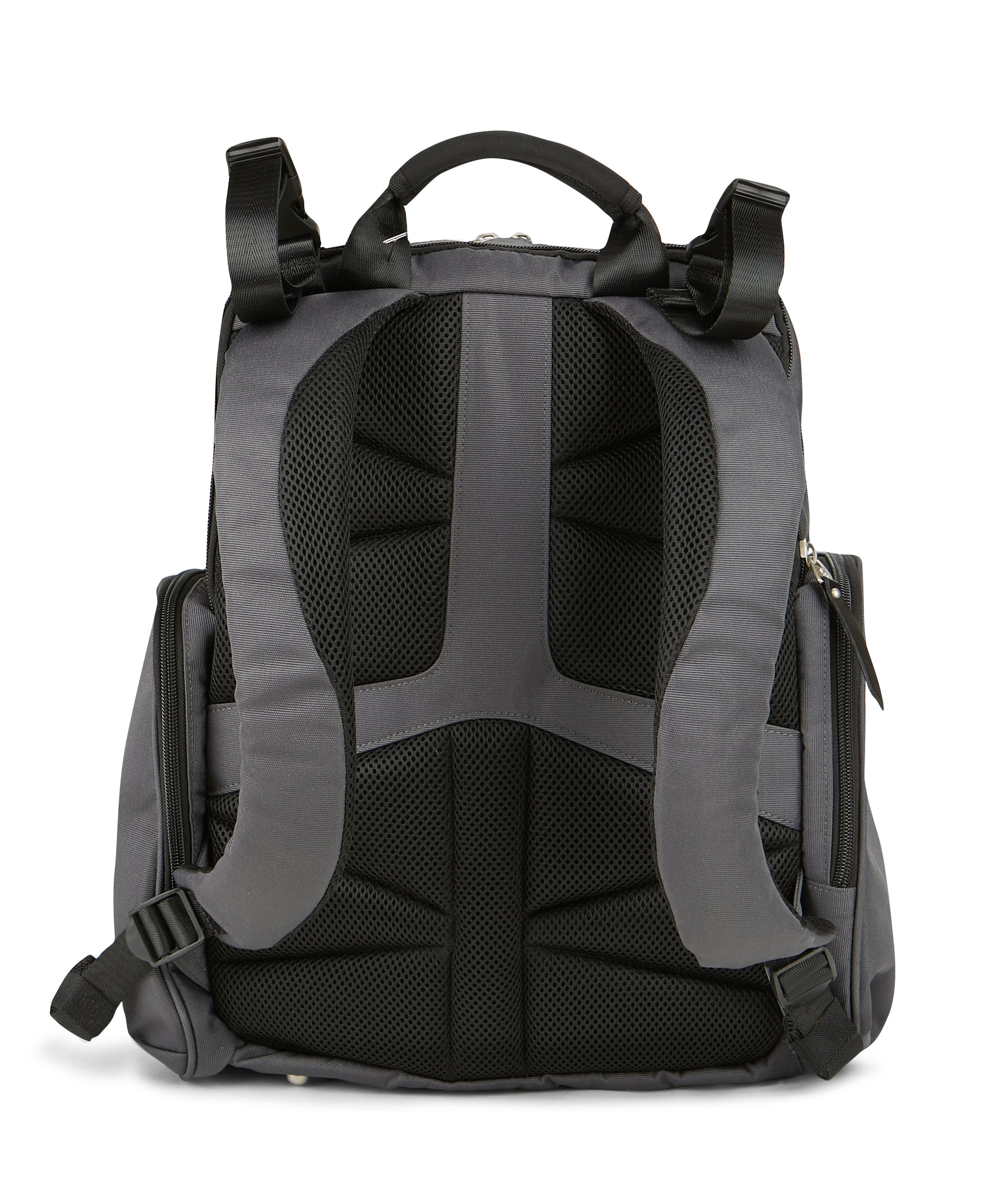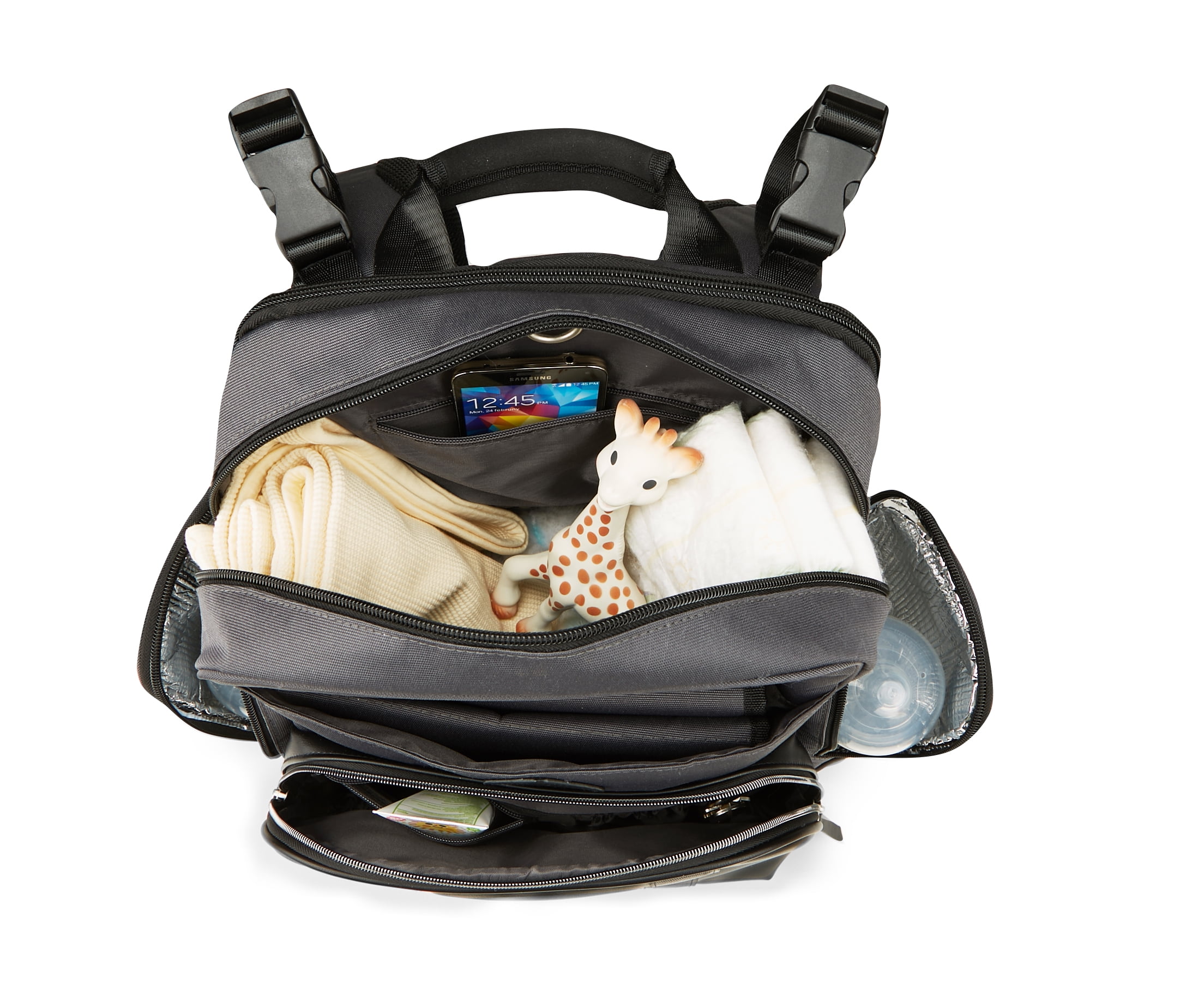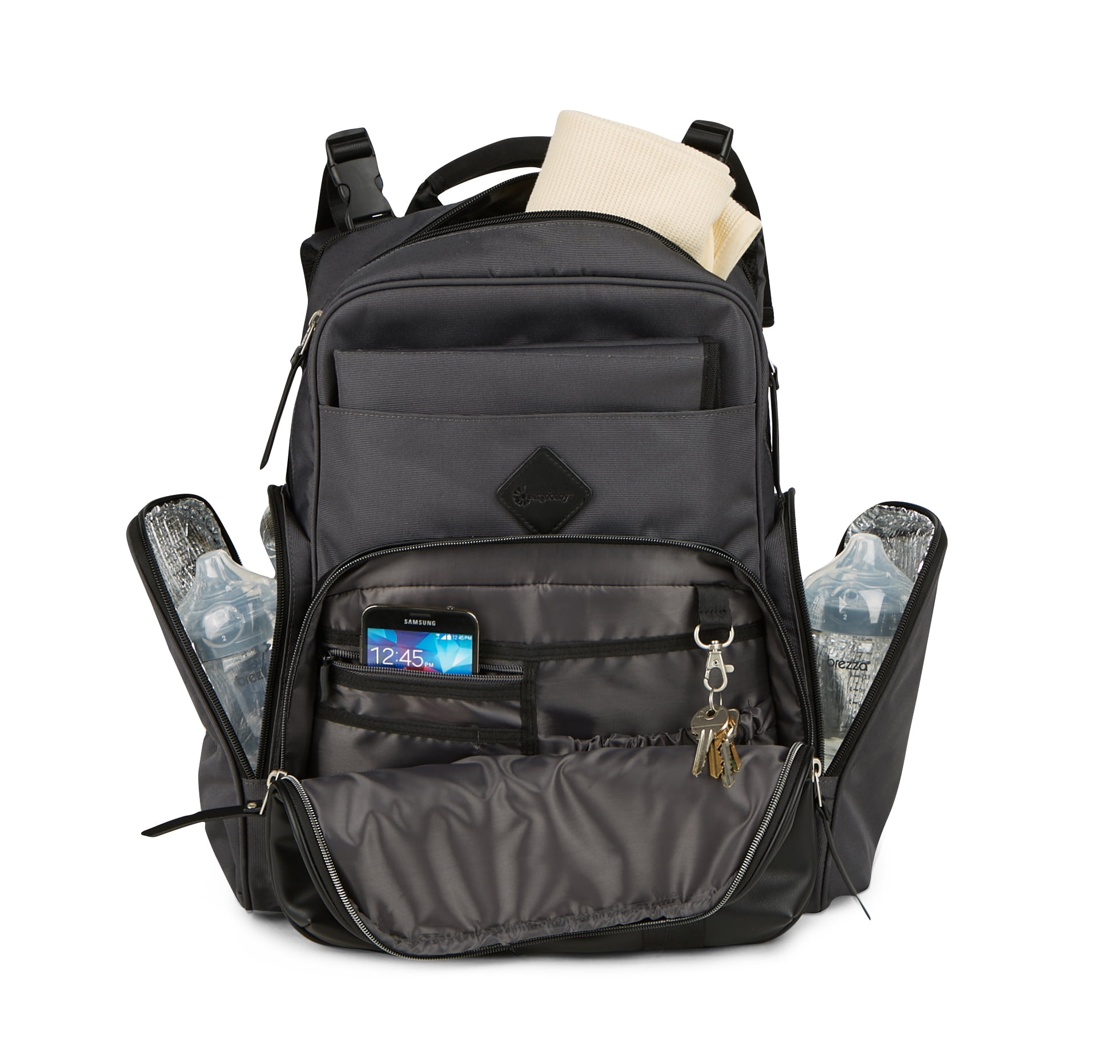 Features 13 pockets, including two exterior insulated pockets for bottles or food storage The front zipper compartment offers quick access to personal items Water-repellent fabric wipes clean and provides a resilient barrier to rain and other types of precipitation Adjustable, padded shoulder straps and a soft, neoprene top handle offer carrying comfort Padded, mesh back panel shaped to improve airflow and keep you cool Stroller loops can be adjusted for travel convenience Includes water repellant changing pad for easy diaper changes on the go