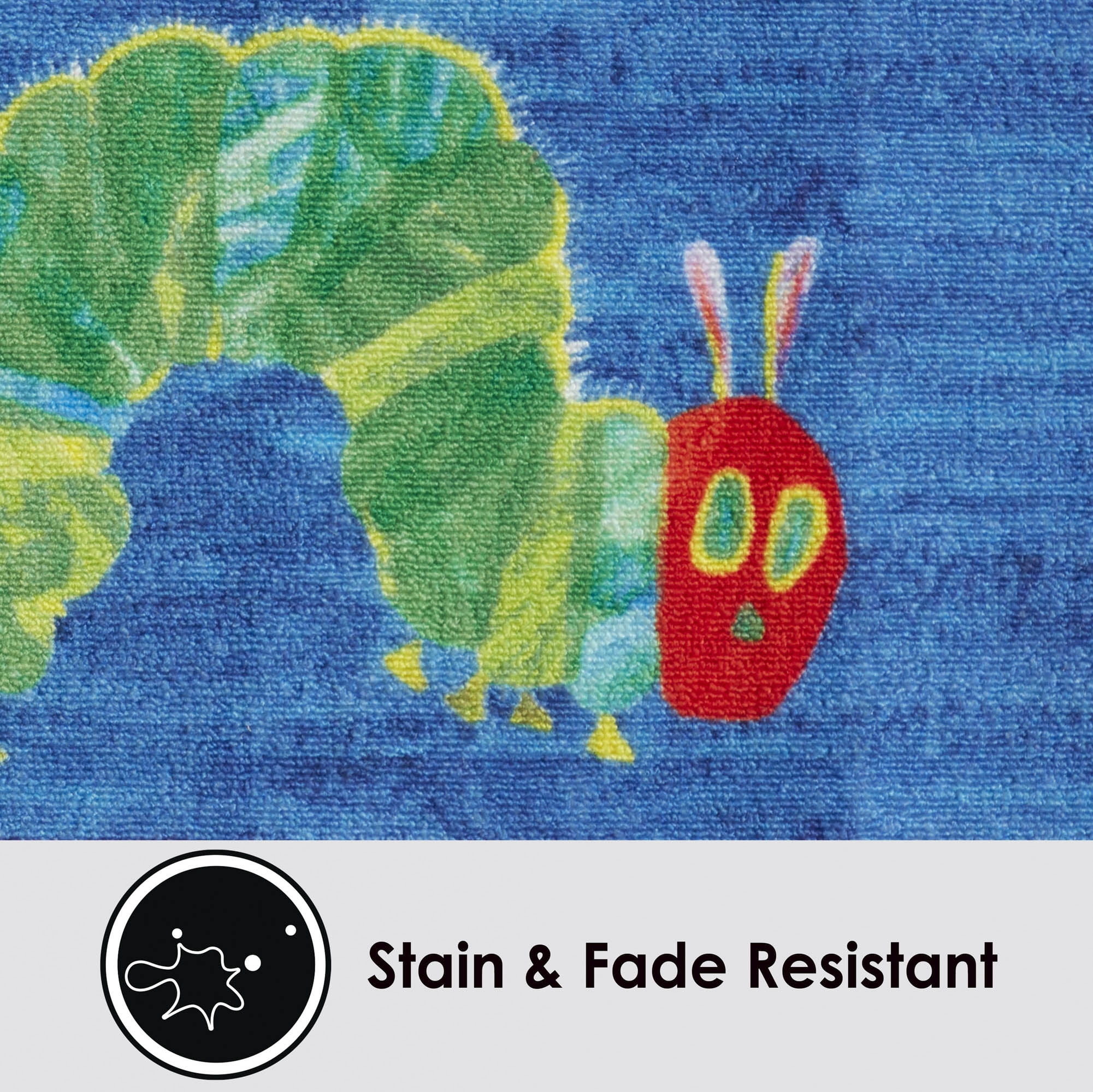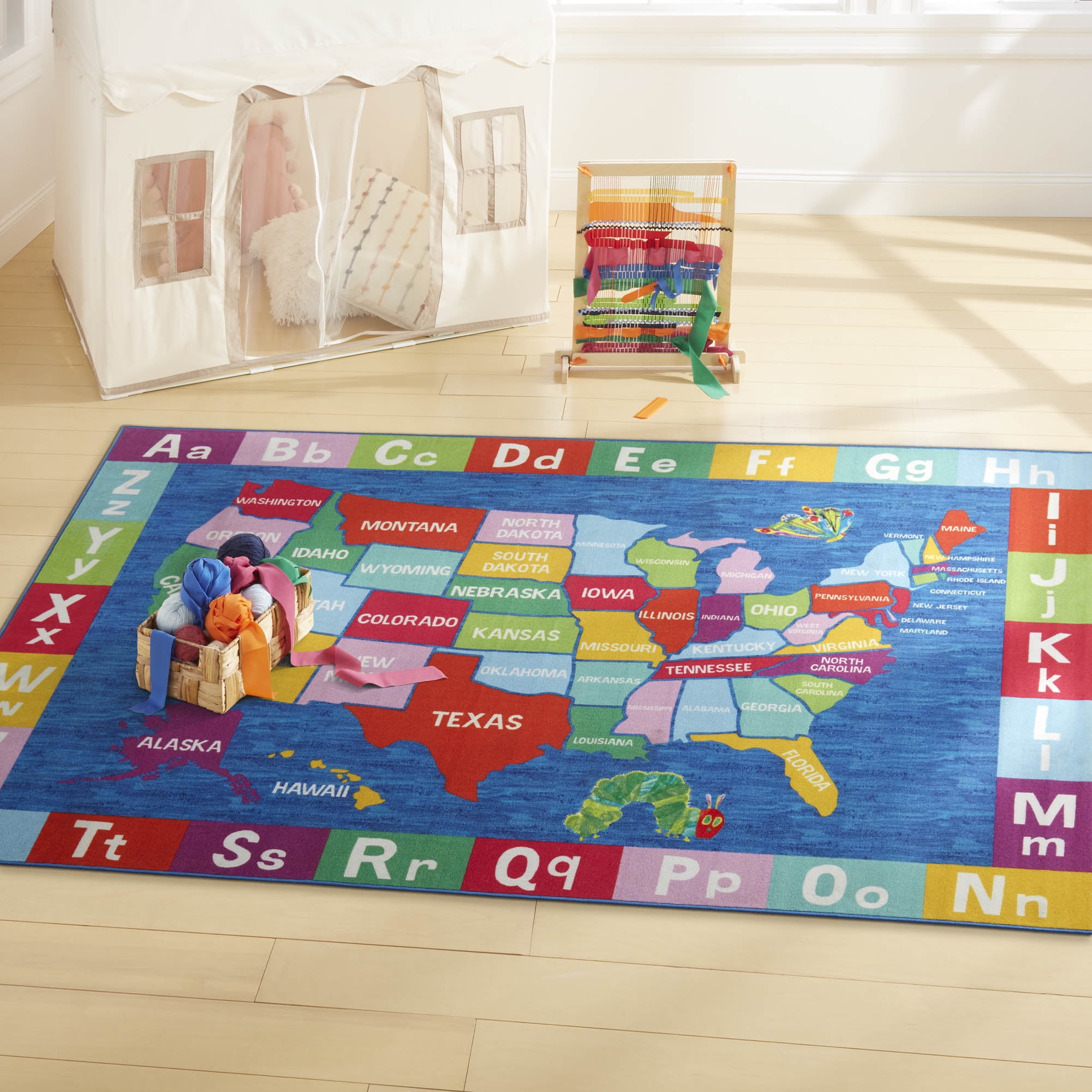Brighten your children’s room with the colorful illustrations of the Eric Carle Elementary USA Map rug by Home Dynamix. Carle’s vibrant and cheerful artwork from the bestselling book, “The Very Hungry Caterpillar”, is brought to life with this fun rug featuring a USA map and an alphabet border, making it a perfect addition to any playroom or classroom. It’s made of machine washable polyester for easy care. A non-skid latex backing helps to keep the rug in place so children can play safely.