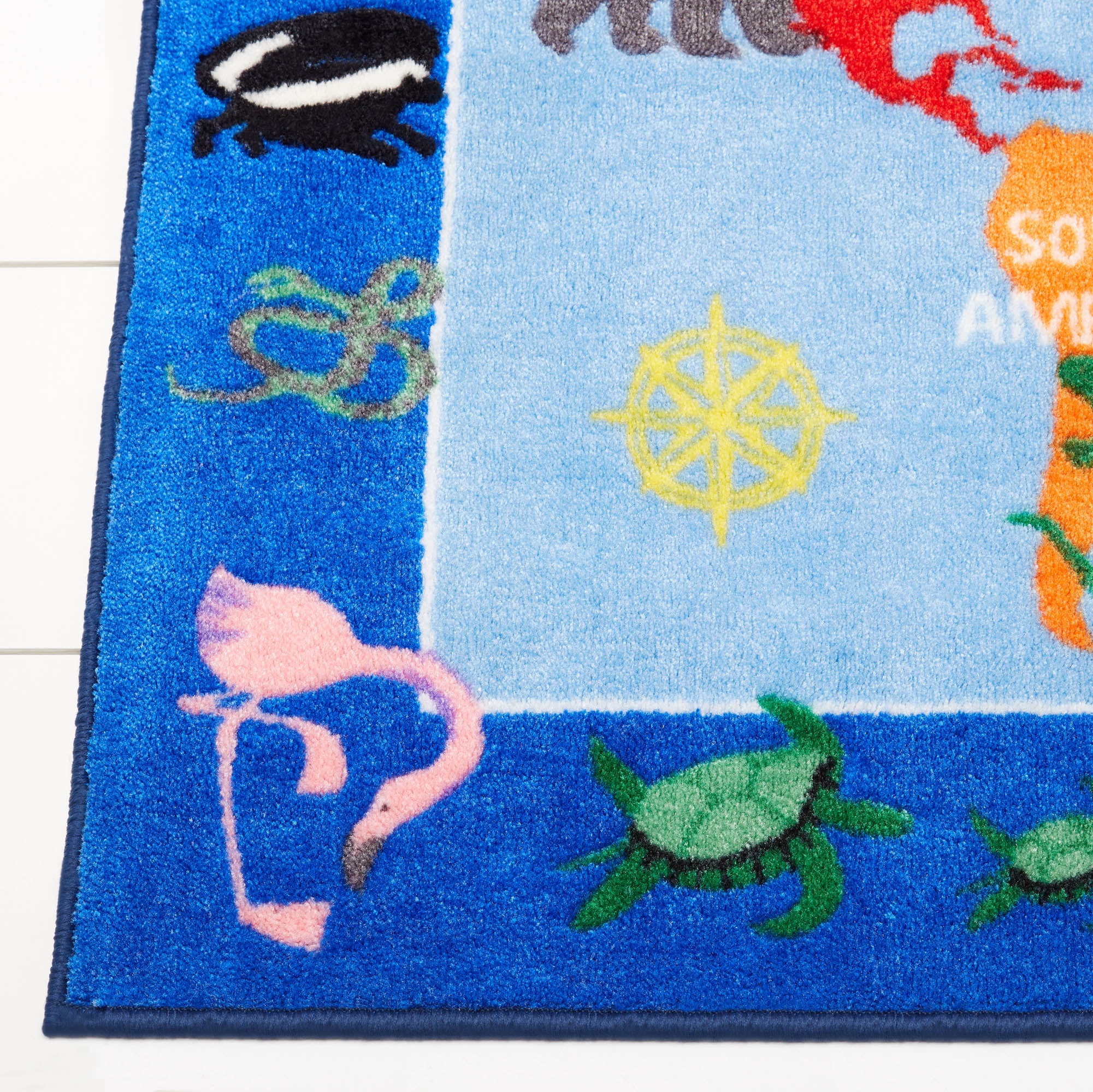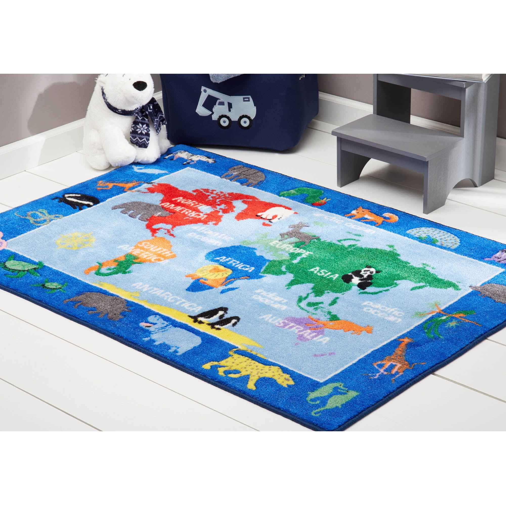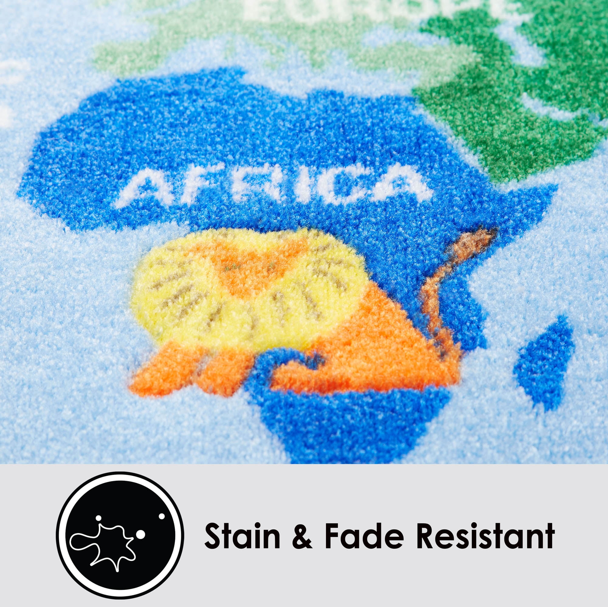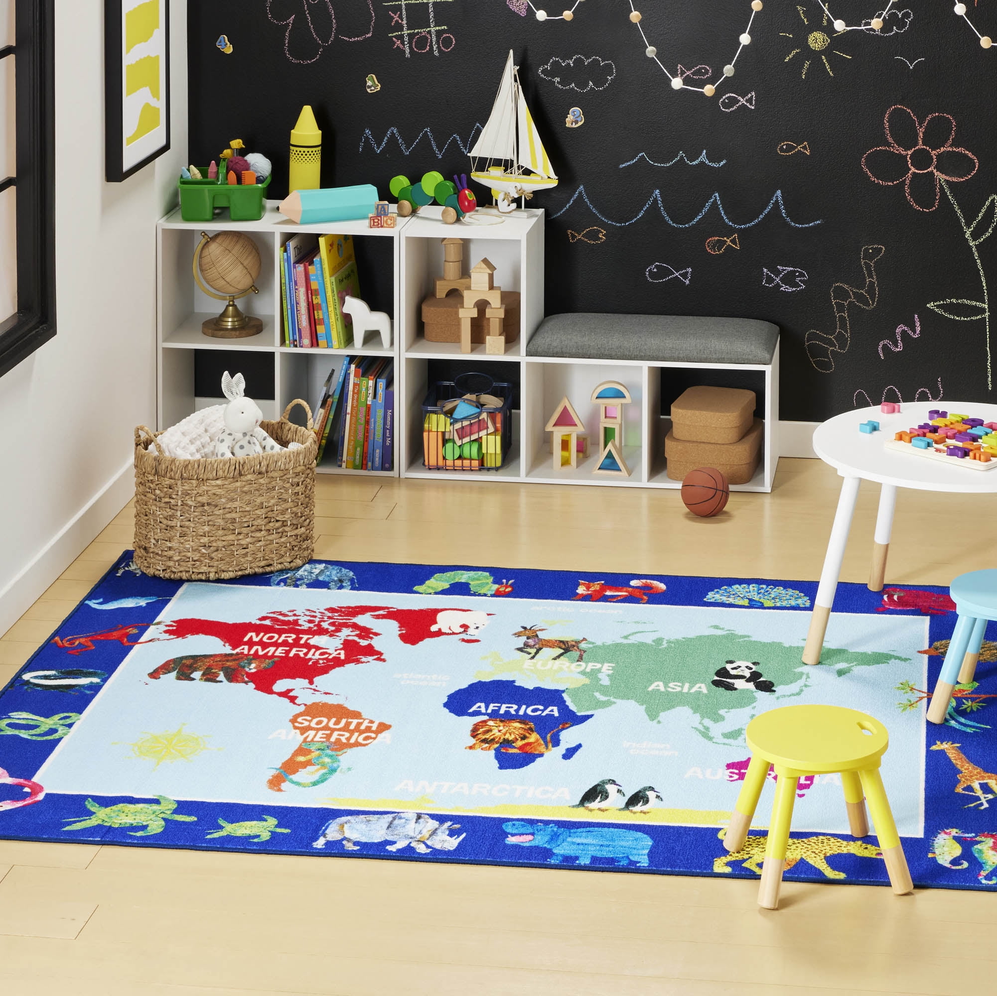 CHEERFUL & EDUCATIONAL: The Eric Carle Elementary World Map rug by Home Dynamlx brings the artist’s cheerful and educational illustrations to life. It features a world map with a border of friendly animals in bright shades of blue, red and green. AVAILABLE IN A VARIETY OF AREA RUG SIZES: 2 x 4 rugs, 4 x 6 rugs and 7 x 10 rugs. WELL-CRAFTED WITH NON-SKID BACKING: Made with 100% polyester yarns in a power-loomed construction, this durable, decorative rug is designed to last. A non-skid latex backing prevents slipping and sliding so children can play safely. IDEAL FOR CHILDREN’S ROOMS: This colorful design is stain resistant, making it ideal for children’s bedrooms, playrooms, and classrooms. EASY CLEAN & LOW MAINTENANCE: This easy-clean rug is machine washable, so there’s no need to worry about stains and spills.