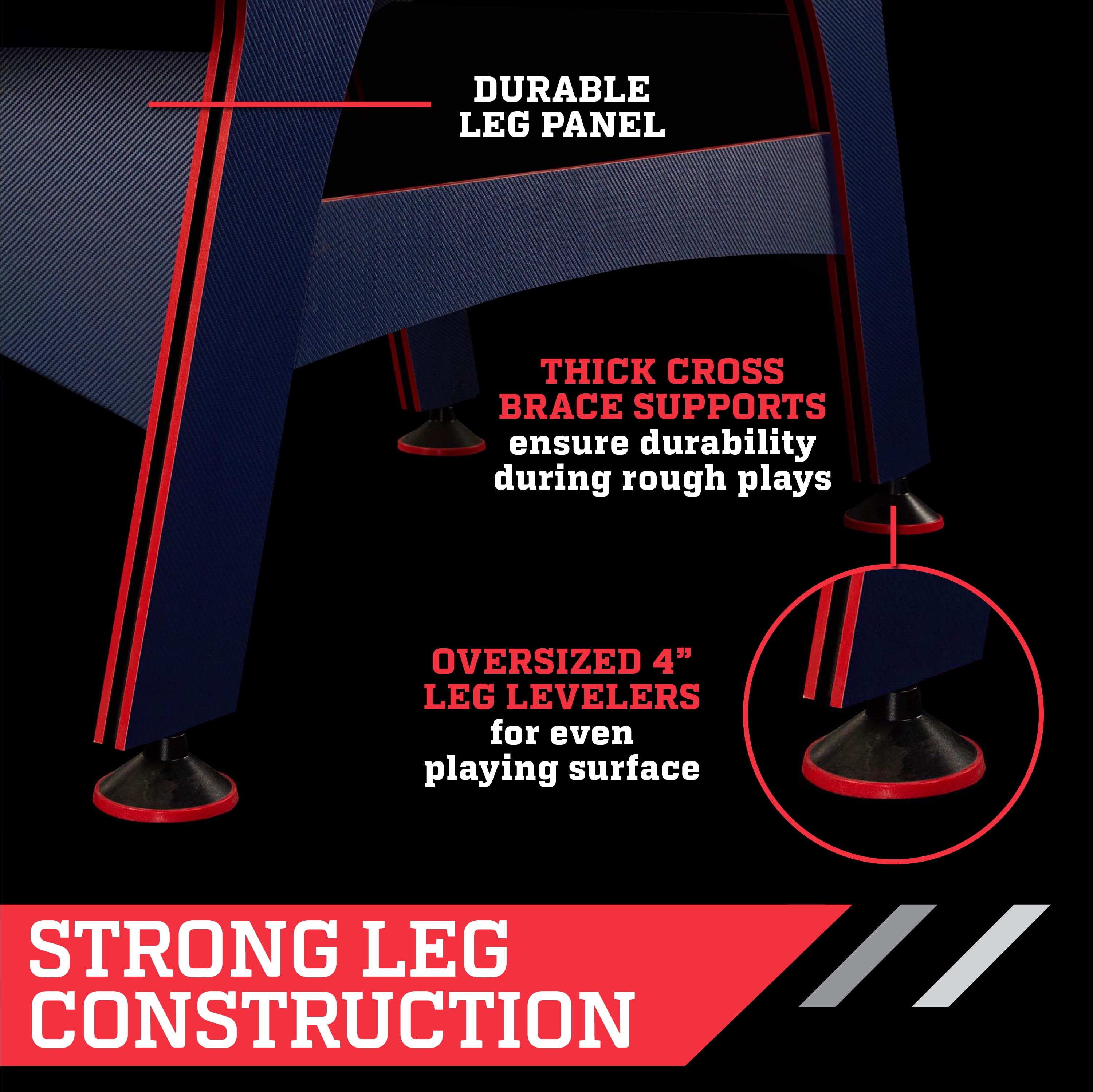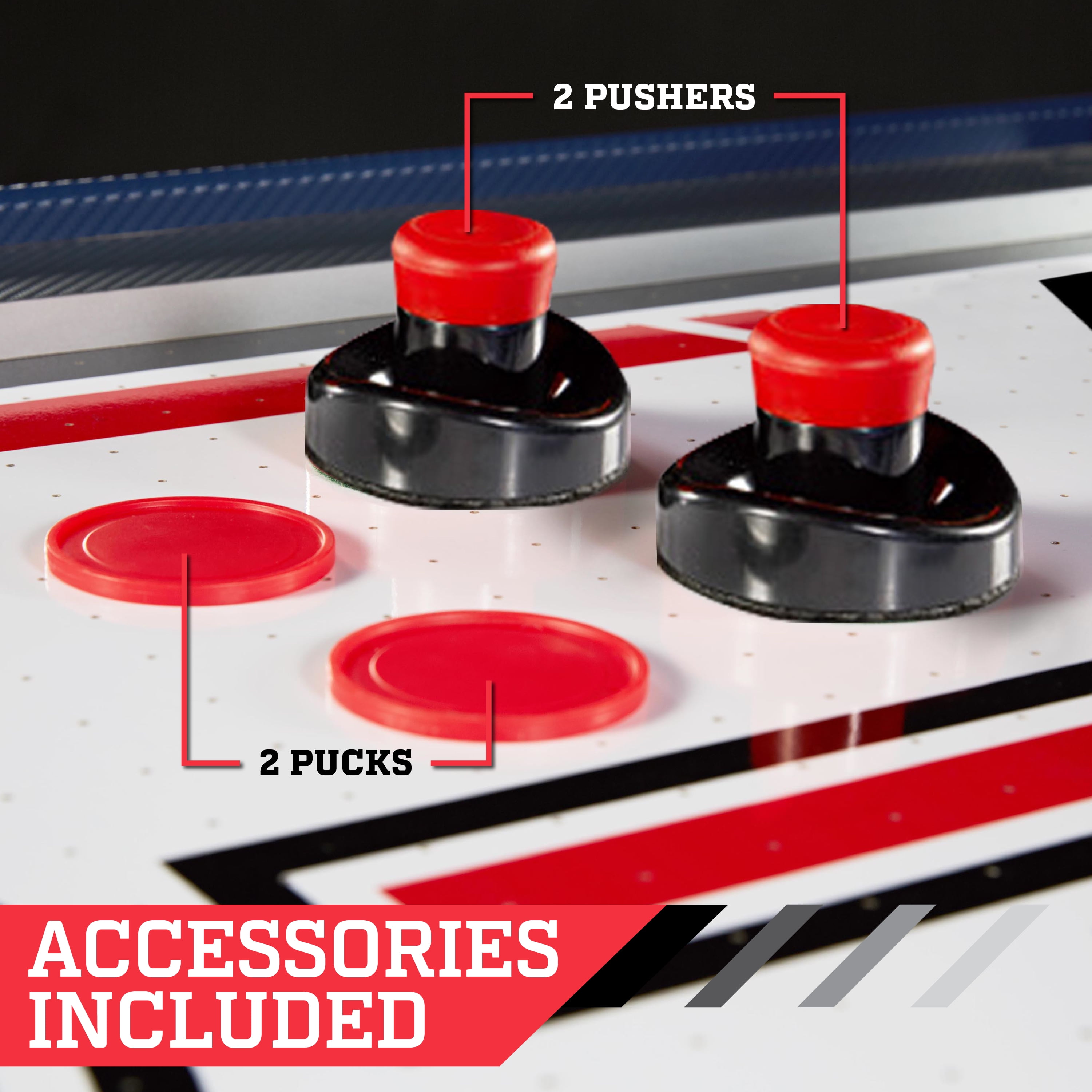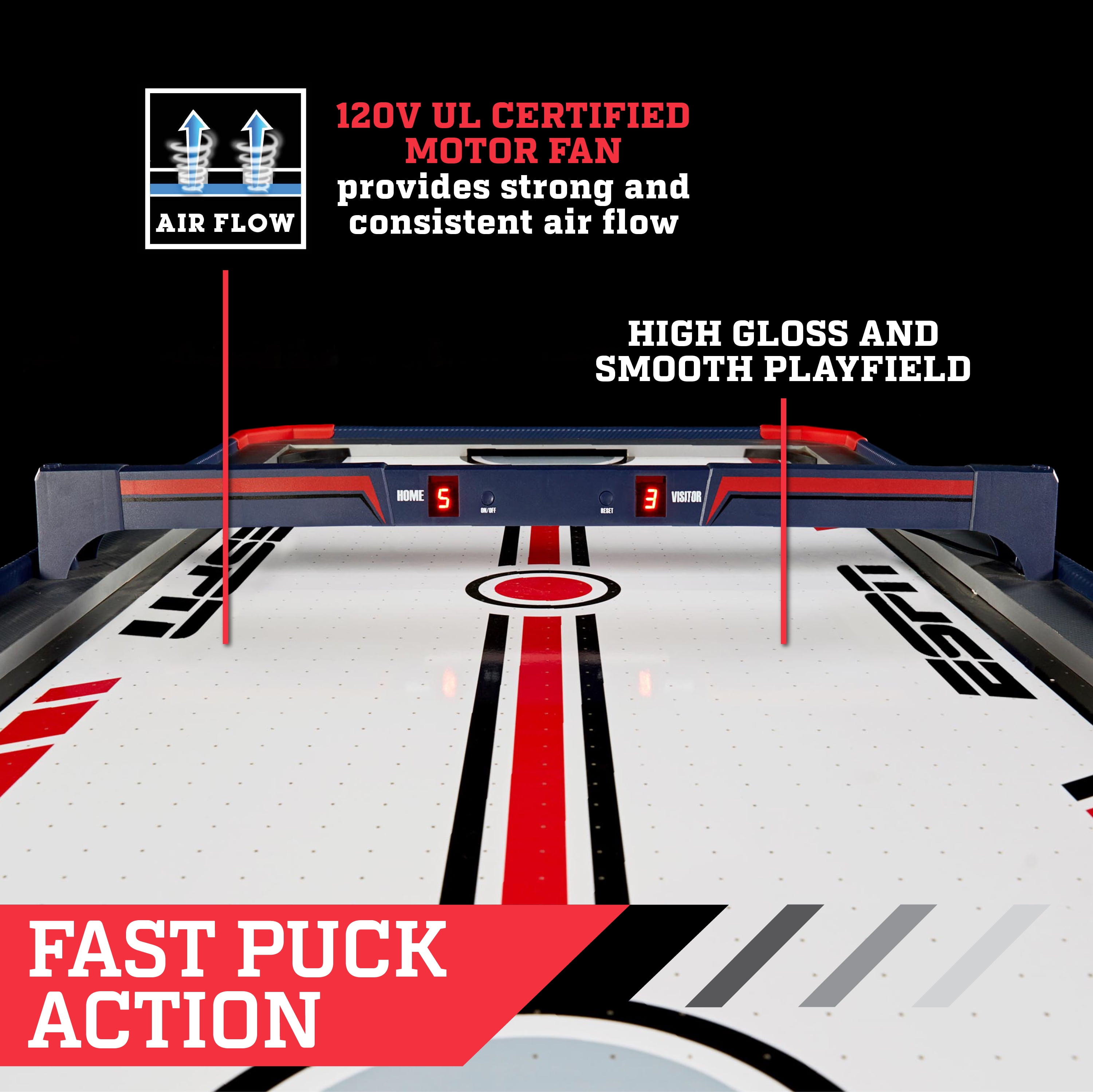 The ESPN 60″ x 32″ x 32″ Air Powered Hockey Table with Overhead Electronic Scorer is perfect for a game room in your home or basement; enjoy some competition with your friends or family at any event, party, or gathering. This air hockey table has all the necessary accessories for the best arcade game fun, including two pucks and two pushers for two-player gaming. Includes an LED electronic overhead scorekeeper that spans across the top of the table, so you can quickly see how you’re beating the competition. The table has a UL-certified motor for an even, excellent airflow across the tabletop, allowing the puck to slide easily and swiftly over the surface, straight into your opponent’s goal. The air-powered hockey table has entire panel leg supports with lateral cross braces for optimal durability and oversized leg levelers for improved stability.
