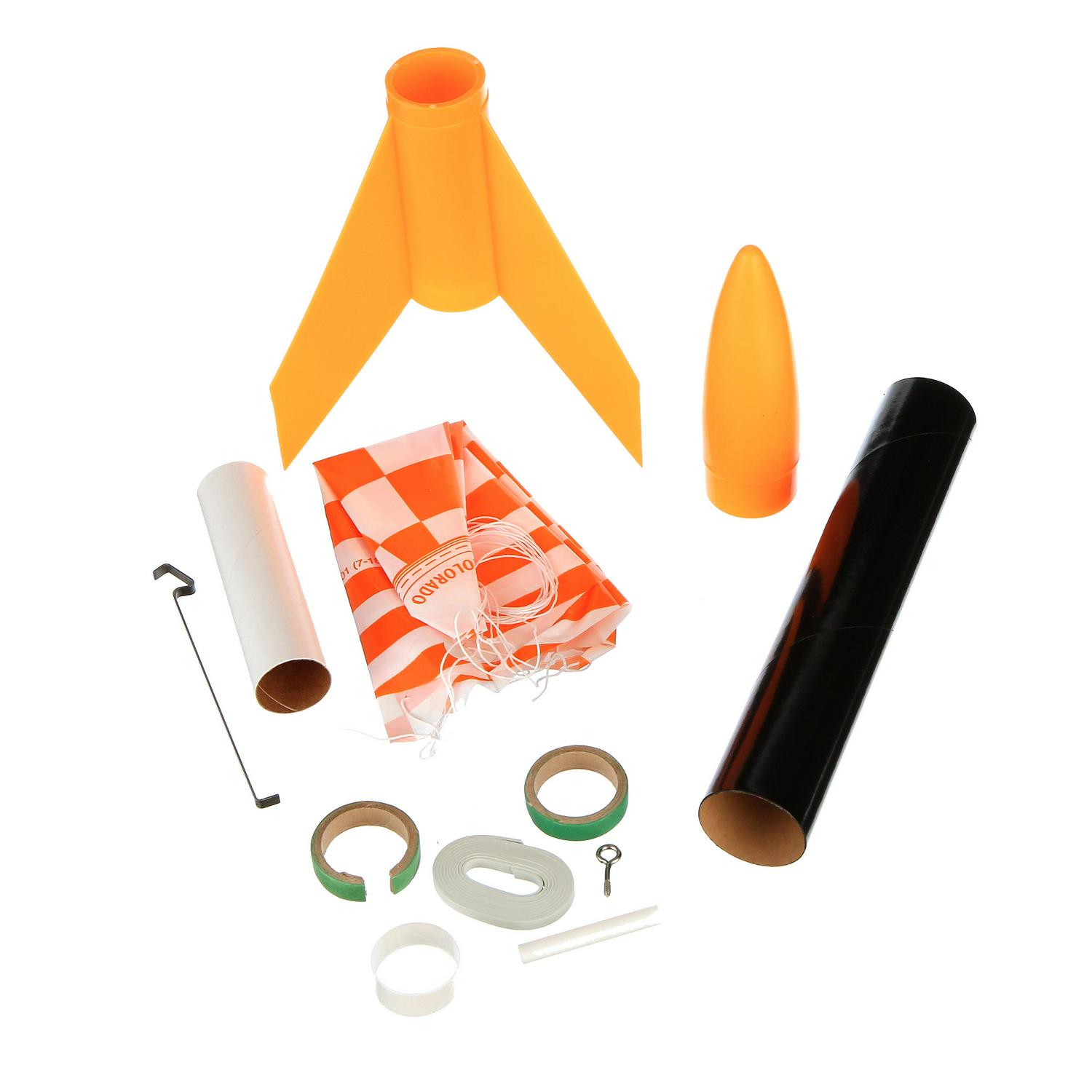 – This jet black rocket has a bright orange plastic nose cone and a one piece plastic fin unit that makes building it almost foolproof